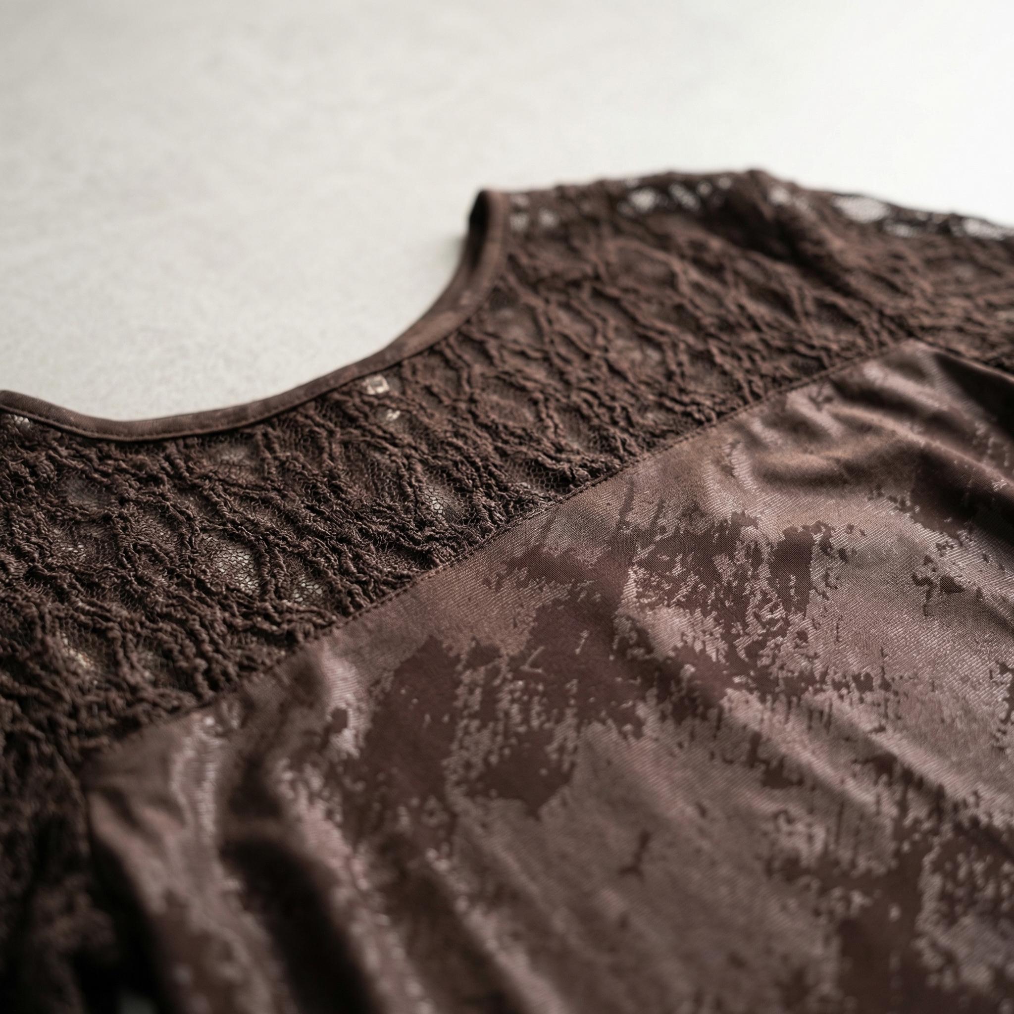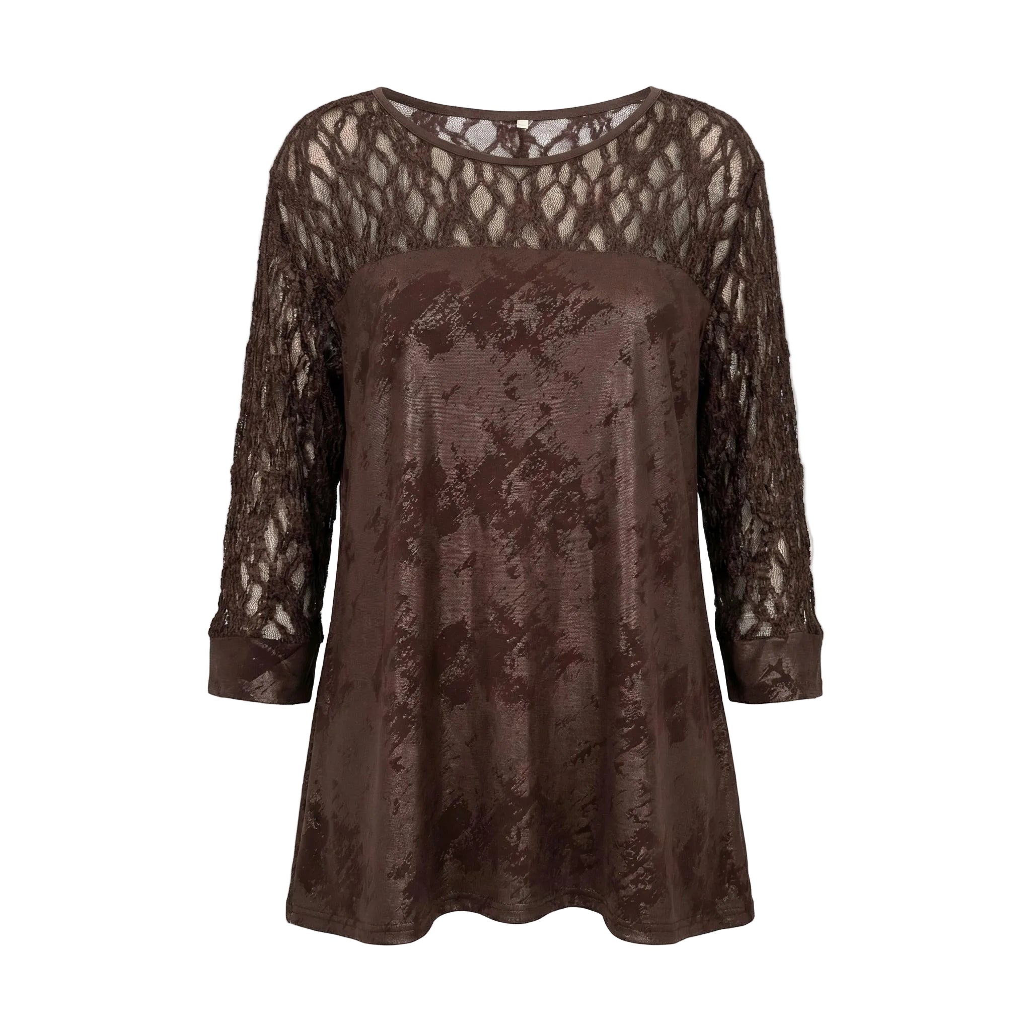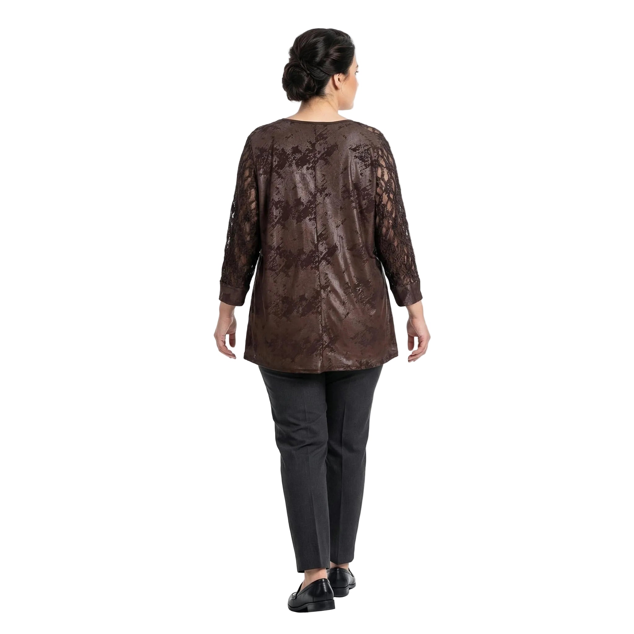 Преобразете визията си с тази елегантна официална макси туника в наситен кафяв цвят, украсена с фина и ефектна дантела. Създадена специално да подчертава женствеността, туниката се отличава с меко падаща, еластична основна материя с деликатен блясък и красив десен. Прозрачната дантелена платка около раменете и ефирните дантелени ръкави придават неподправена изтънченост и стил. Свободната и удобна разкроена кройка с обло деколте осигурява максимален комфорт и грация при всяко движение, правейки този модел идеален избор за сватба, официална вечеря или друг специален повод.