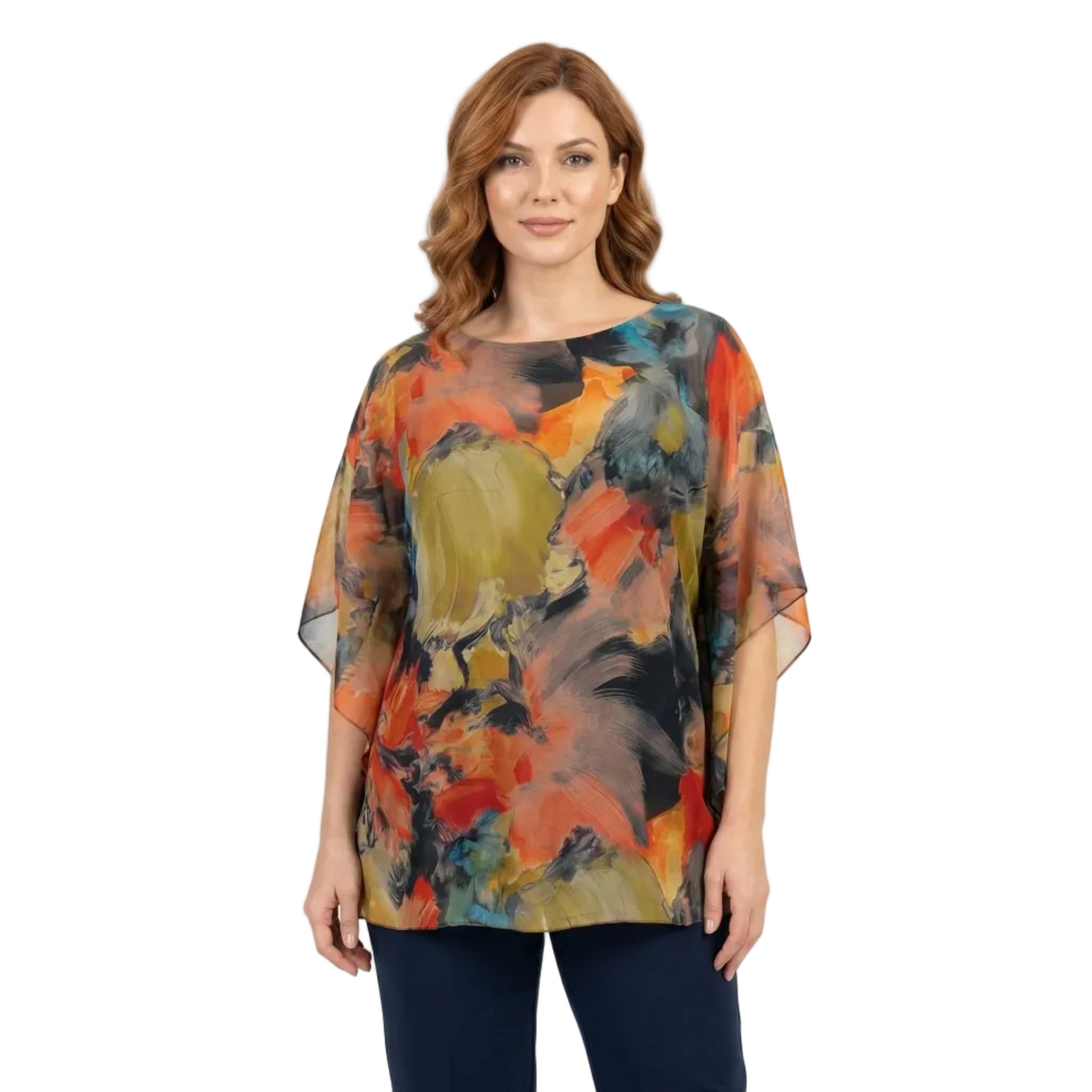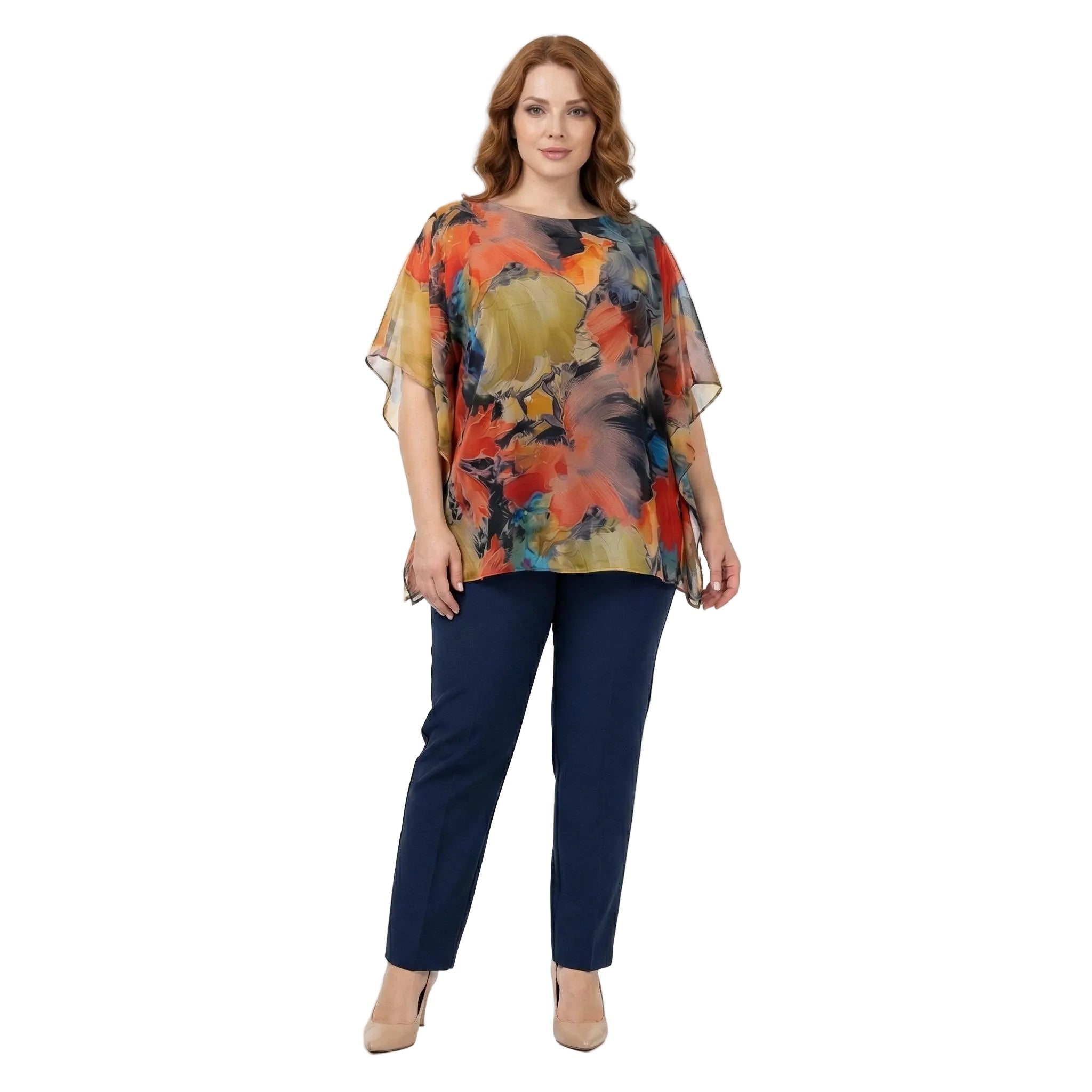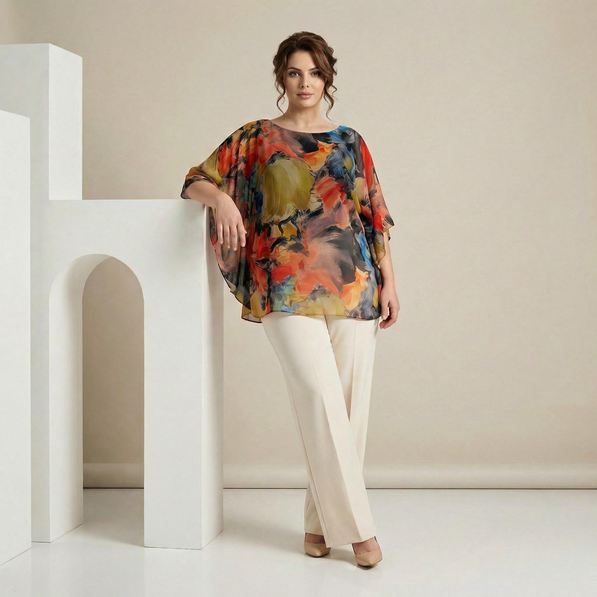 Представяме ви изискана официална макси туника в класически черен цвят, създадена специално за дами, които ценят съчетанието от стил и безупречен комфорт. Този модел впечатлява с горния си слой от ефирен преливащ шифон, който придава лекота, въздушност и грация на всяко движение. Дизайнът включва широки ръкави и елегантно обло деколте, които допълват женственото излъчване. Благодарение на свободната разкроена кройка и меката подплата от еластична материя, туниката осигурява удобство и самочувствие през целия ден. Това е перфектният избор за сватби, кръщенета, юбилеи и всички специални поводи през пролетно-летния сезон.