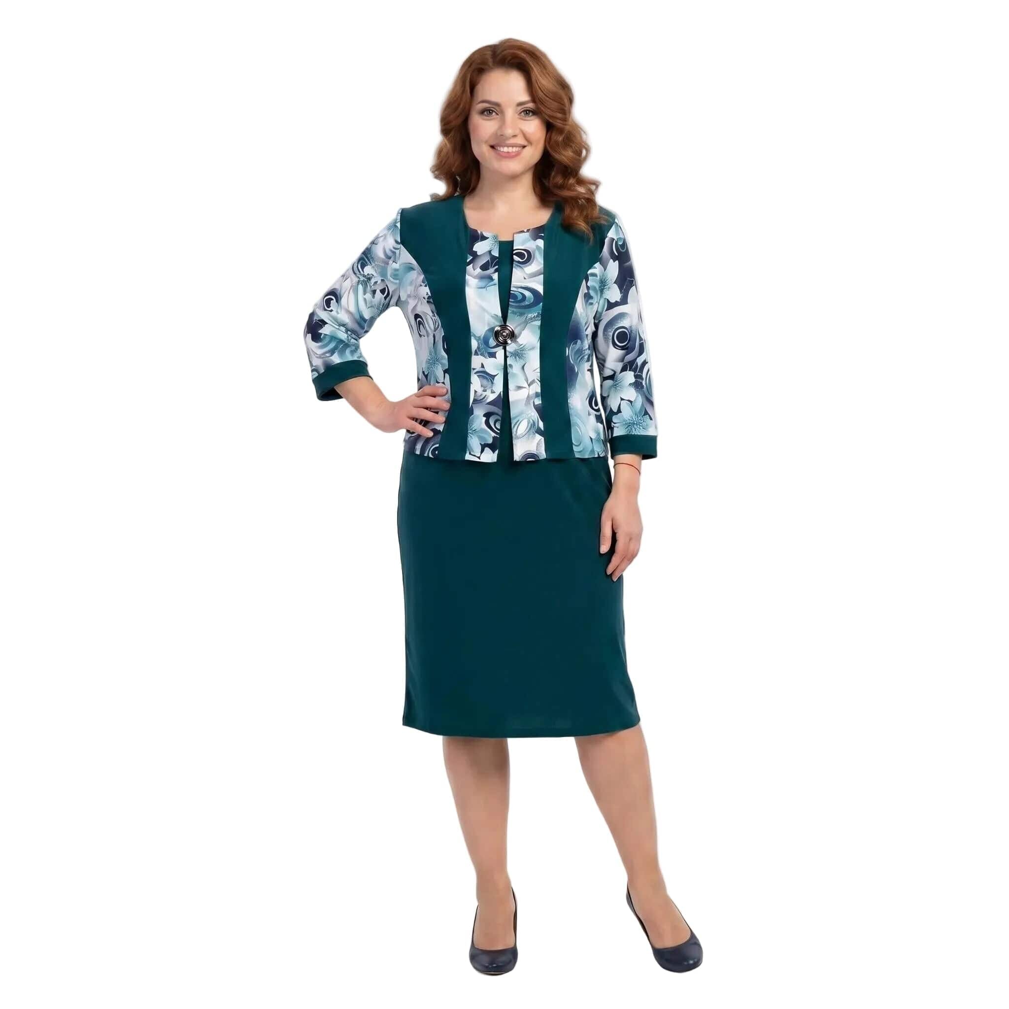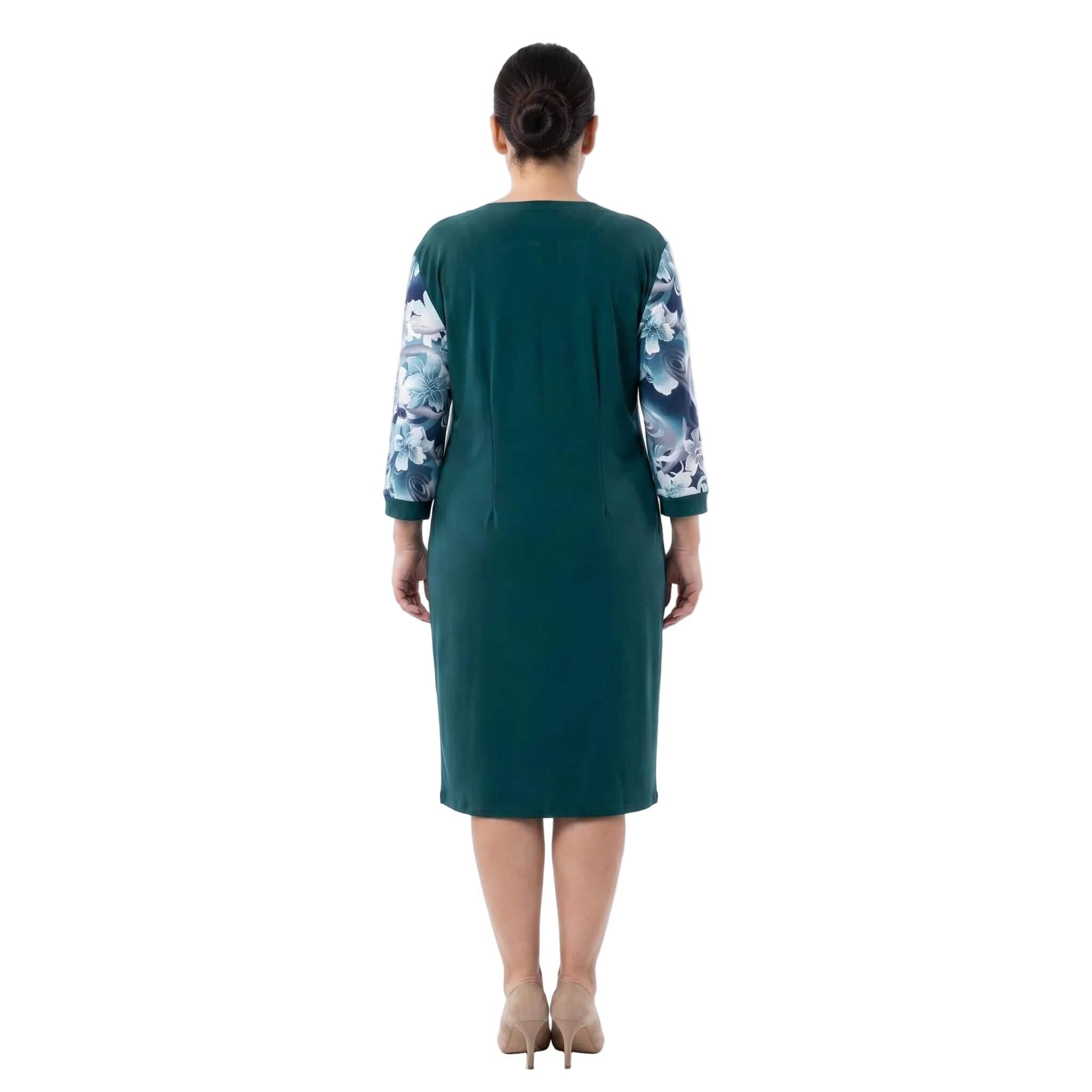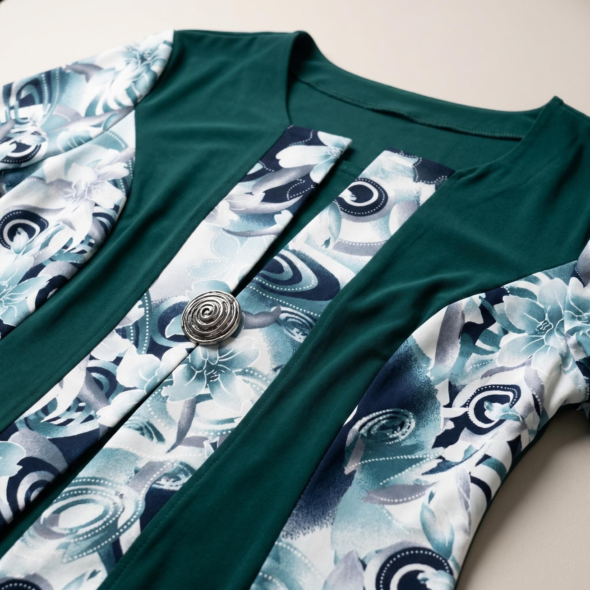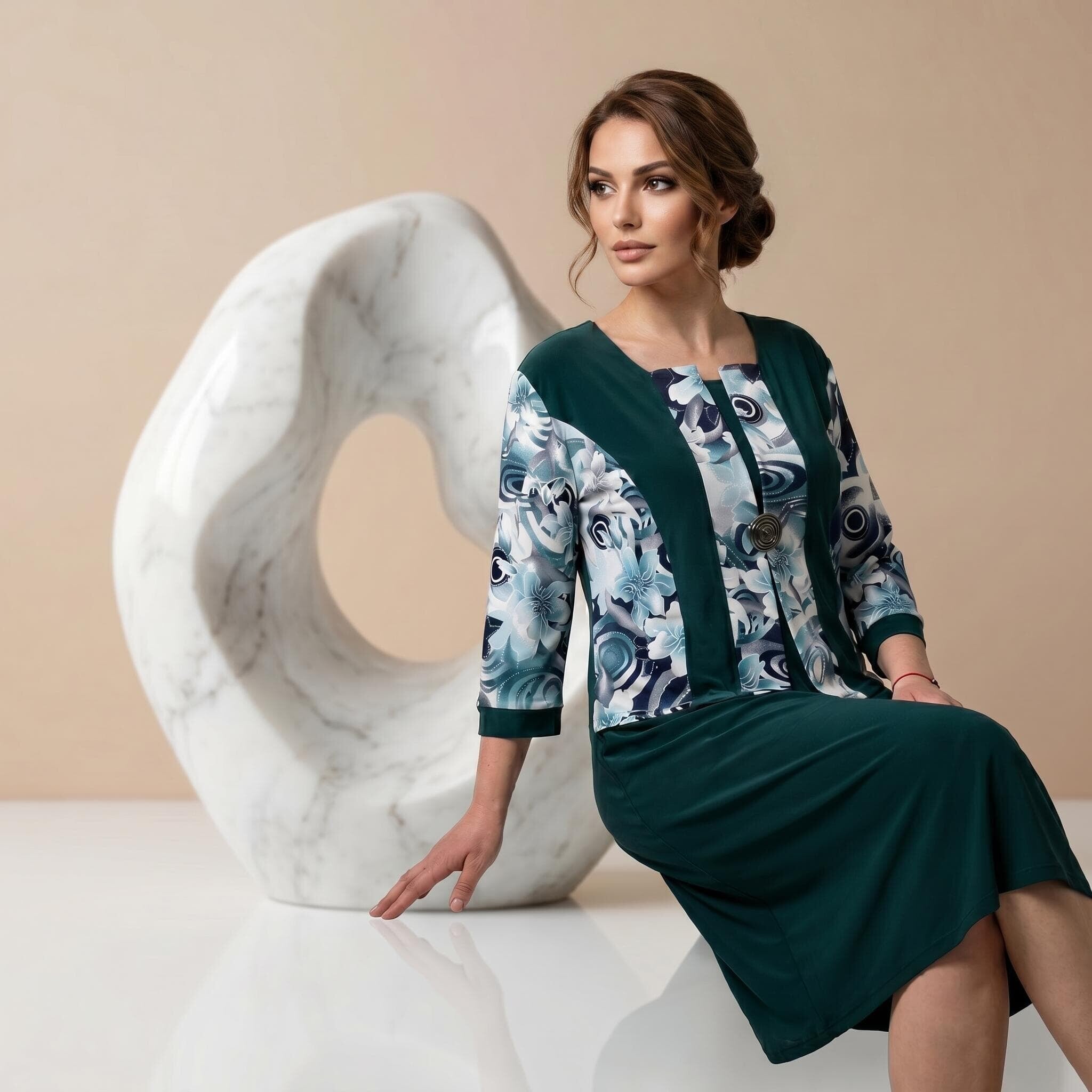 Бъдете кралицата на вечерта с тази великолепна официална рокля в наситен масленозелен цвят. Създадена специално за дами с женствени извивки, тя съчетава безупречен стил и безкомпромисен комфорт. Моделът се отличава с елегантно квадратно деколте и 3/4 ръкави, а интелигентният дизайн създава красива илюзия за наслояване от две части. Стилният флорален мотив в предната част визуално издължава силуета, докато декоративната метална брошка добавя изискан финален щрих. Изработена от мека и еластична вискоза, роклята пада тежко и грациозно, осигурявайки ви увереност на всяко официално събитие през пролетта и лятото.