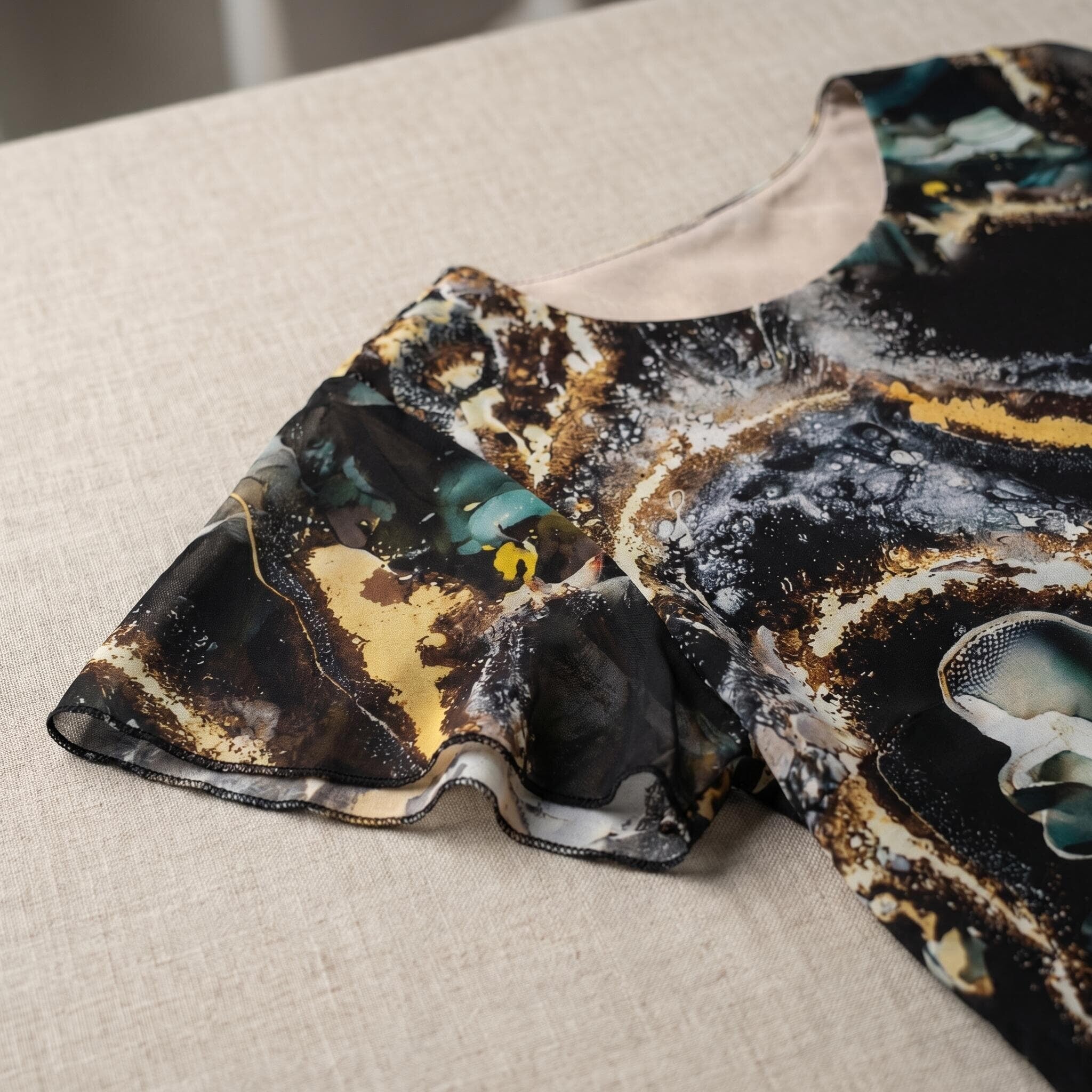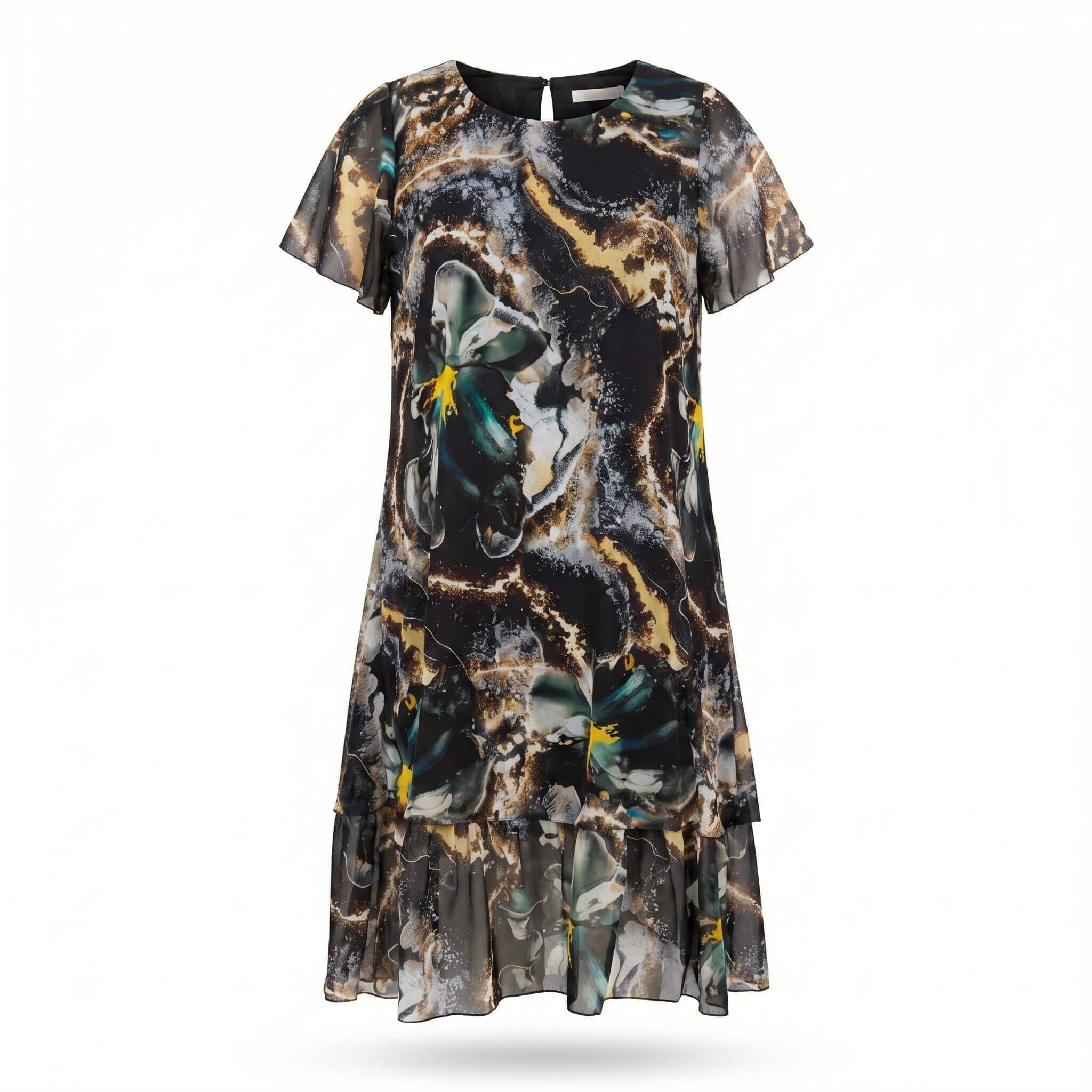 Simte-te irezistibilă și încrezătoare cu această rochie maxi elegantă, creată special pentru a-ți evidenția feminitatea. Modelul combină confortul și eleganța printr-un strat exterior aerisit de șifon frumos, colorat, cu un imprimeu abstract marmorat în auriu, turcoaz și alb, care cade delicat peste o bază neagră clasică. Mânecile scurte evazate tip fluture și tivul stratificat adaugă mișcare romantică și lejeritate siluetei. Cu o lungime sub genunchi, această rochie evazată mărimea mare este alegerea perfectă pentru ocazii speciale precum nunți, botezuri sau un stil de zi cu zi elegant în zilele calde de vară.