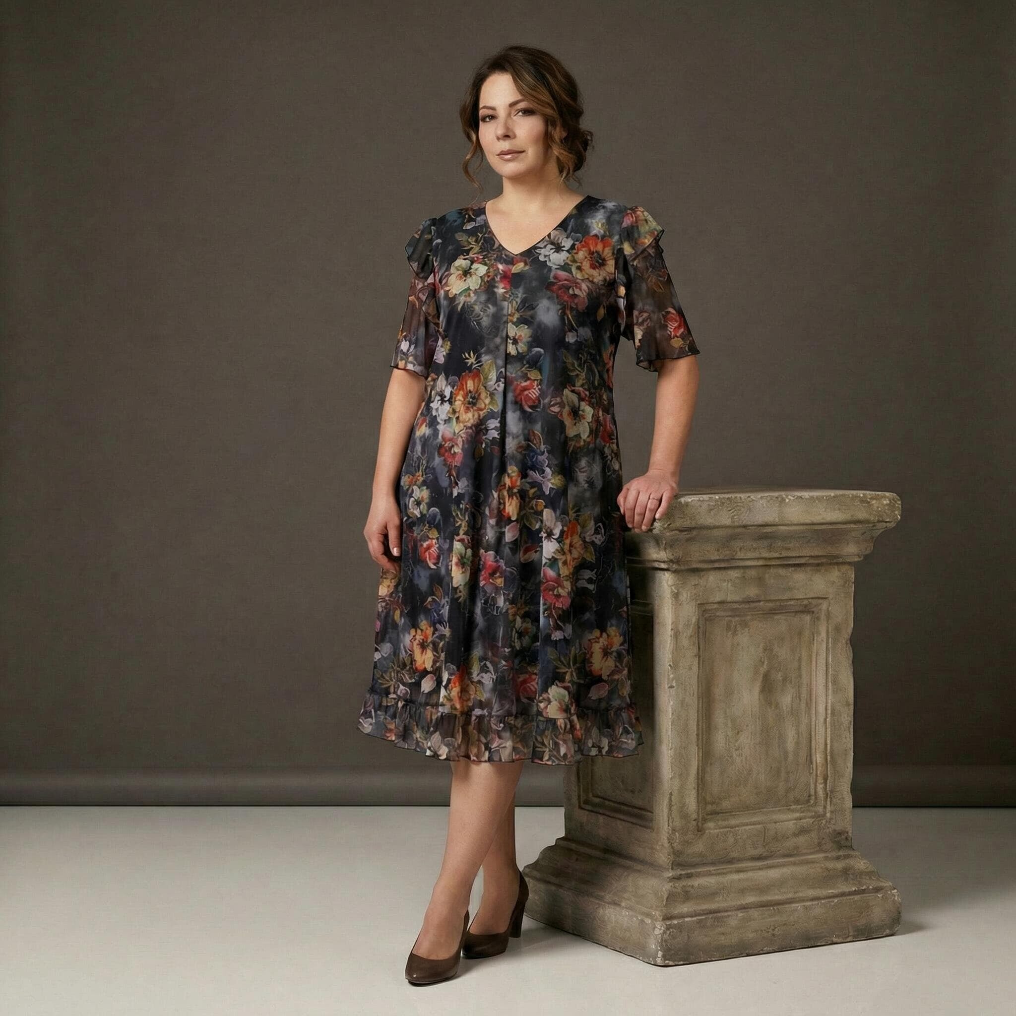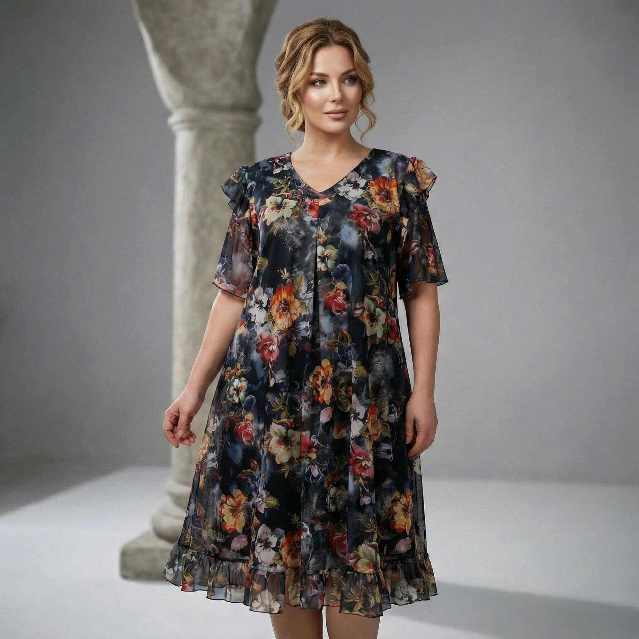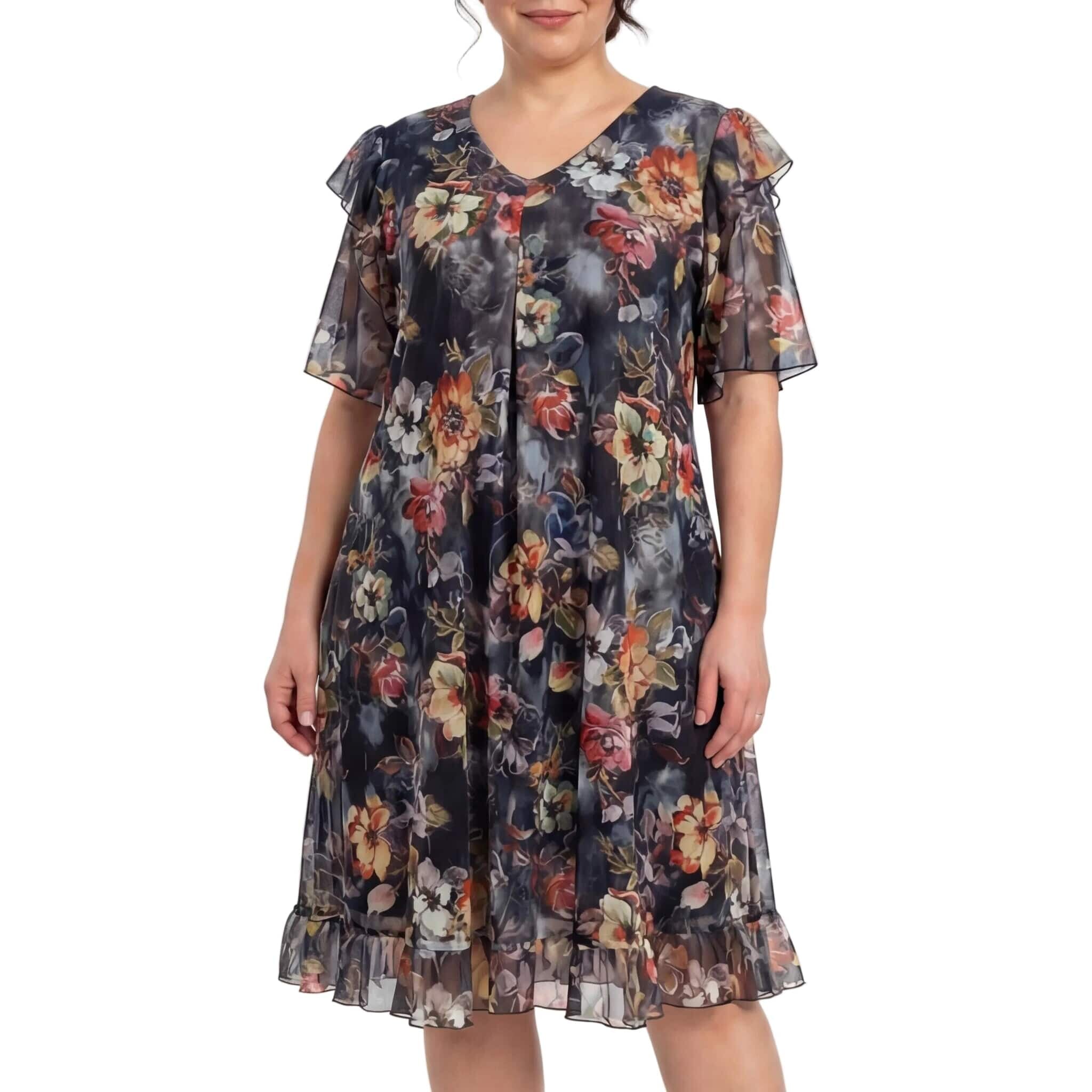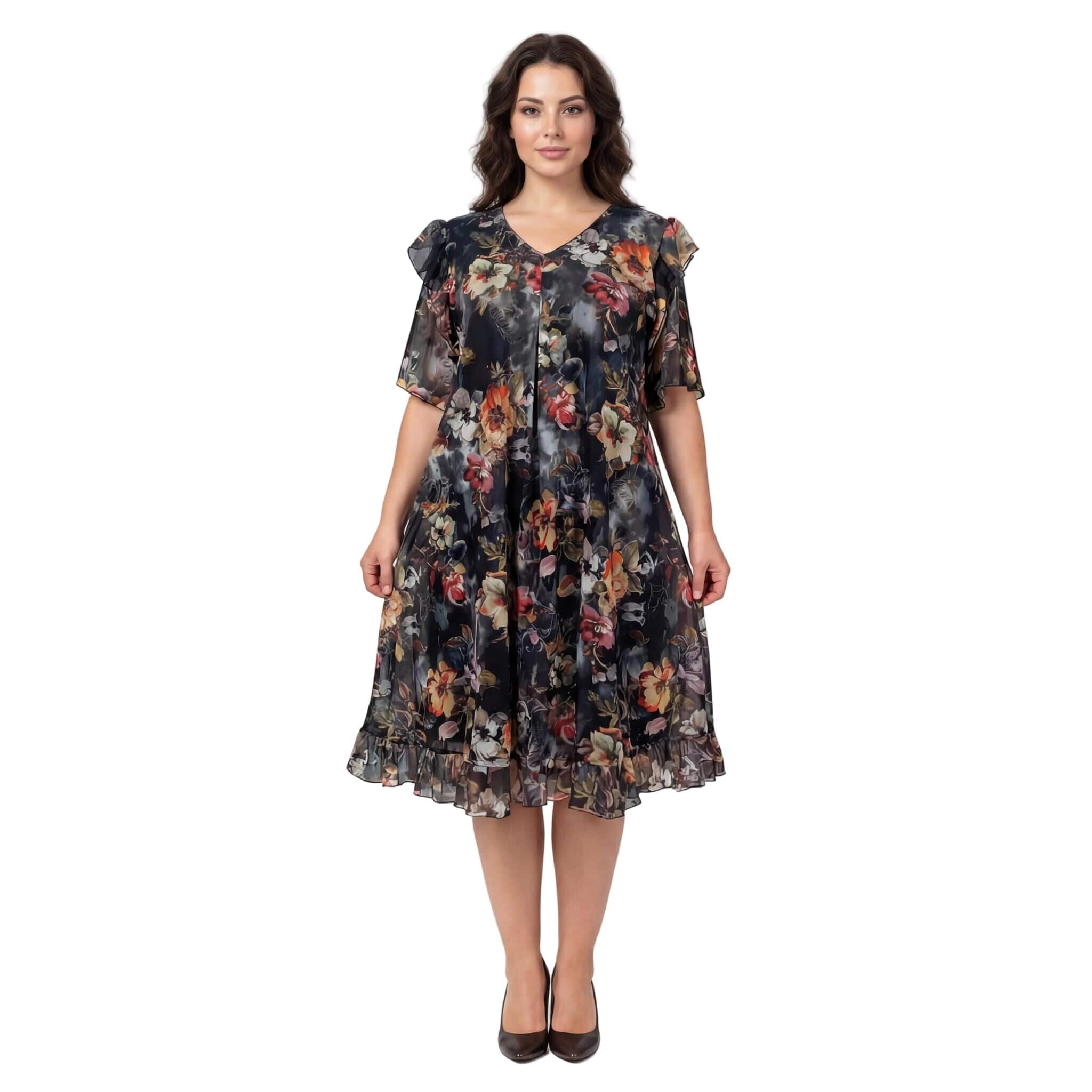 Rochie oficială în cloș, din șifon floral cu căptușeală elastică