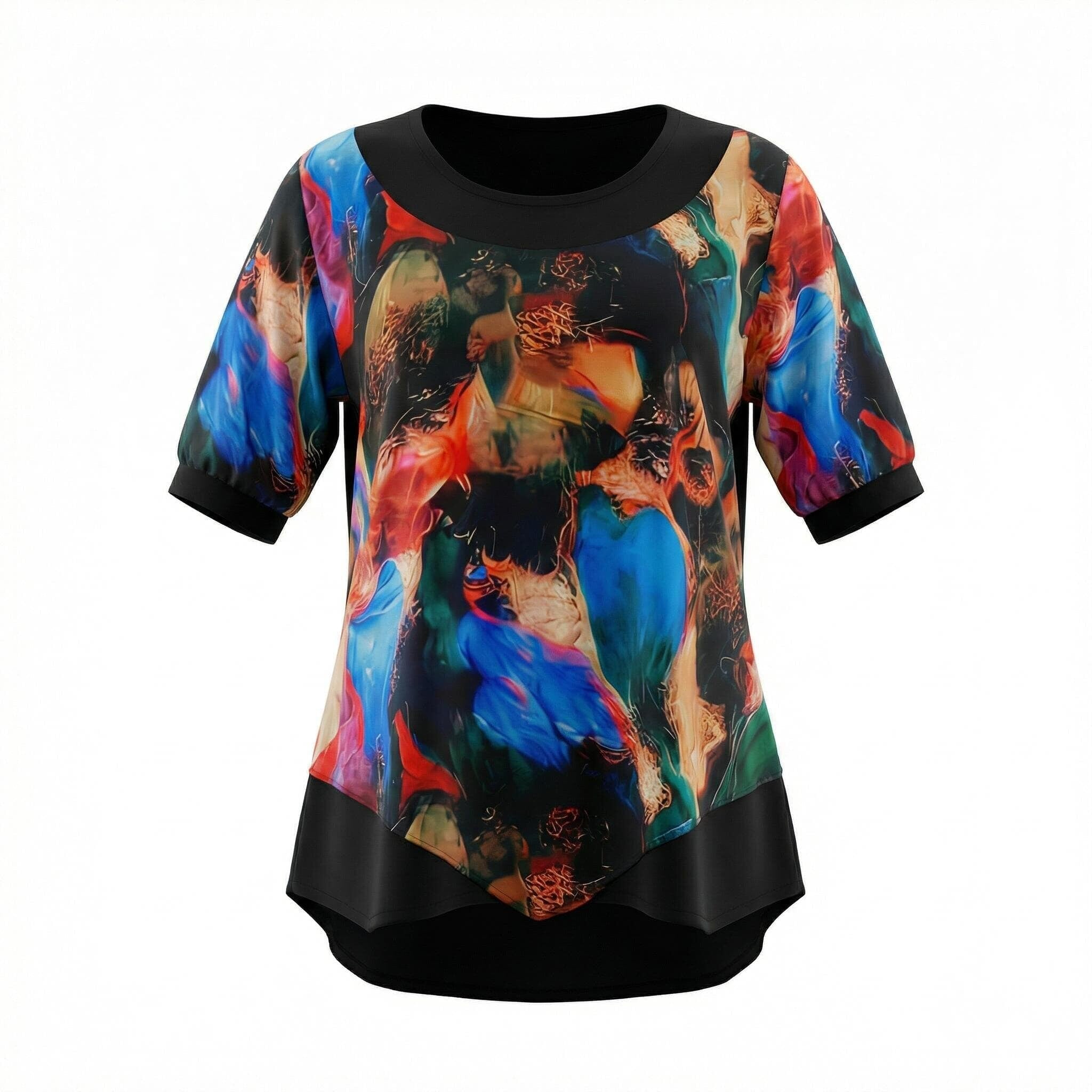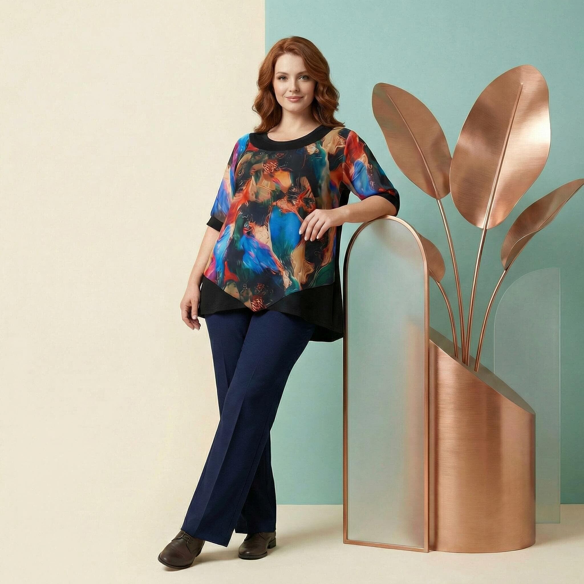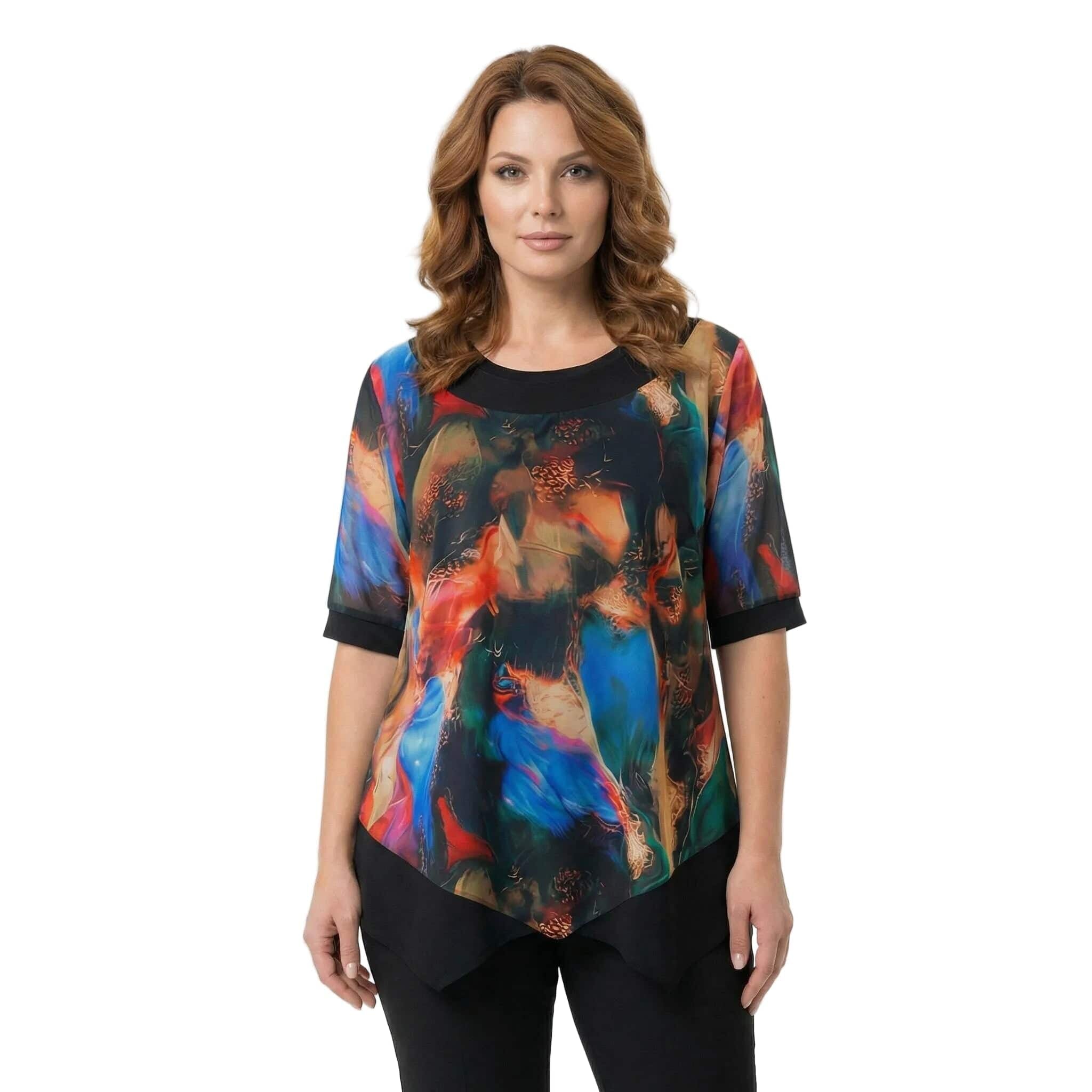 Tunică evazată elegantă cu șifon asimetric și imprimeu floral