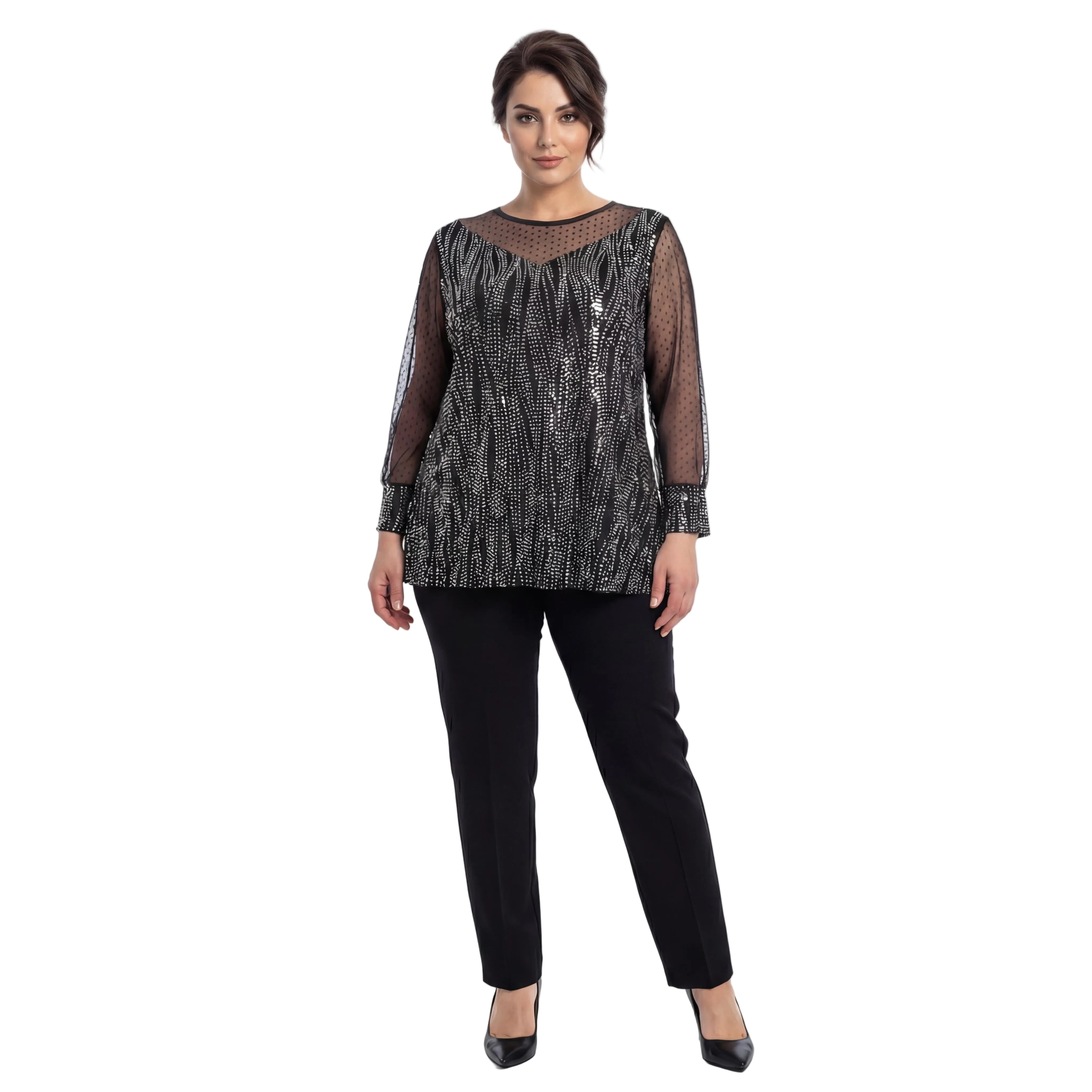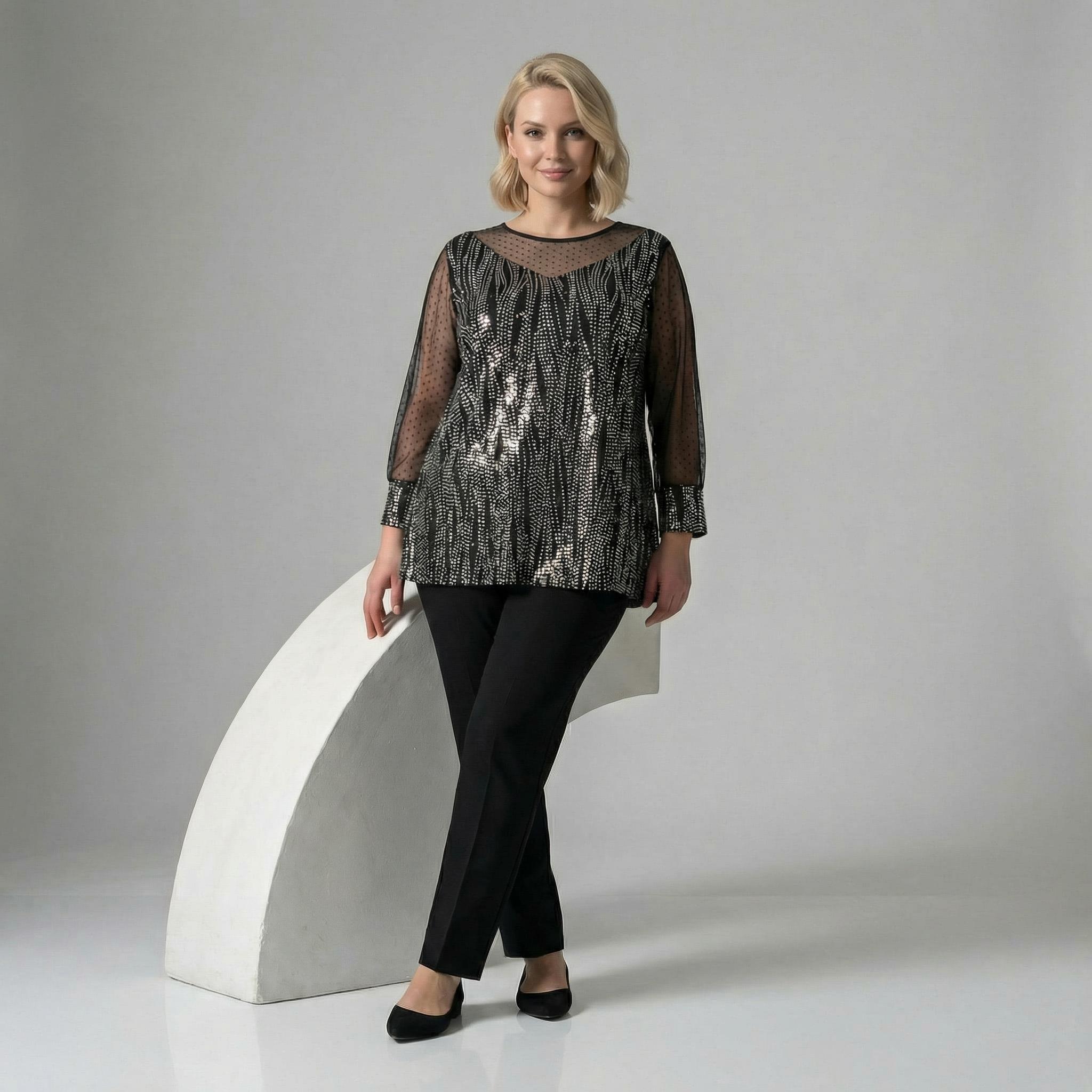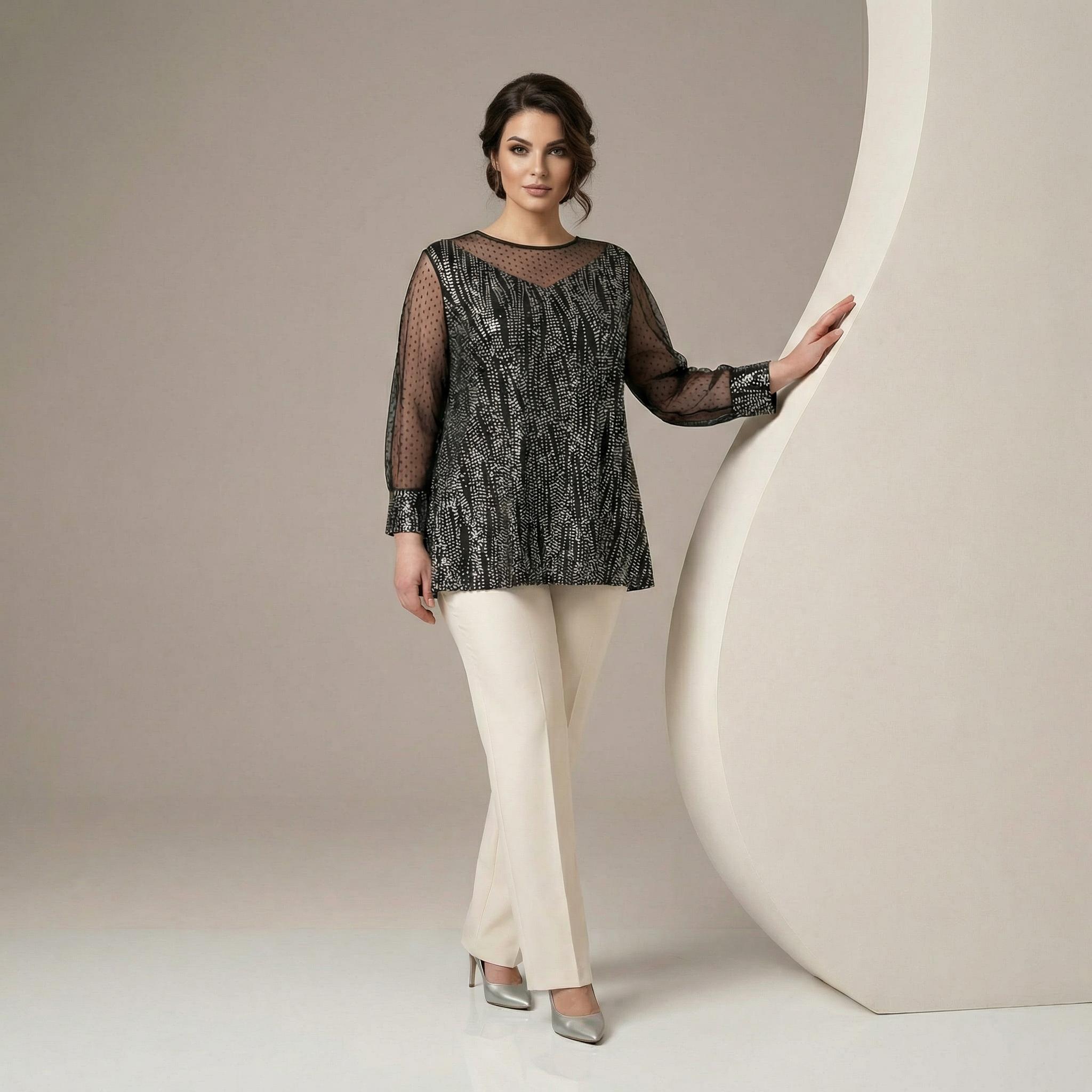 Представяме ви изискана официална туника, създадена да подчертае красотата на дамите с пищни форми. Този модел впечатлява с ефектно илюзионно деколте и дълги прозрачни ръкави от фин тюл на точки, които придават женственост и ефирност на визията. Основната част е изработена от черен еластичен плат, дискретно пронизан от сребристи нишки, създаващи изтънчен блясък и визуален ефект на вертикални линии. Разкроената кройка пада тежко и свободно, осигурявайки безупречен комфорт и елегантен силует. Туниката е перфектният избор за сватби, коктейли, официални вечери или всеки друг специален повод през пролетно-летния сезон.
