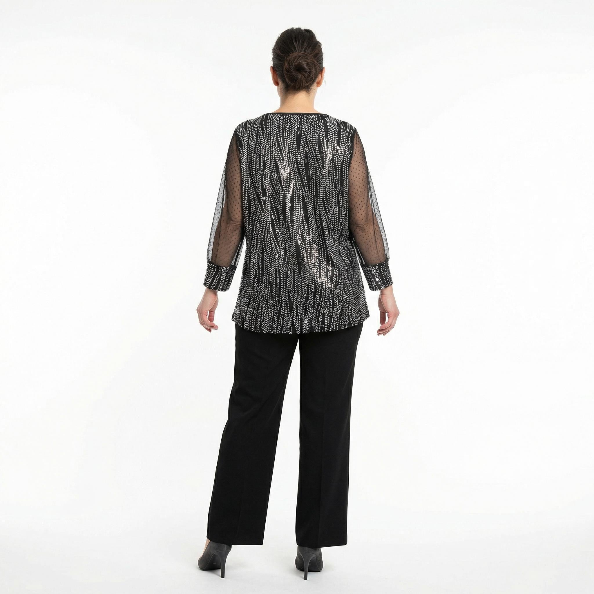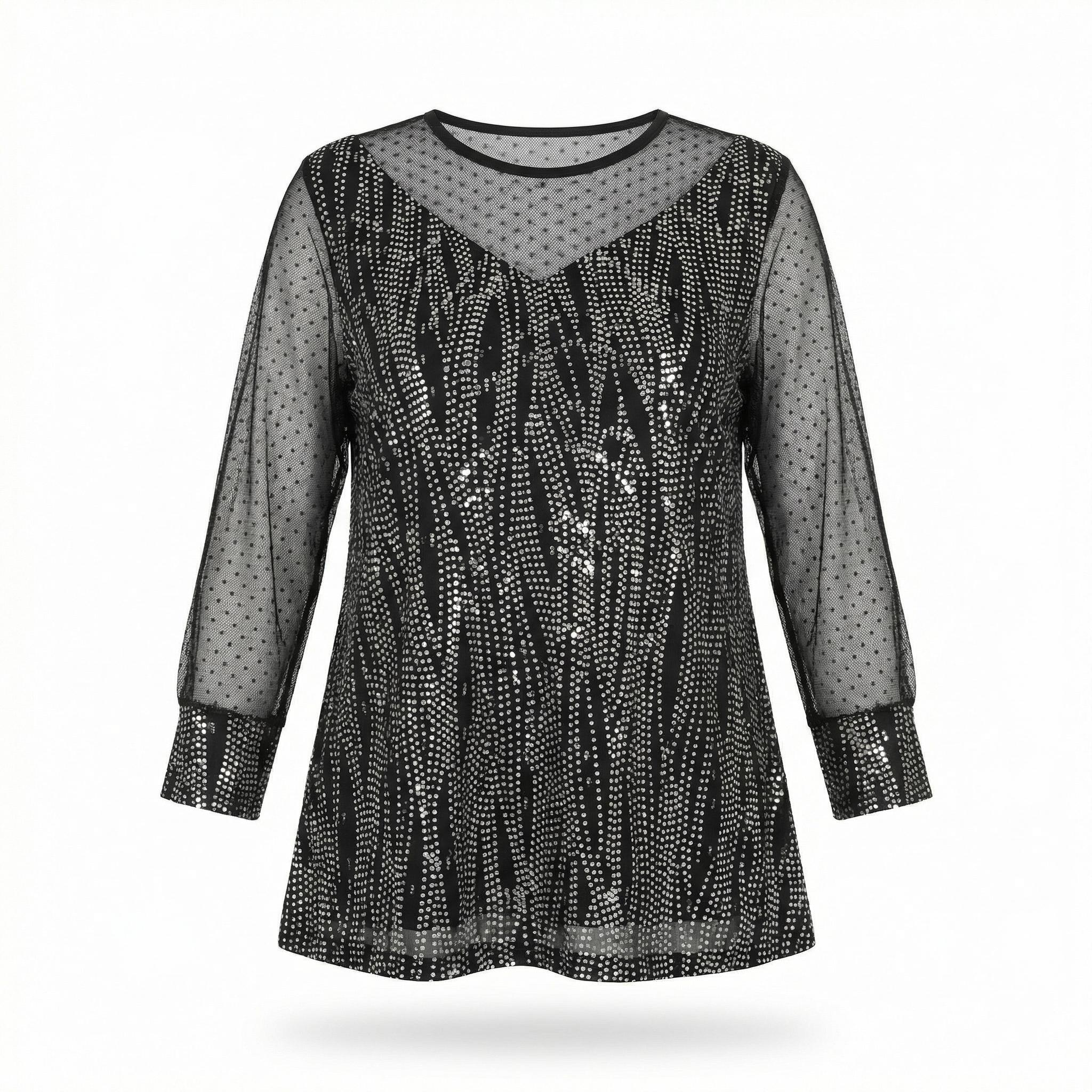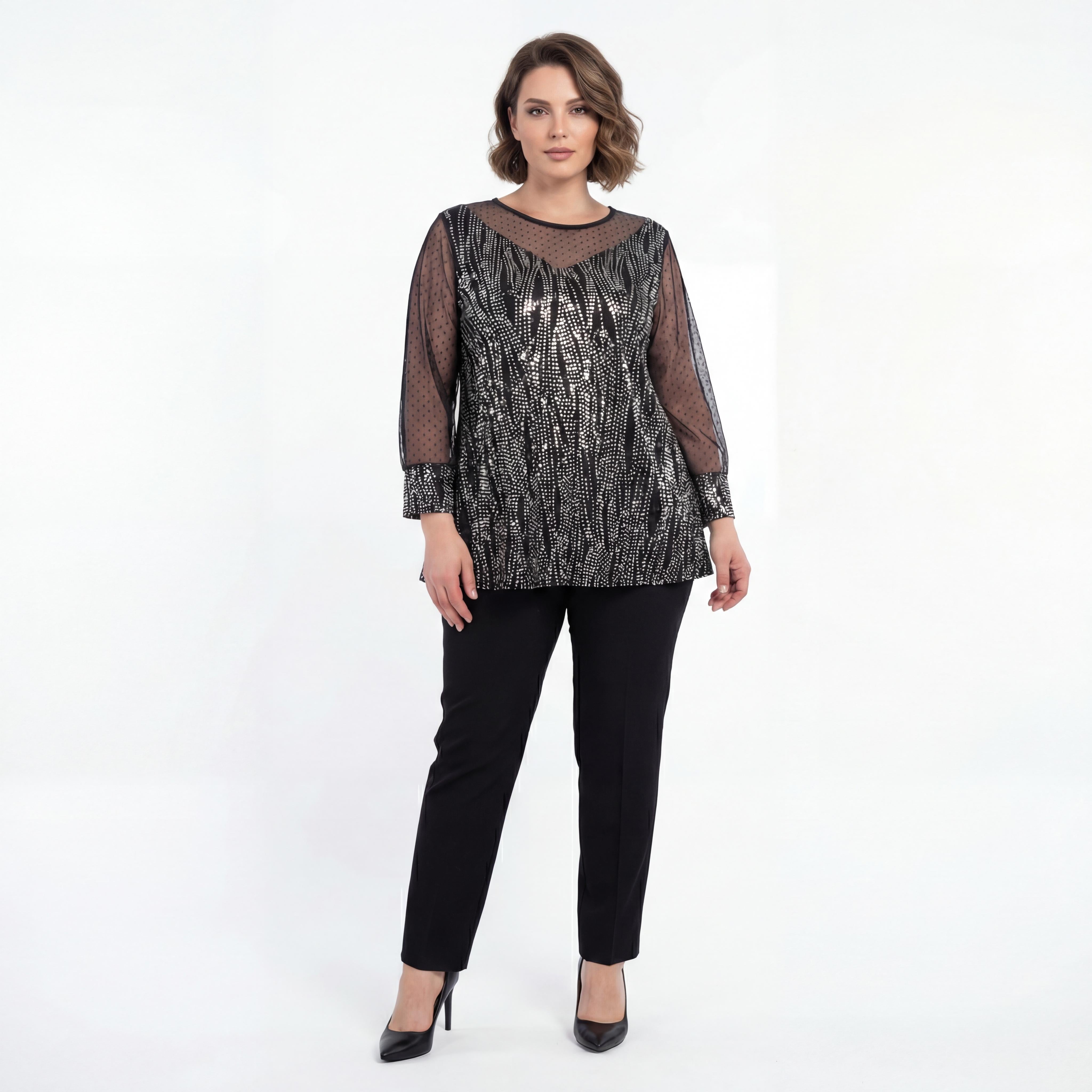 Представяме ви изискана официална туника, създадена да подчертае красотата на дамите с пищни форми. Този модел впечатлява с ефектно илюзионно деколте и дълги прозрачни ръкави от фин тюл на точки, които придават женственост и ефирност на визията. Основната част е изработена от черен еластичен плат, дискретно пронизан от сребристи нишки, създаващи изтънчен блясък и визуален ефект на вертикални линии. Разкроената кройка пада тежко и свободно, осигурявайки безупречен комфорт и елегантен силует. Туниката е перфектният избор за сватби, коктейли, официални вечери или всеки друг специален повод през пролетно-летния сезон.