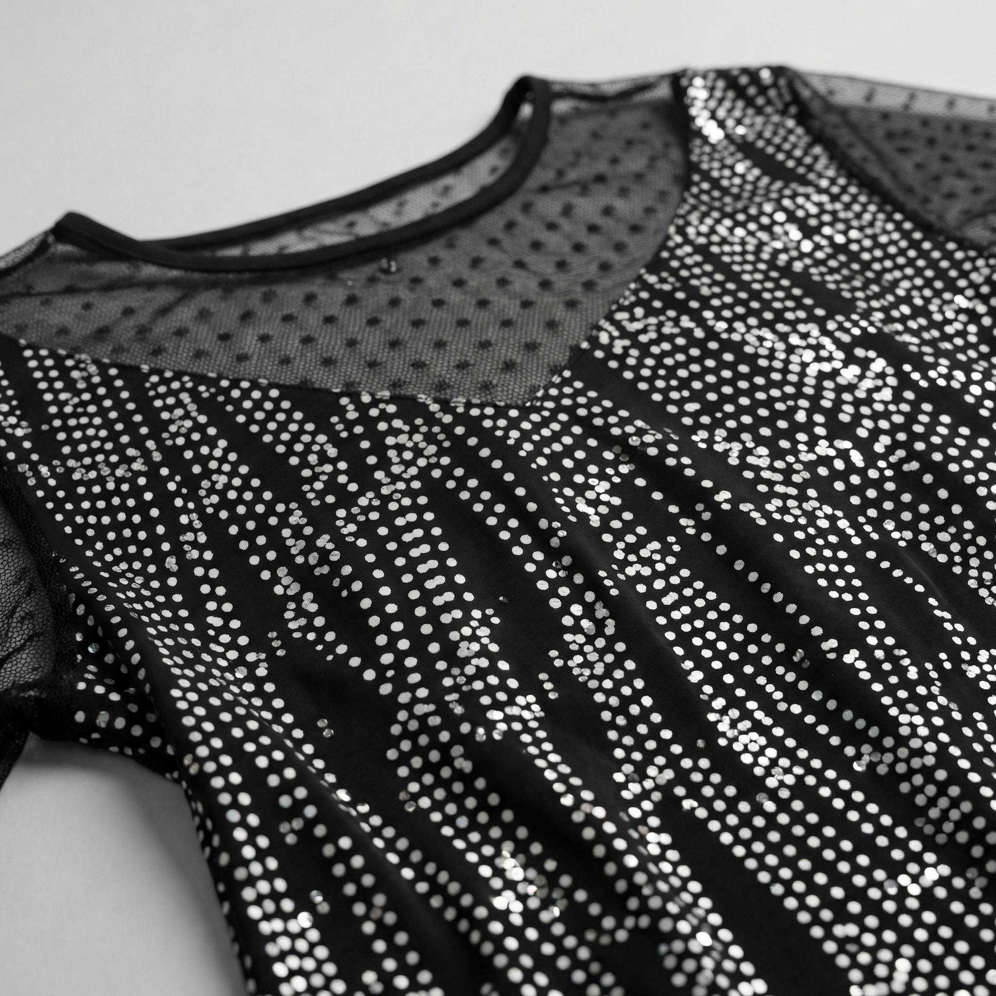 - Елегантен дизайн с акценти от тюл на точки и сребристи нишки.