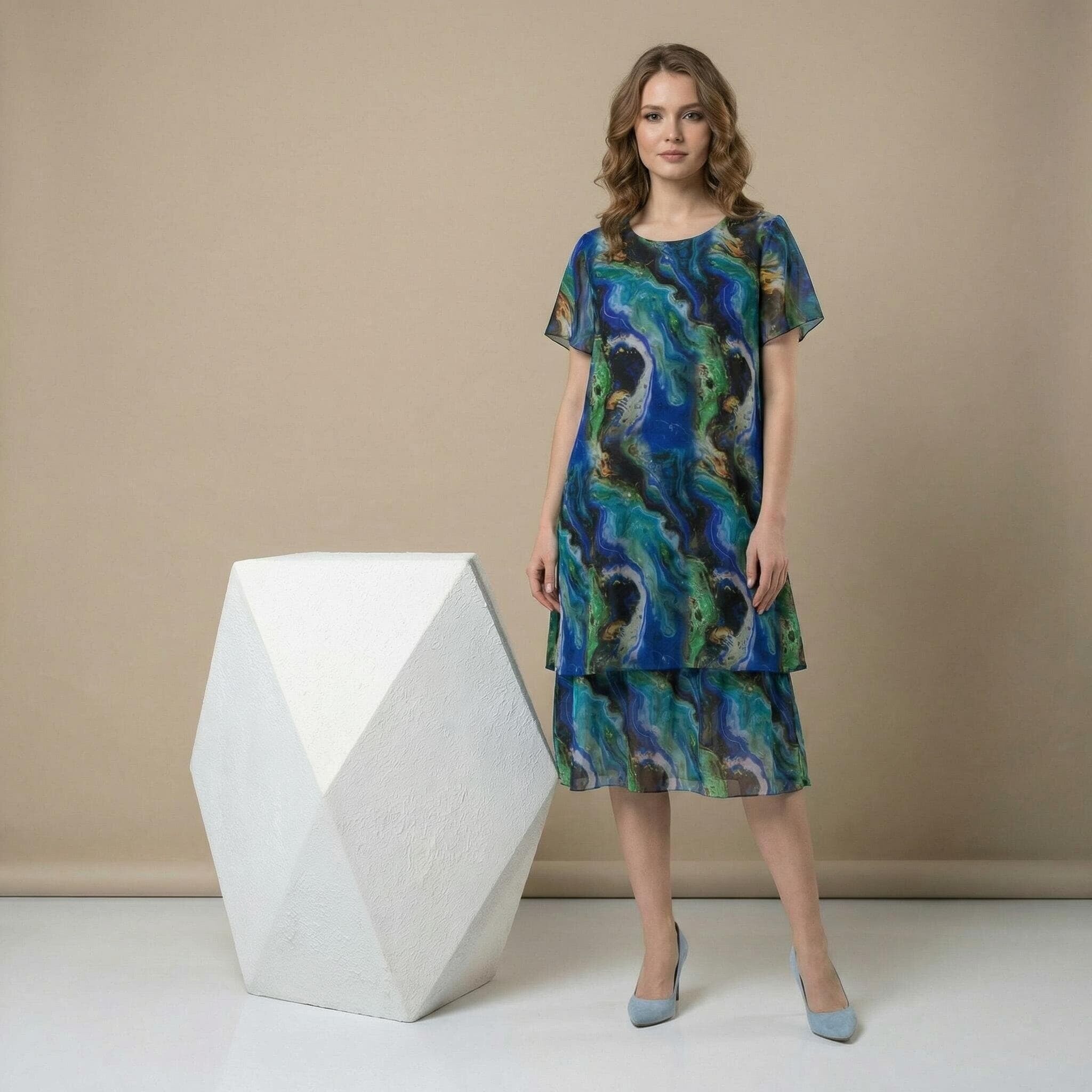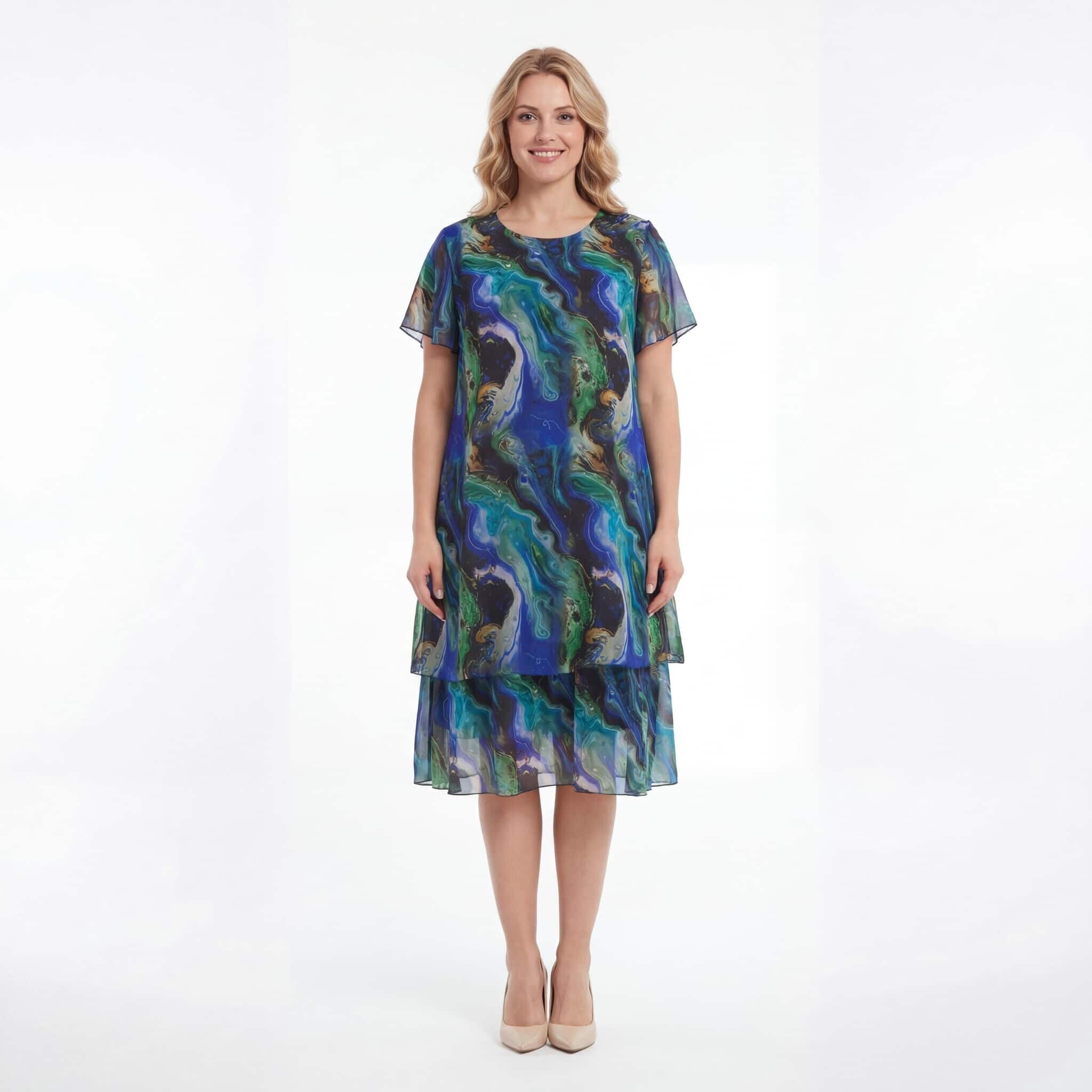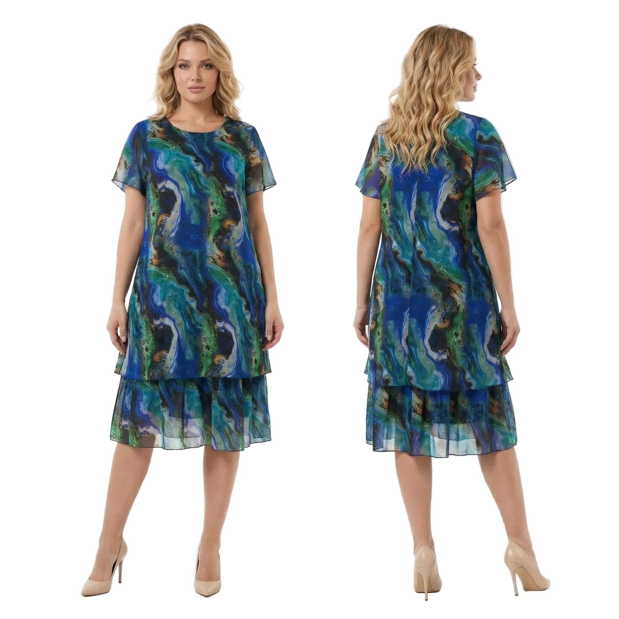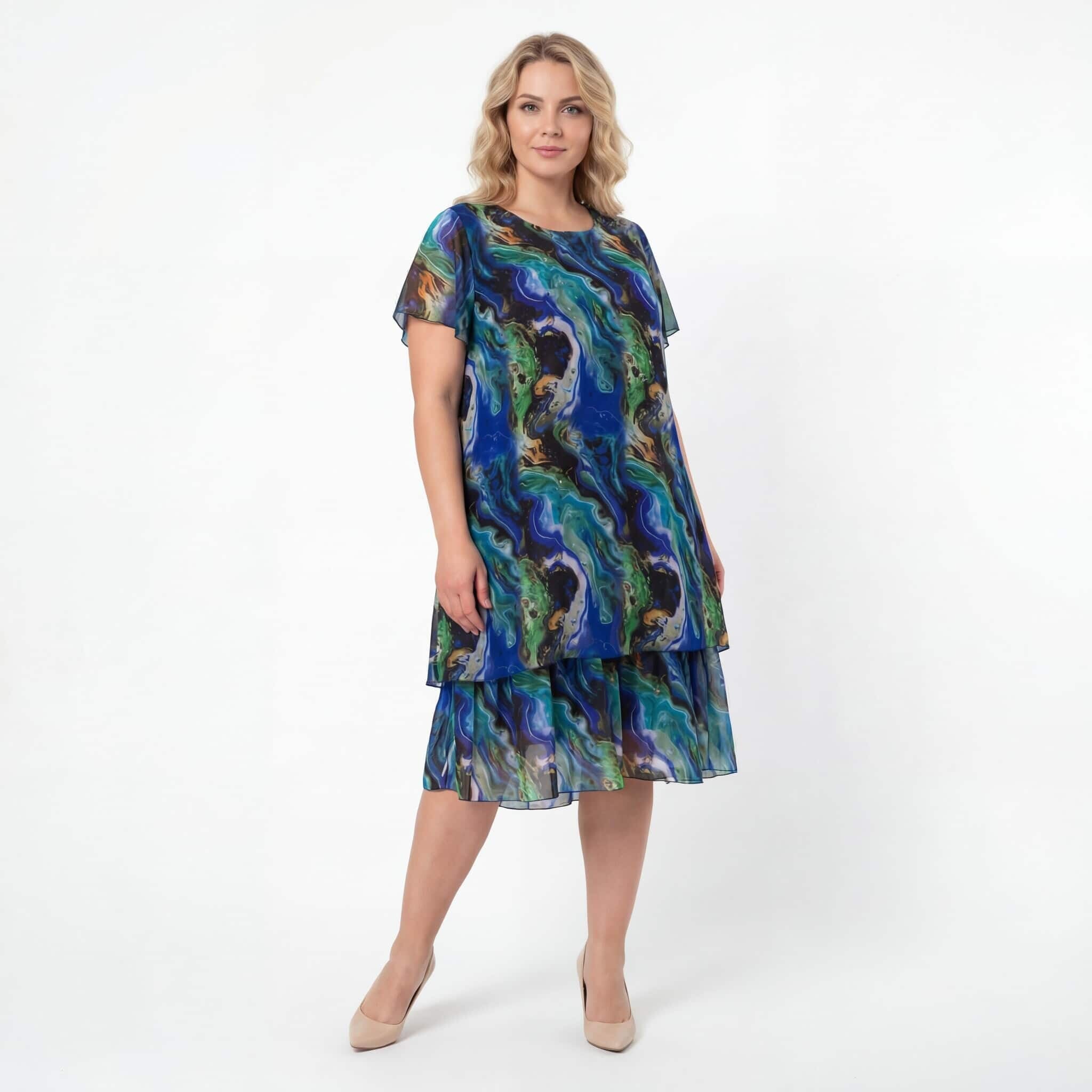 Fii irezistibilă în zilele calde de vară cu această rochie elegantă, oficială, din șifon, mărimi mari. Confecționată cu atenție la detalii, rochia impresionează prin designul său multistratificat și materialul eteric în nuanțe frumoase, degrade. Șifonul dublu creează o senzație de lejeritate, căzând ușor și liber în jurul corpului, accentuând feminitatea. Croiala evazată, stilată și confortabilă, combinată cu un decolteu clasic rotund și mâneci scurte, asigură un confort impecabil și libertate de mișcare. Această rochie frumoasă, cu lungimea sub genunchi, este alegerea perfectă atât pentru ținutele elegante de zi cu zi, cât și pentru ocazii speciale, formale, garantându-vă încredere și grație în orice moment.