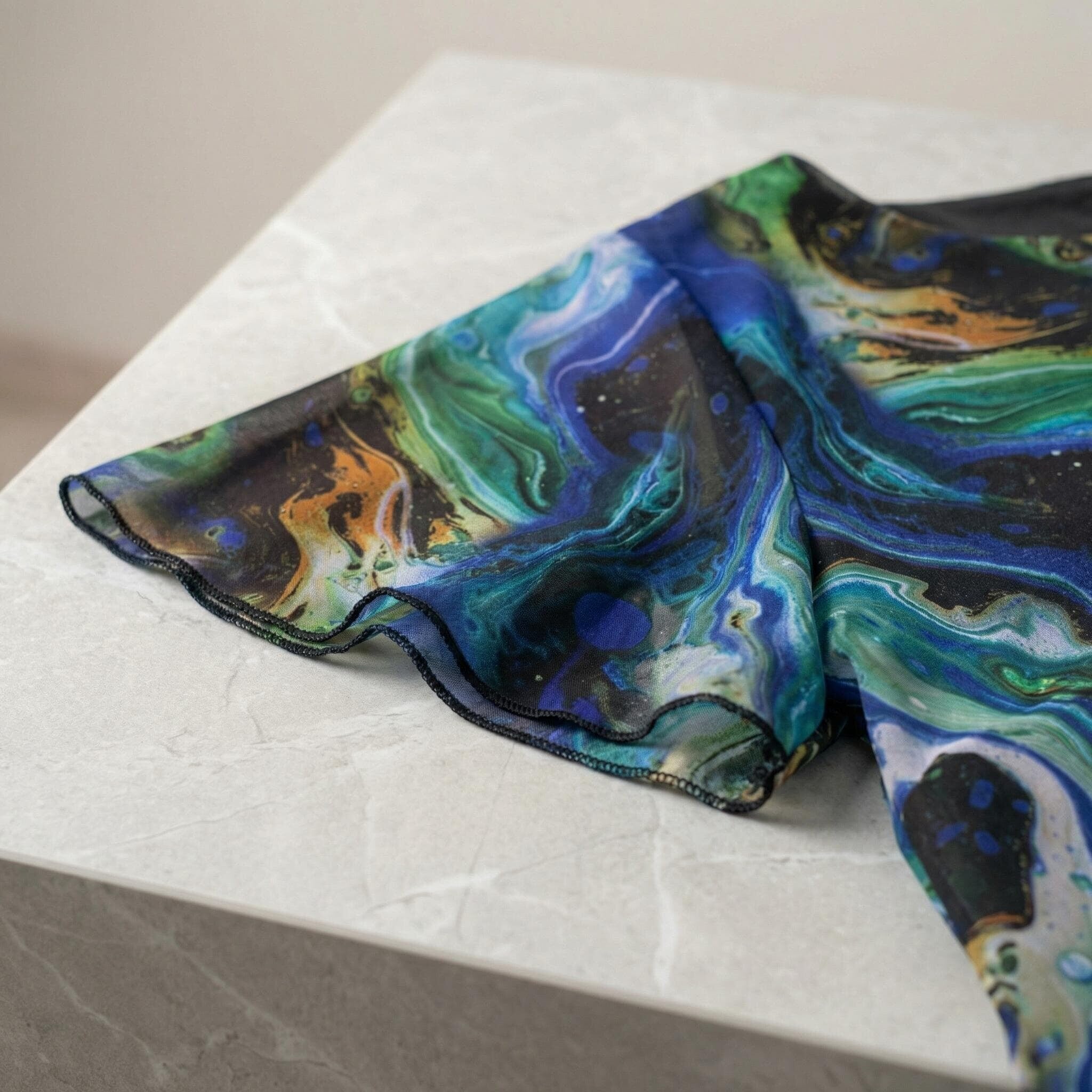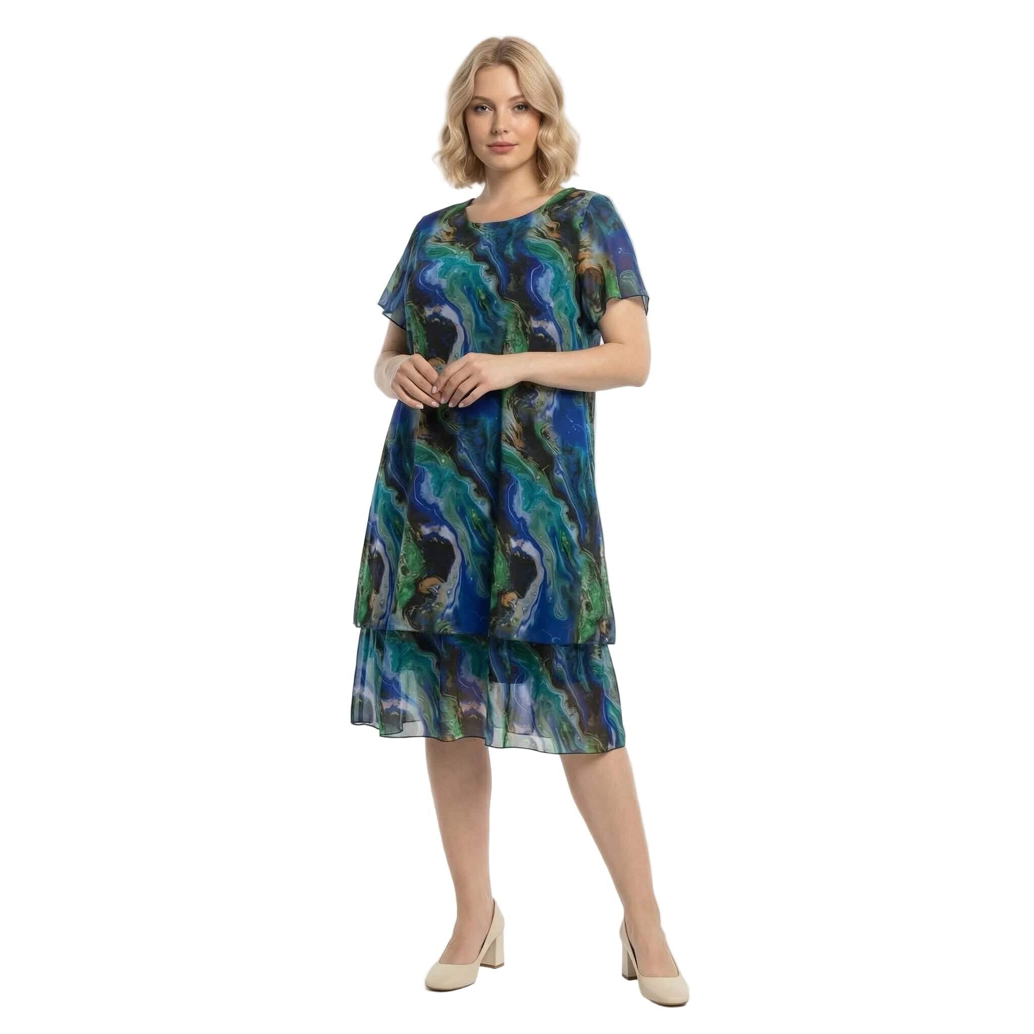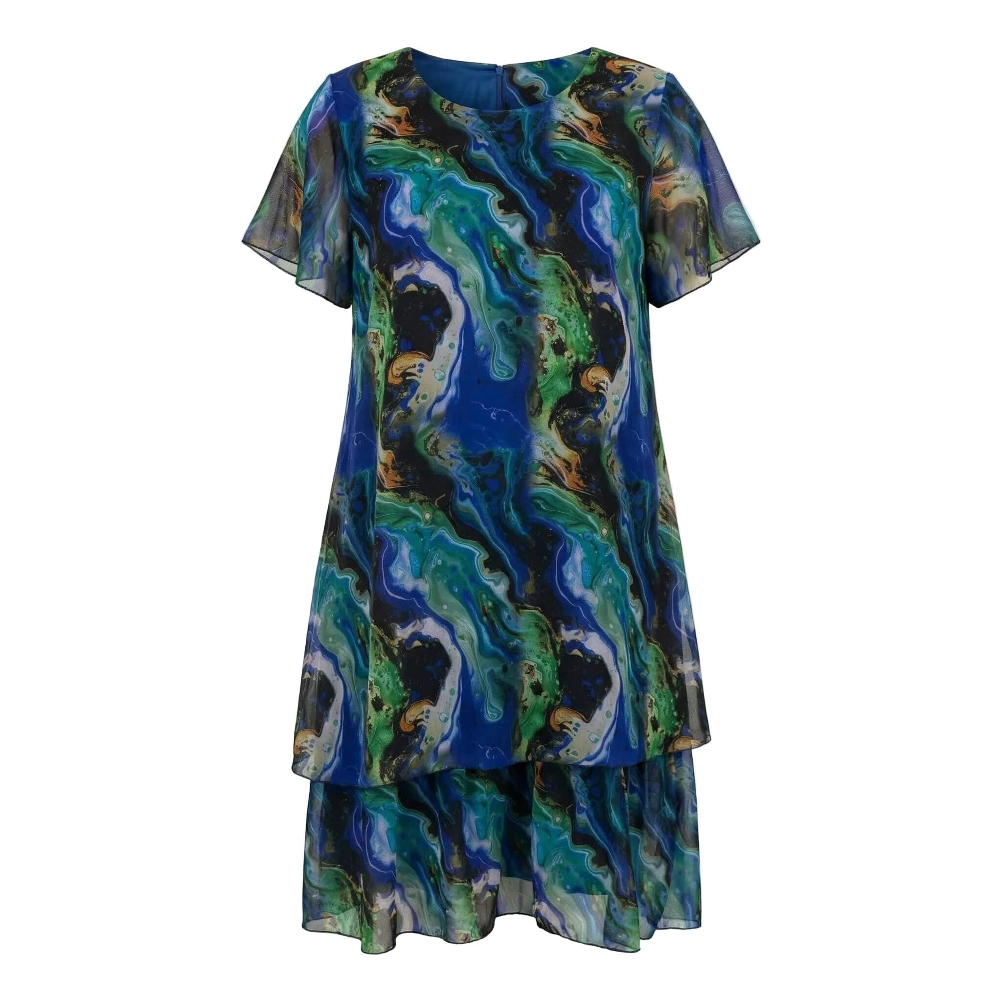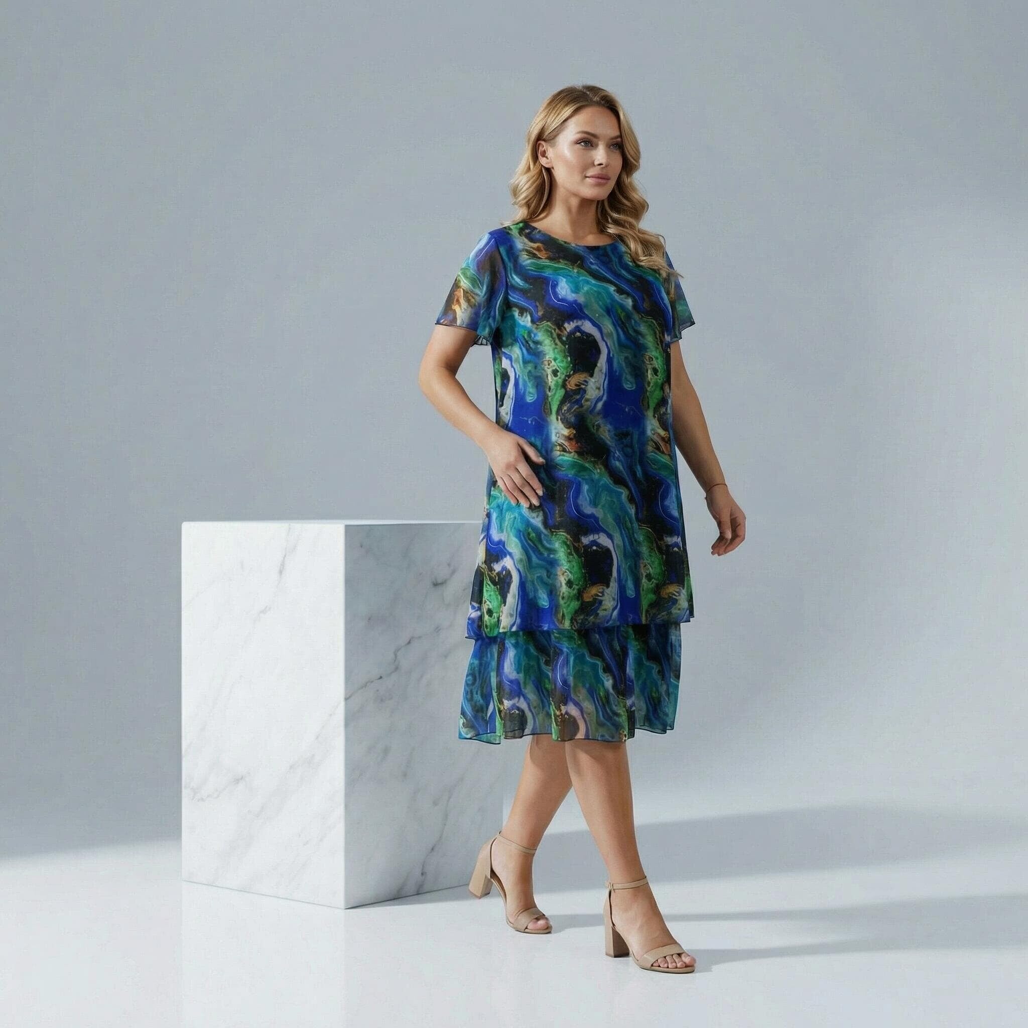 Fii irezistibilă în zilele calde de vară cu această rochie elegantă, oficială, din șifon, mărimi mari. Confecționată cu atenție la detalii, rochia impresionează prin designul său multistratificat și materialul eteric în nuanțe frumoase, degrade. Șifonul dublu creează o senzație de lejeritate, căzând ușor și liber în jurul corpului, accentuând feminitatea. Croiala evazată, stilată și confortabilă, combinată cu un decolteu clasic rotund și mâneci scurte, asigură un confort impecabil și libertate de mișcare. Această rochie frumoasă, cu lungimea sub genunchi, este alegerea perfectă atât pentru ținutele elegante de zi cu zi, cât și pentru ocazii speciale, formale, garantându-vă încredere și grație în orice moment.