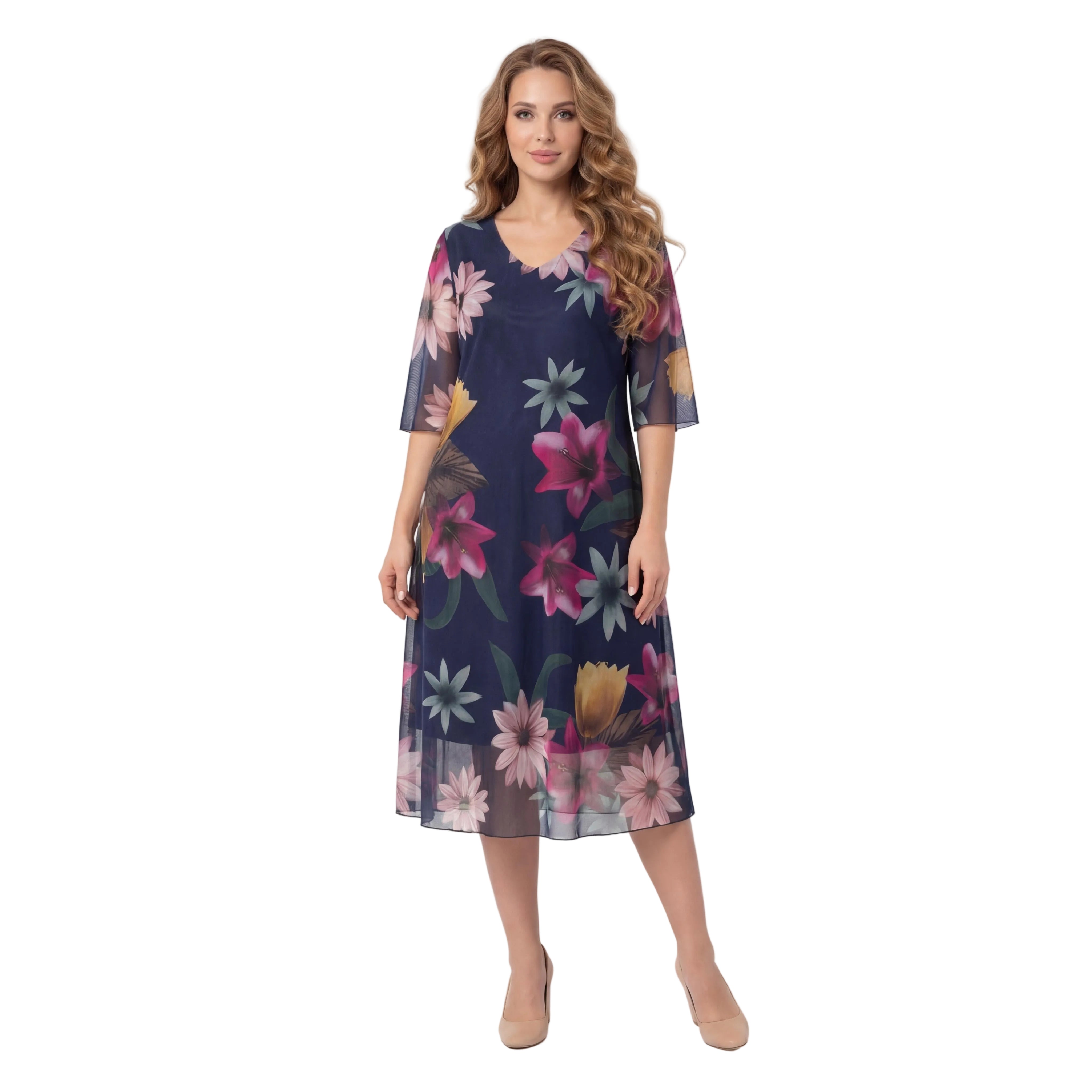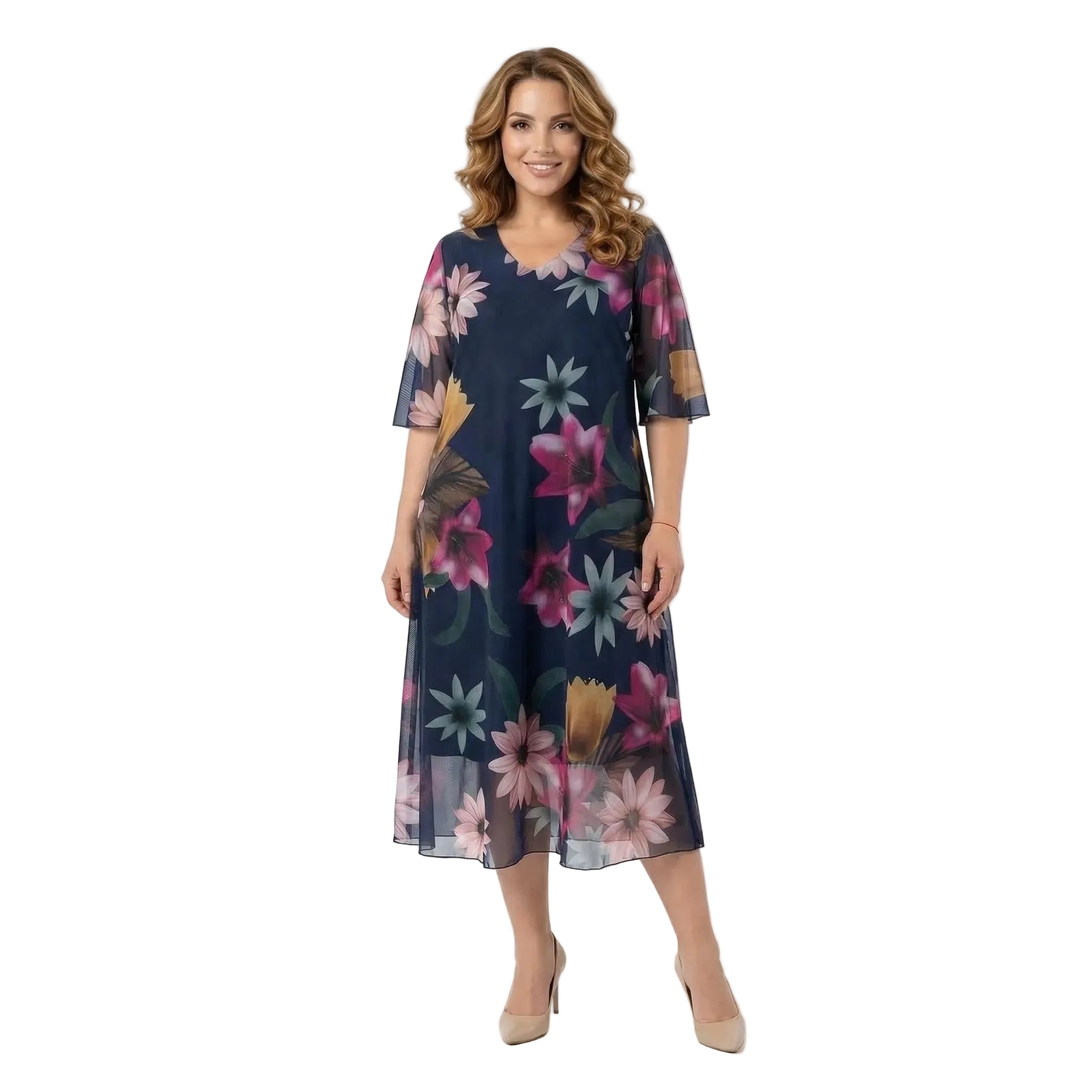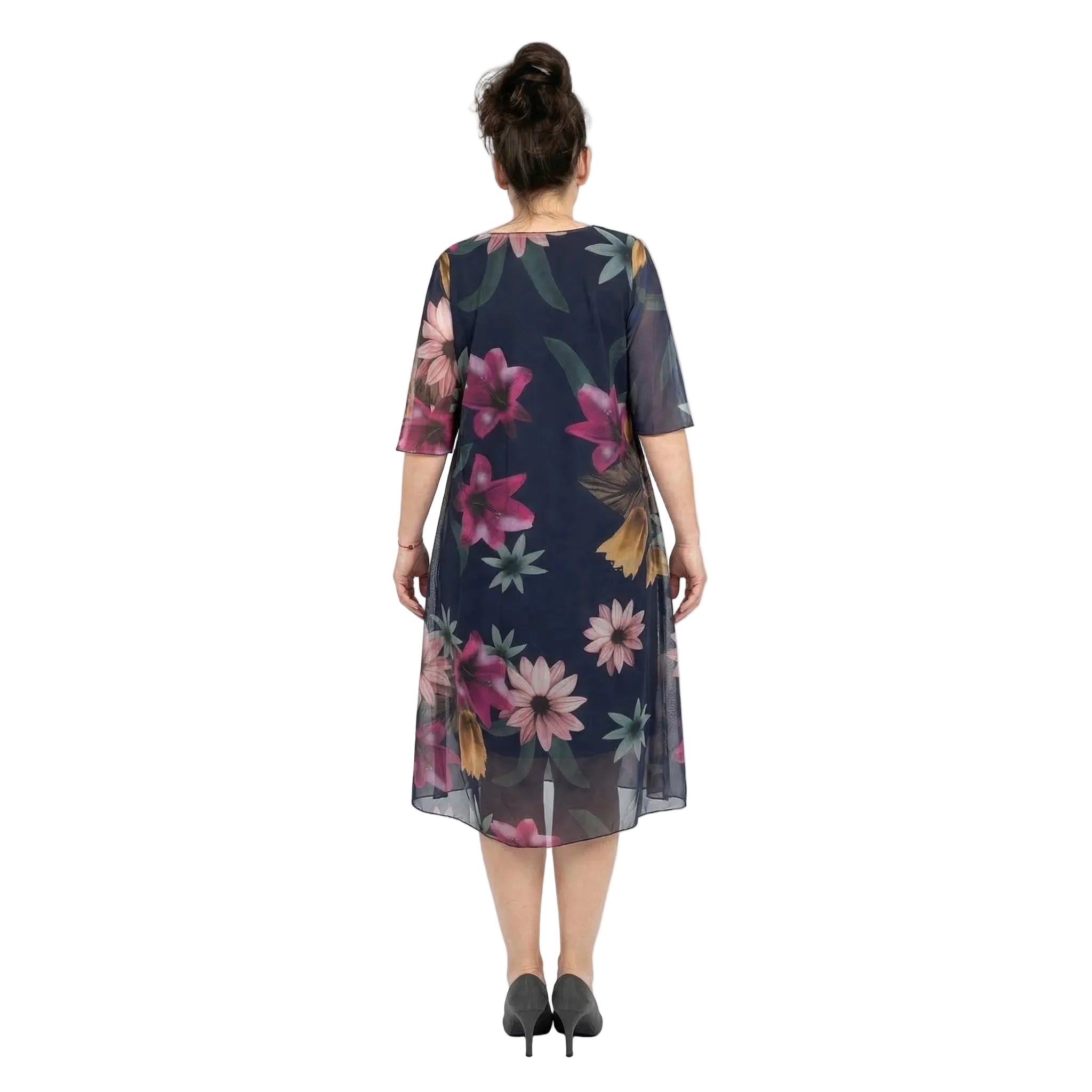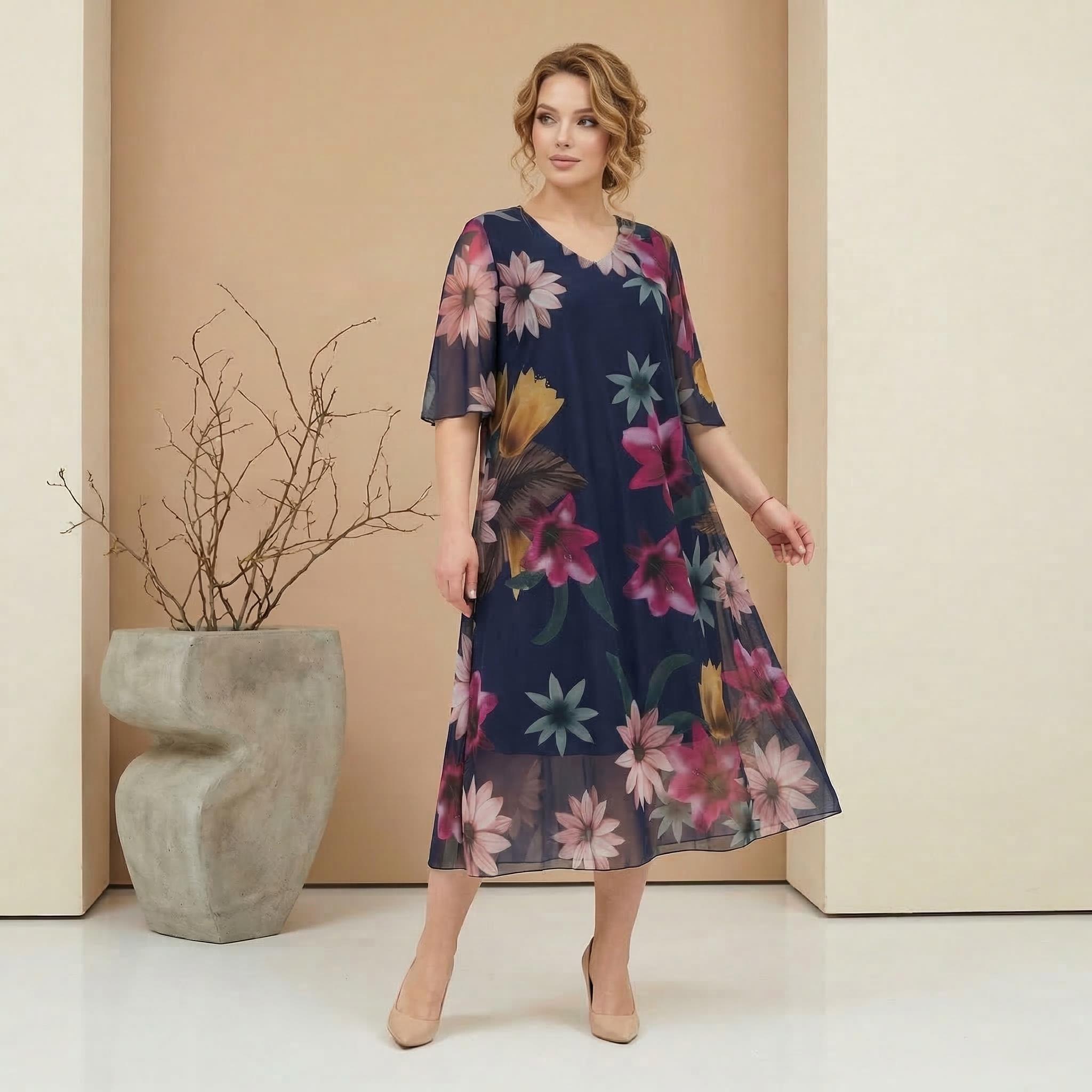 Впечатлете с елегантност и стил с тази официална дамска рокля, създадена да подчертава женствеността и да носи увереност. Моделът се отличава с красив ефирен шифон на цветя в преливащи нежни нюанси, който пада меко и придава лекота на всяко движение. Разкроената кройка с дължина под коляното, съчетана с изящни къси ръкави и класическо V-образно деколте, осигурява безупречна визия и пълна свобода. Роклята разполага с черна еластична подплата, която гарантира целодневен комфорт, докато прозрачният външен слой добавя изтънченост на силуета. Това е перфектният избор както за стилно ежедневие, така и за вашите специални поводи.