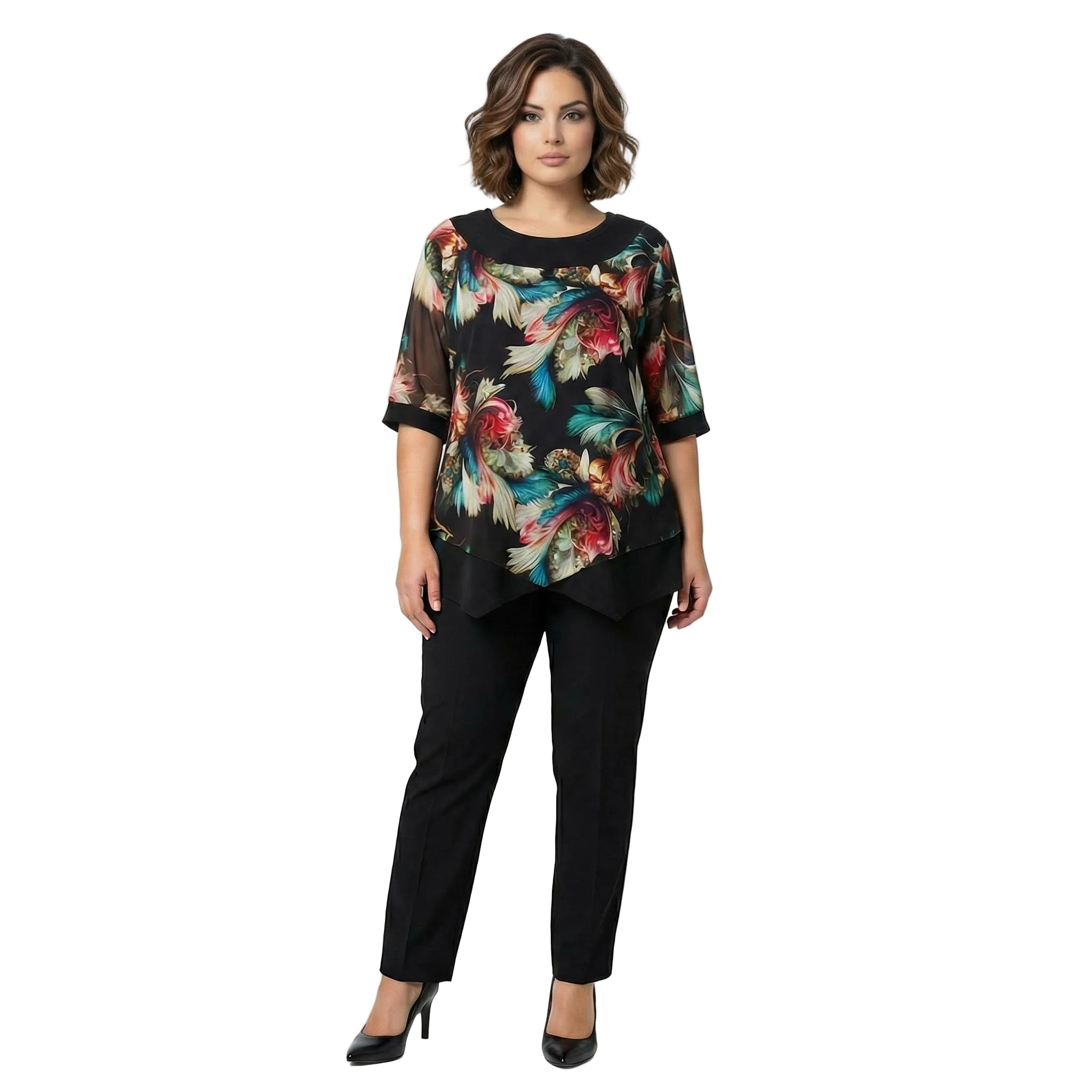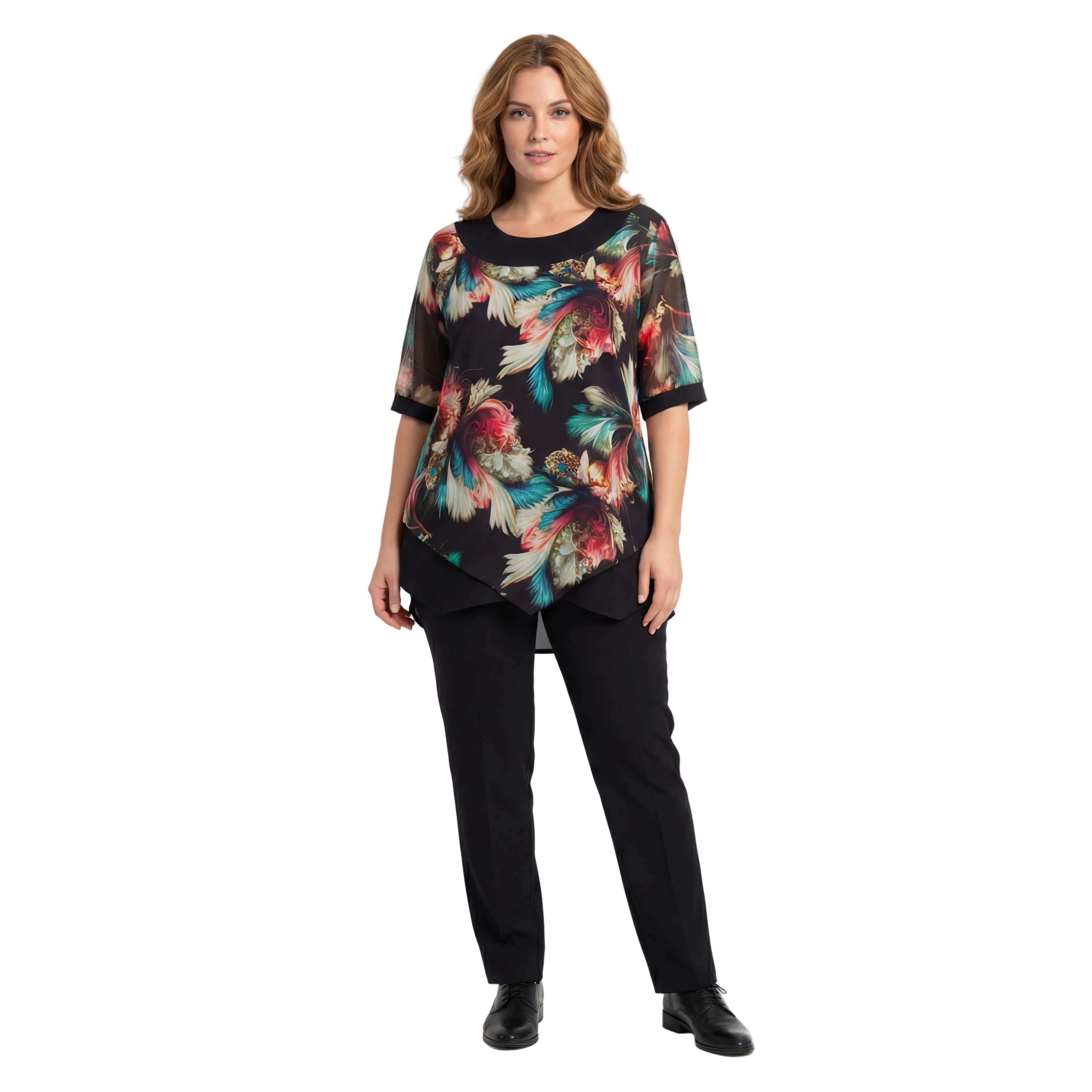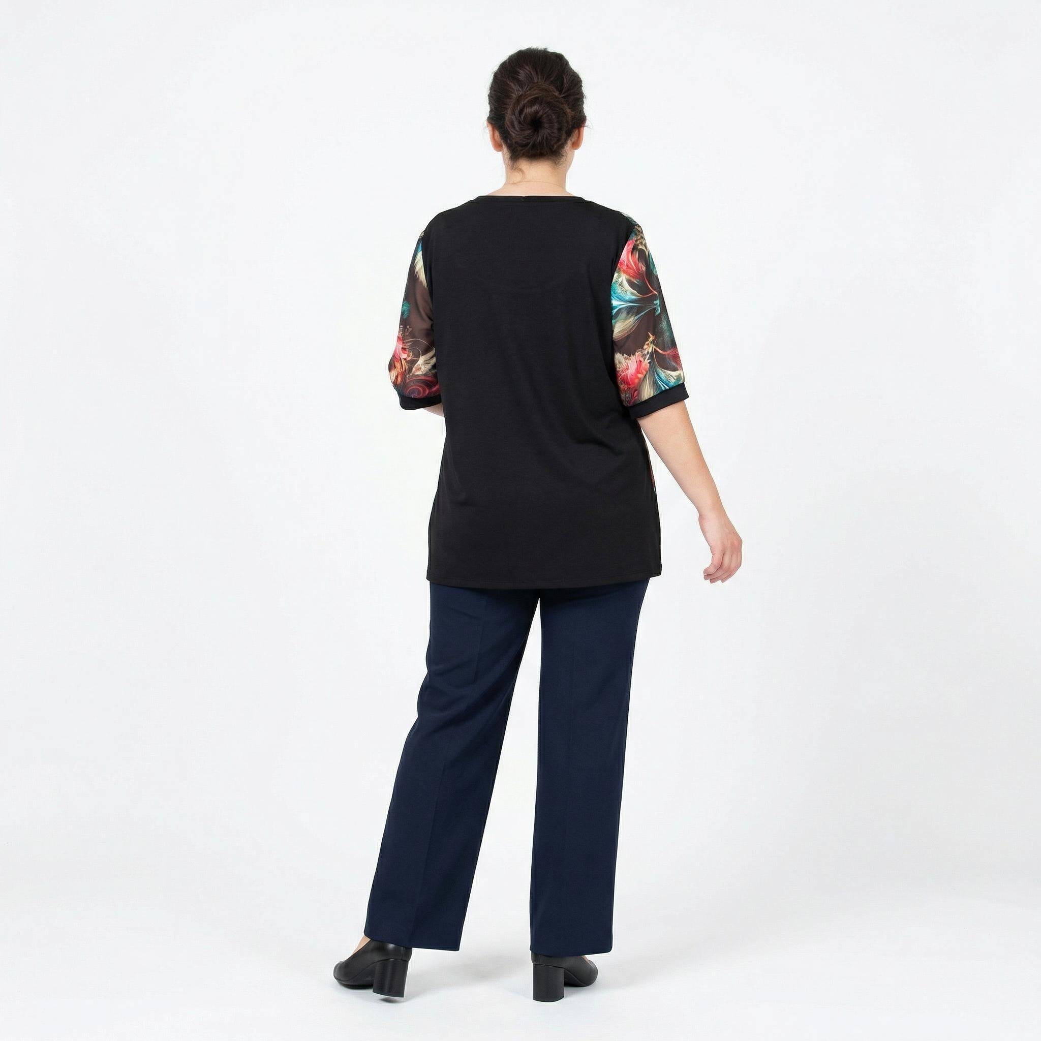 Открийте идеалния баланс между стил и комфорт с тази изискана официална туника, създадена специално за дами с елегантни извивки. Моделът съчетава класическа черна основа с ефектен акцент от шарен, асиметричен шифон в предната част, който придава лекота и въздушност на силуета. Изработена от мека смес на памук и полиестер, туниката осигурява отлична еластичност и удобство през целия ден. Късите ръкави от фин тюл добавят нотка на романтика и изтънченост, докато свободната, разкроена кройка пада тежко и елегантно, подчертавайки женствеността без да ограничава движенията. Перфектен избор за специални поводи, сватби или вечерни събития.