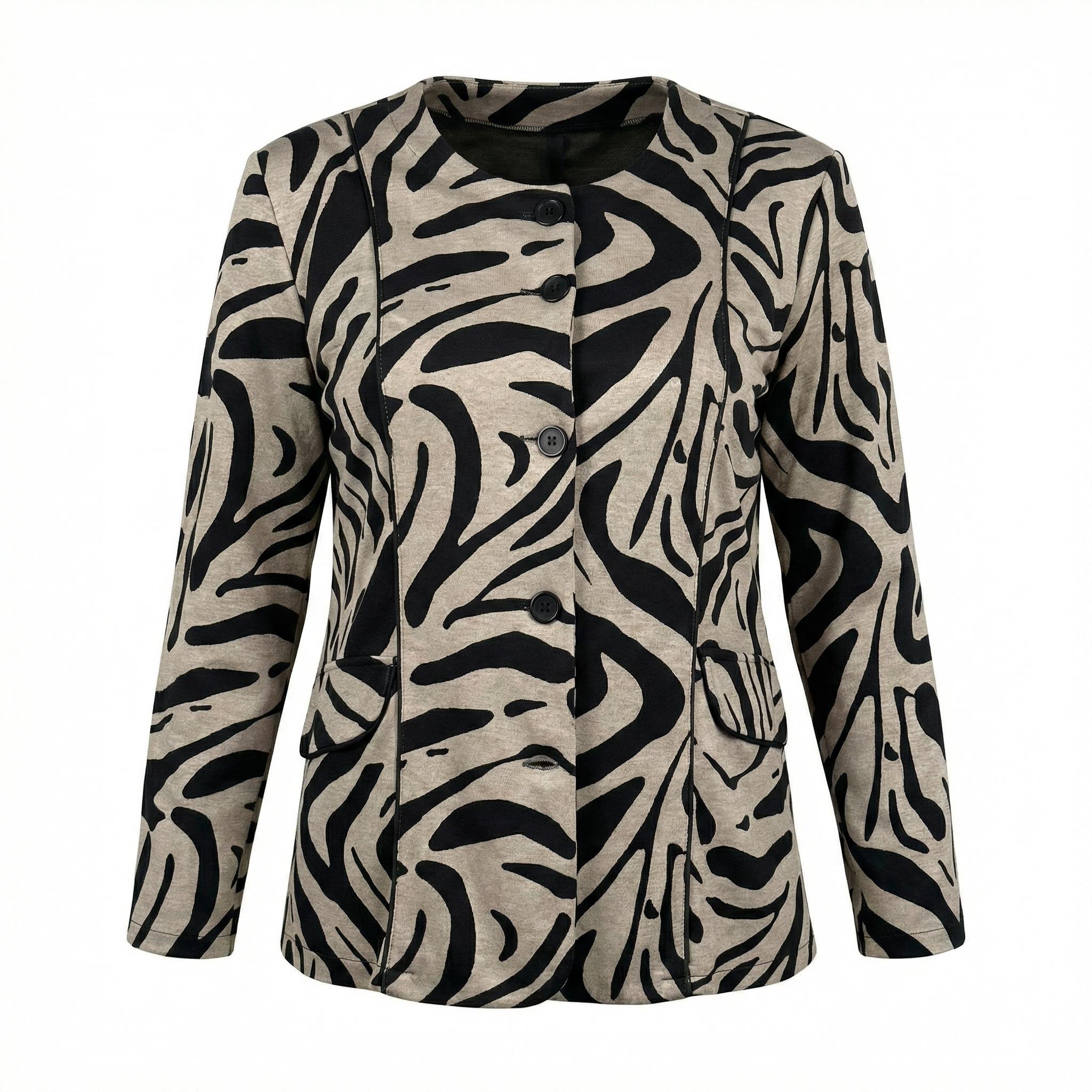 Добавете нотка изисканост към гардероба си с това стилно дамско сако в макси размер, създадено да осигури безупречна визия и комфорт. Моделът се отличава с елегантно обло деколте и красив десен в бежовата гама, който придава индивидуалност на класическия силует. Изработено от мека и приятна на допир материя с високо съдържание на вискоза, сакото позволява на кожата да диша, а добавеният еластан гарантира свобода на движенията. Правата кройка пада тежко и елегантно, подчертавайки женствеността на фигурата без да очертава излишно. Закопчаването с копчета и декоративните джобове завършват модерната визия, правейки модела отличен избор както за деловото ежедневие, така и за специални поводи през есенно-зимния сезон.