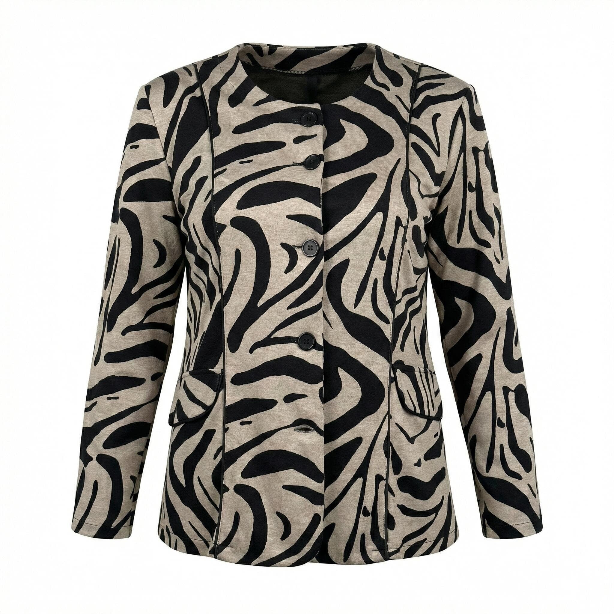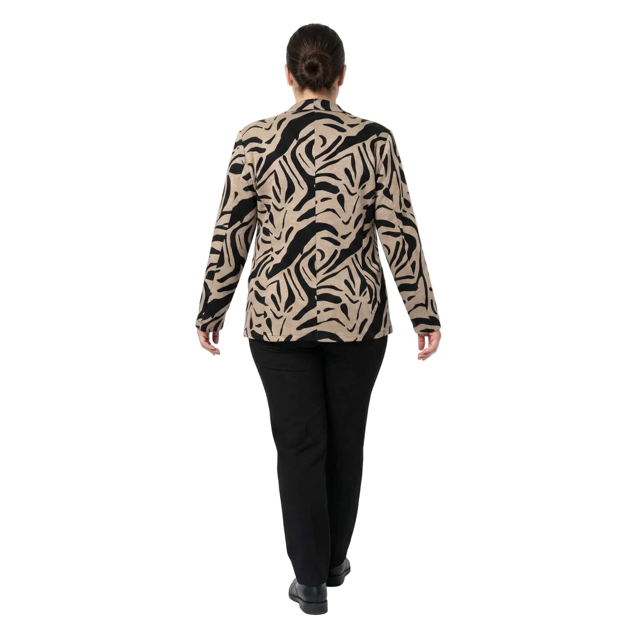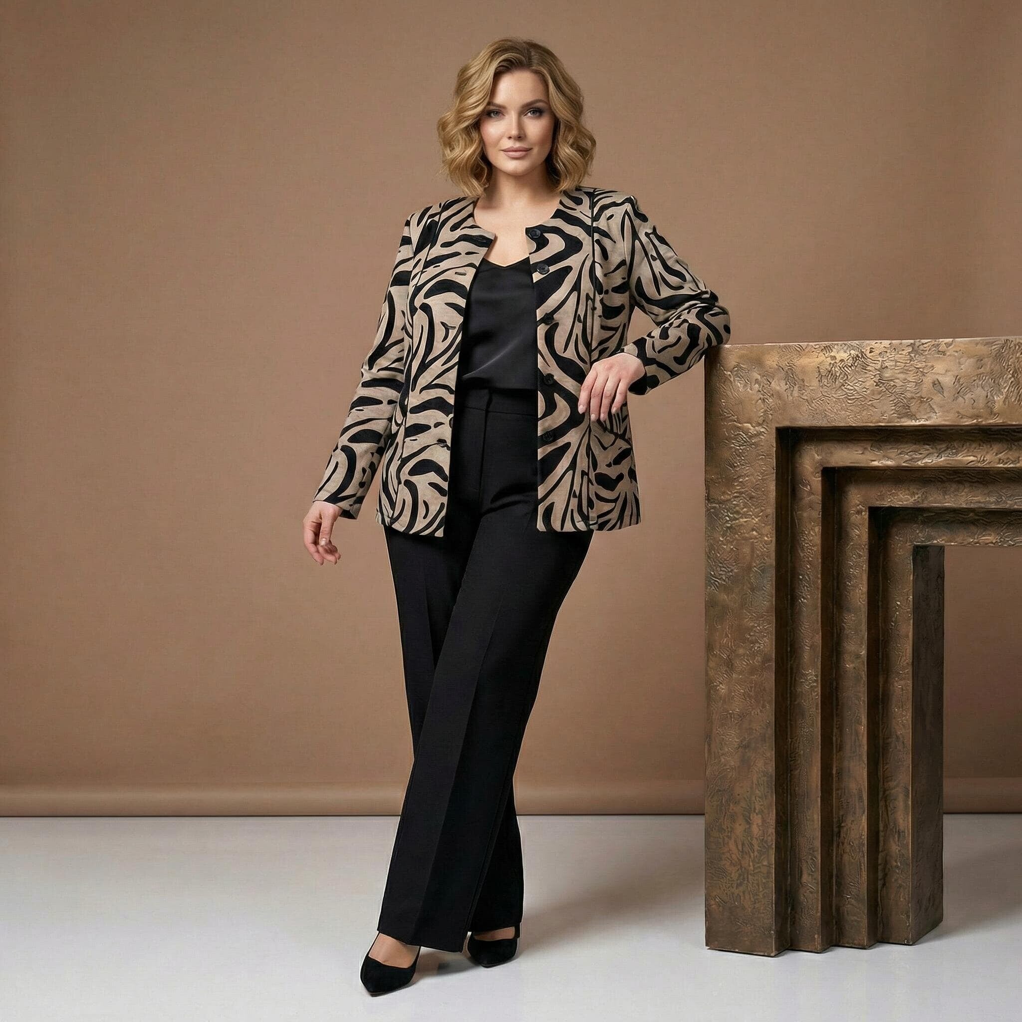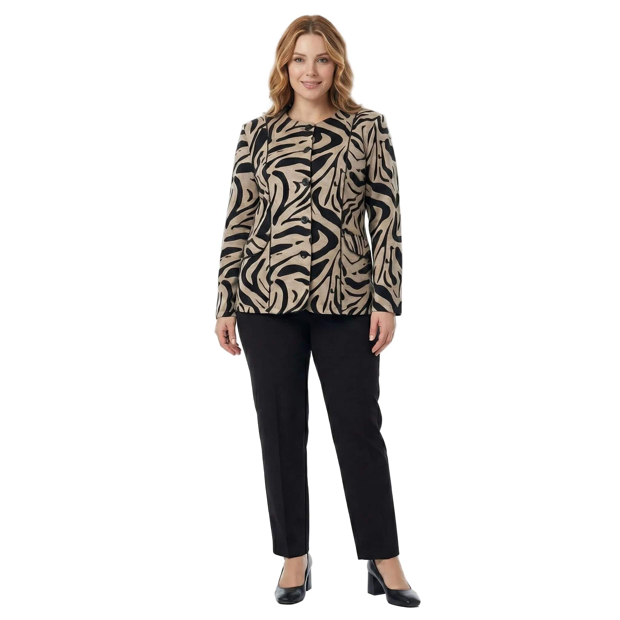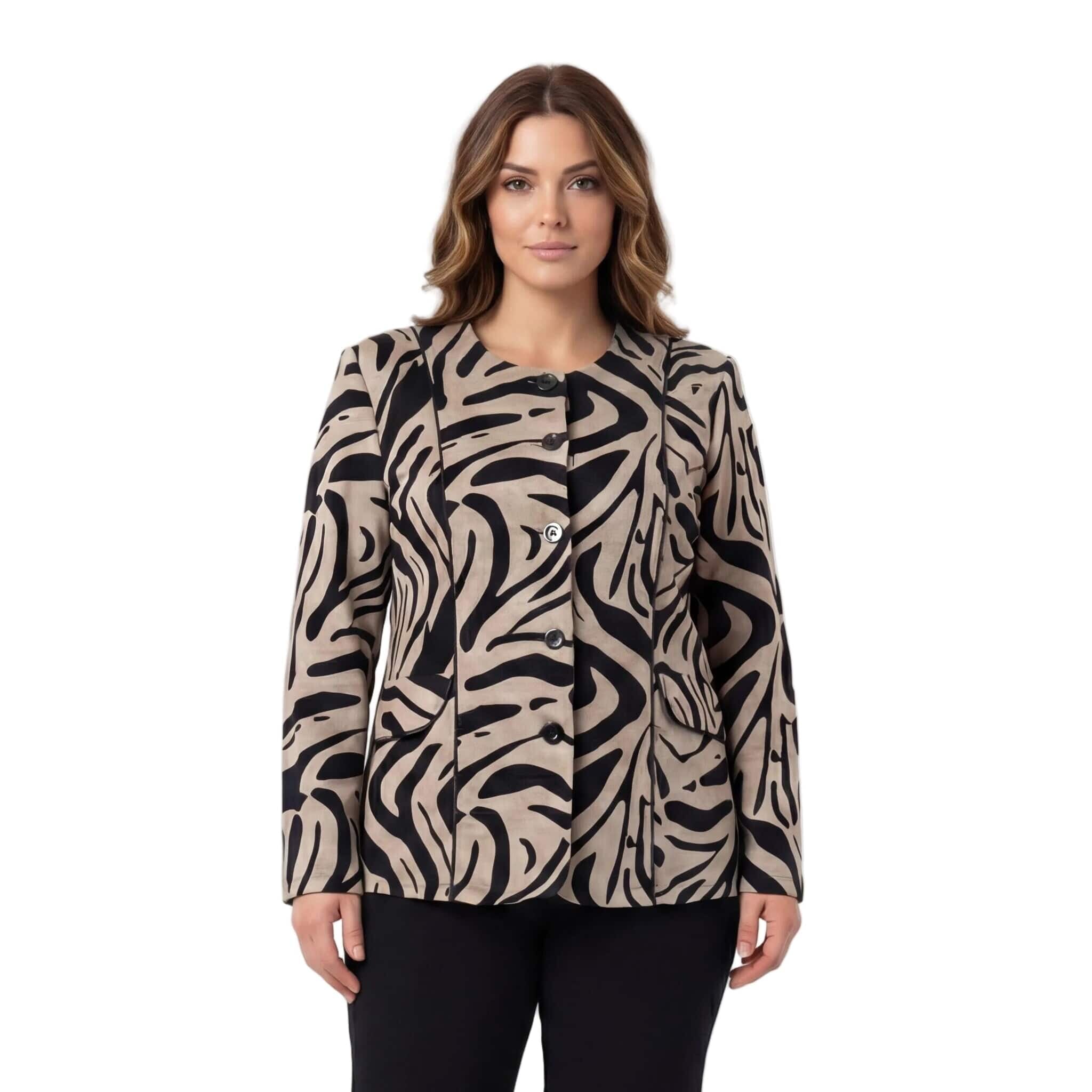 Adăugați o notă de rafinament garderobei dumneavoastră cu această jachetă elegantă de damă, mărime plus, concepută pentru a oferi un aspect impecabil și confort. Modelul are un decolteu rotund elegant și un model frumos în nuanțe de bej, care adaugă individualitate siluetei clasice. Confecționată dintr-un material moale și plăcut la atingere, cu un conținut ridicat de viscoză, jacheta permite pielii să respire, iar elastanul adăugat garantează libertatea de mișcare. Croiala dreaptă cade greu și elegant, subliniind feminitatea siluetei fără a o contura inutil. Închiderea cu nasturi și buzunarele decorative completează aspectul modern, făcând din acest model o alegere excelentă atât pentru viața de zi cu zi, cât și pentru ocazii speciale în sezonul toamnă-iarnă.