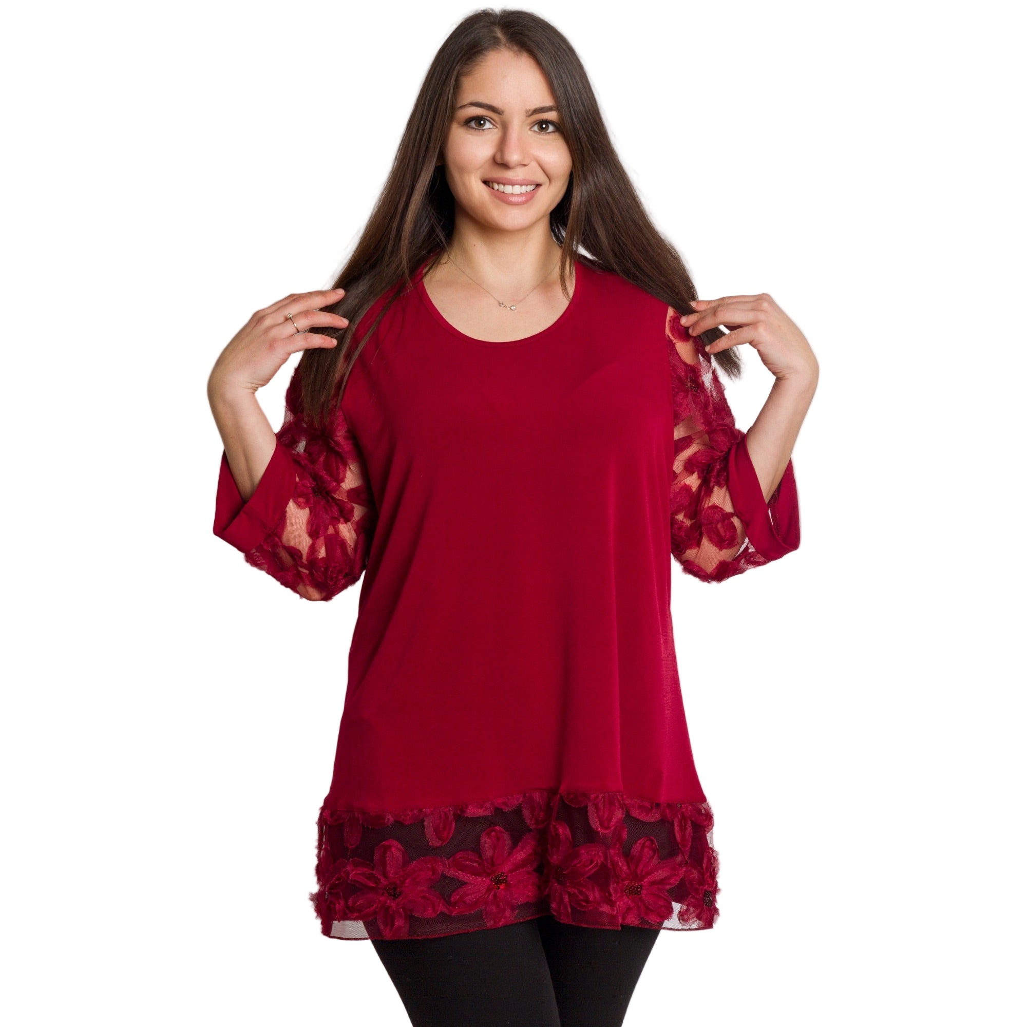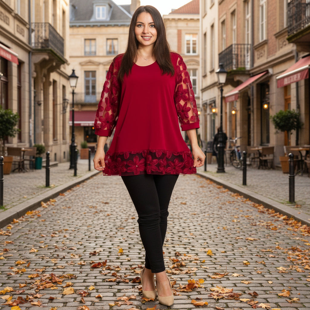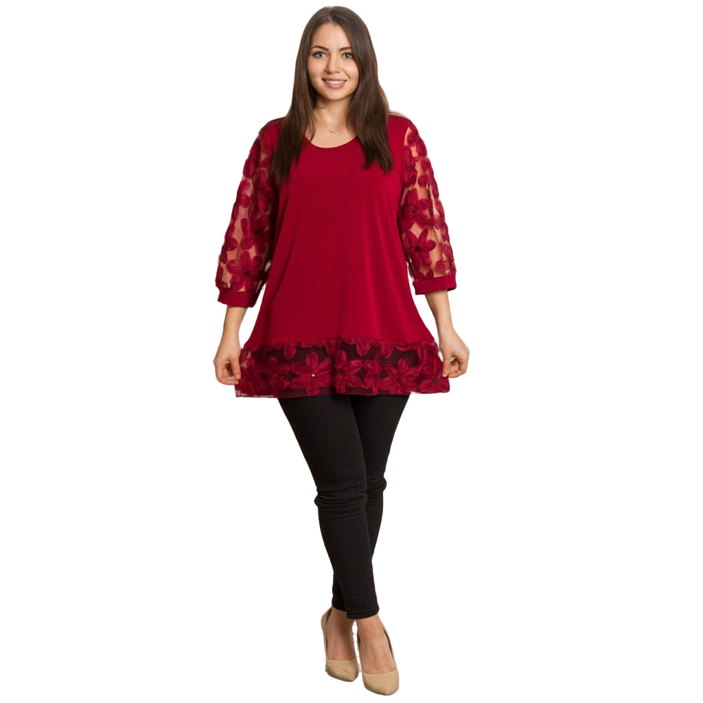 Тази елегантна официална туника в бордо съчетава класическа линия с изразителни детайли. Моделът е с права кройка, която осигурява комфорт и красиво пада по тялото. Облото деколте създава мек и женствен завършек, а 3/4 ръкавите от фина дантела с флорален релеф придават изящество и стил. Декоративната дантелена апликация в долната част добавя завършен и луксозен акцент. Подходяща е за официални поводи, празнични събития и вечерни излизания през есенно-зимния сезон.