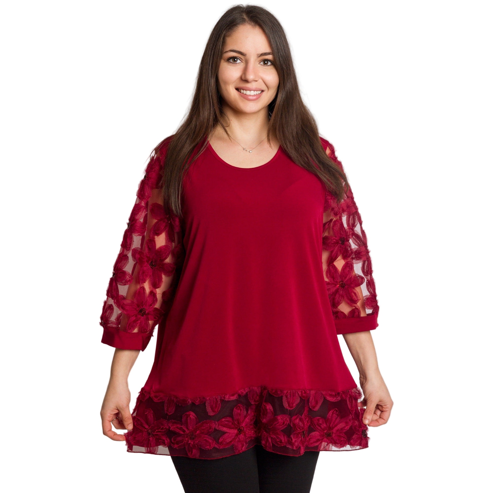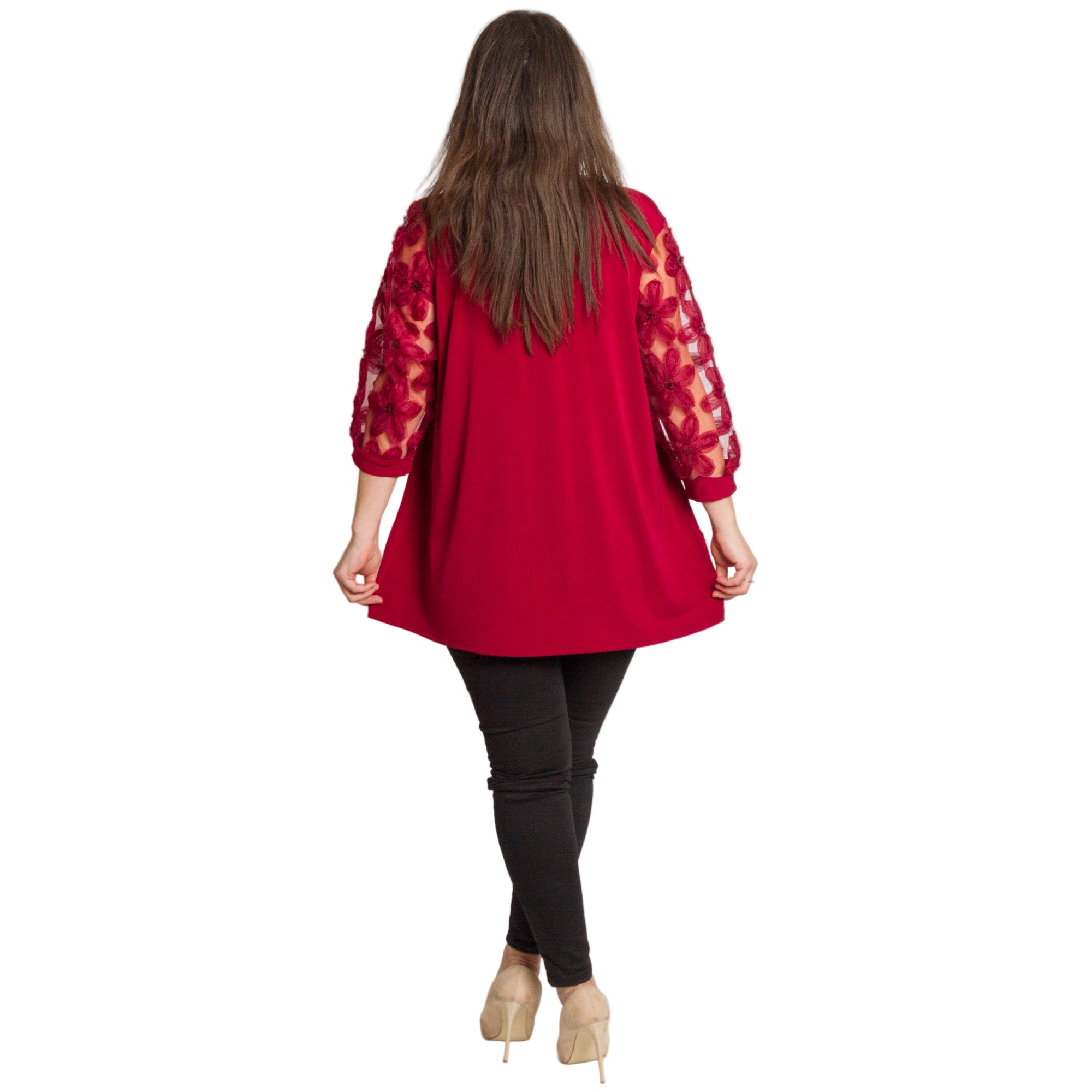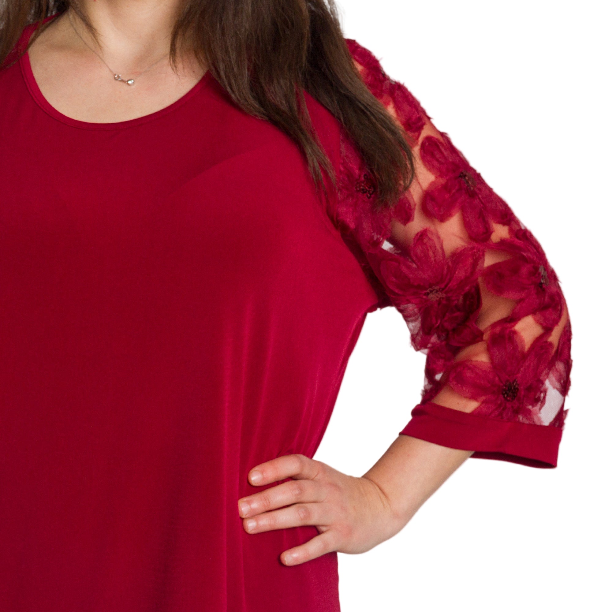 Тази елегантна официална туника в бордо съчетава класическа линия с изразителни детайли. Моделът е с права кройка, която осигурява комфорт и красиво пада по тялото. Облото деколте създава мек и женствен завършек, а 3/4 ръкавите от фина дантела с флорален релеф придават изящество и стил. Декоративната дантелена апликация в долната част добавя завършен и луксозен акцент. Подходяща е за официални поводи, празнични събития и вечерни излизания през есенно-зимния сезон.