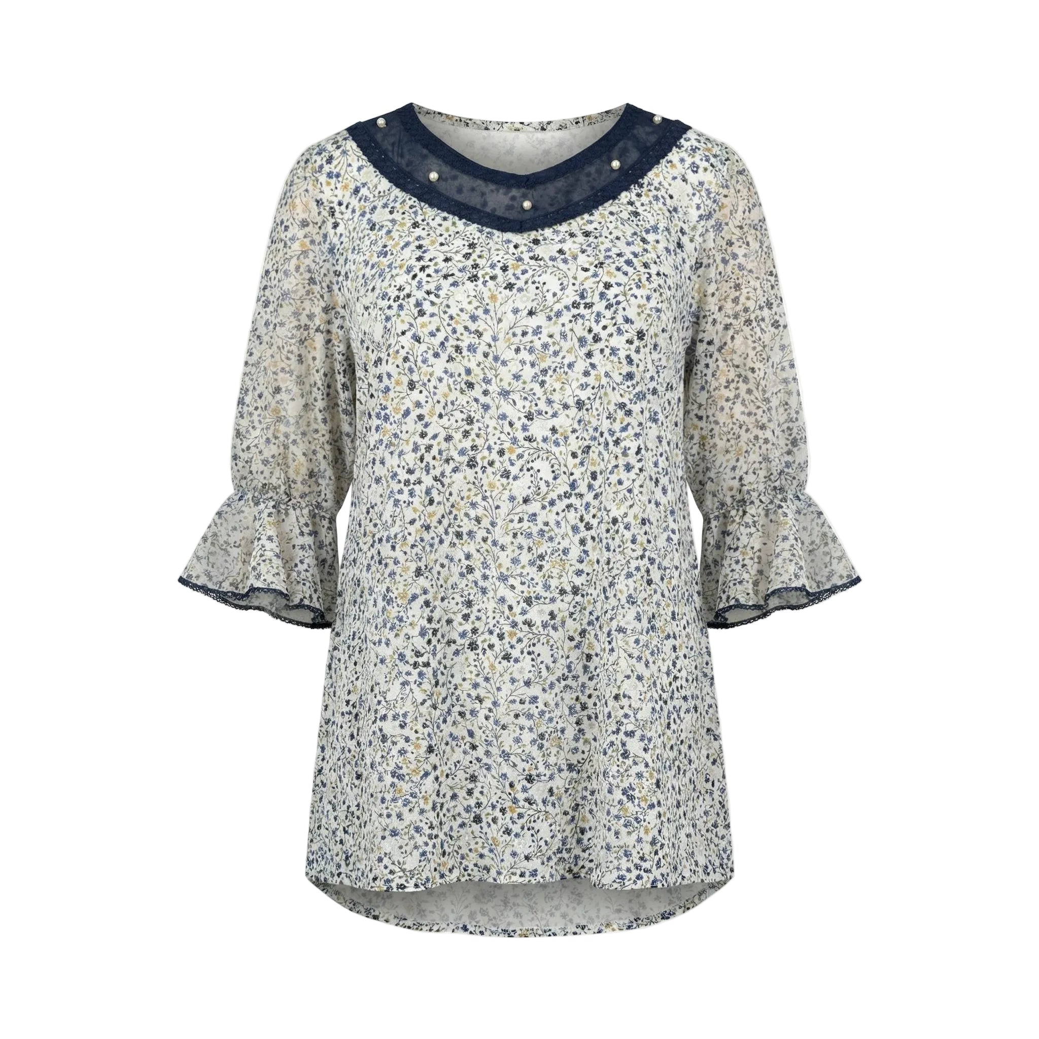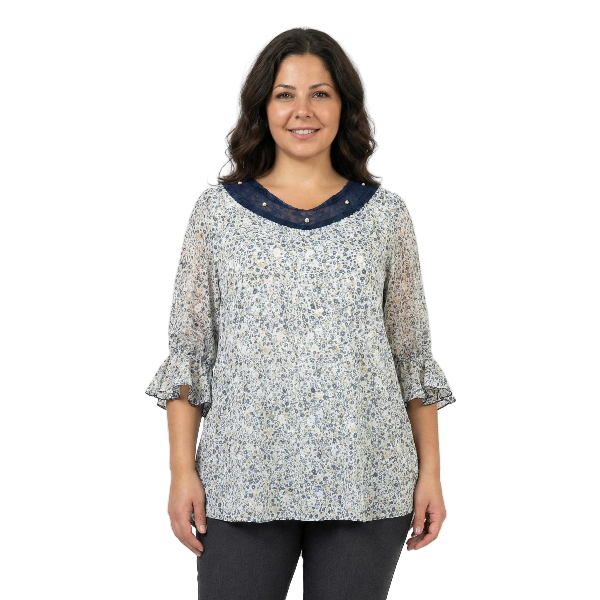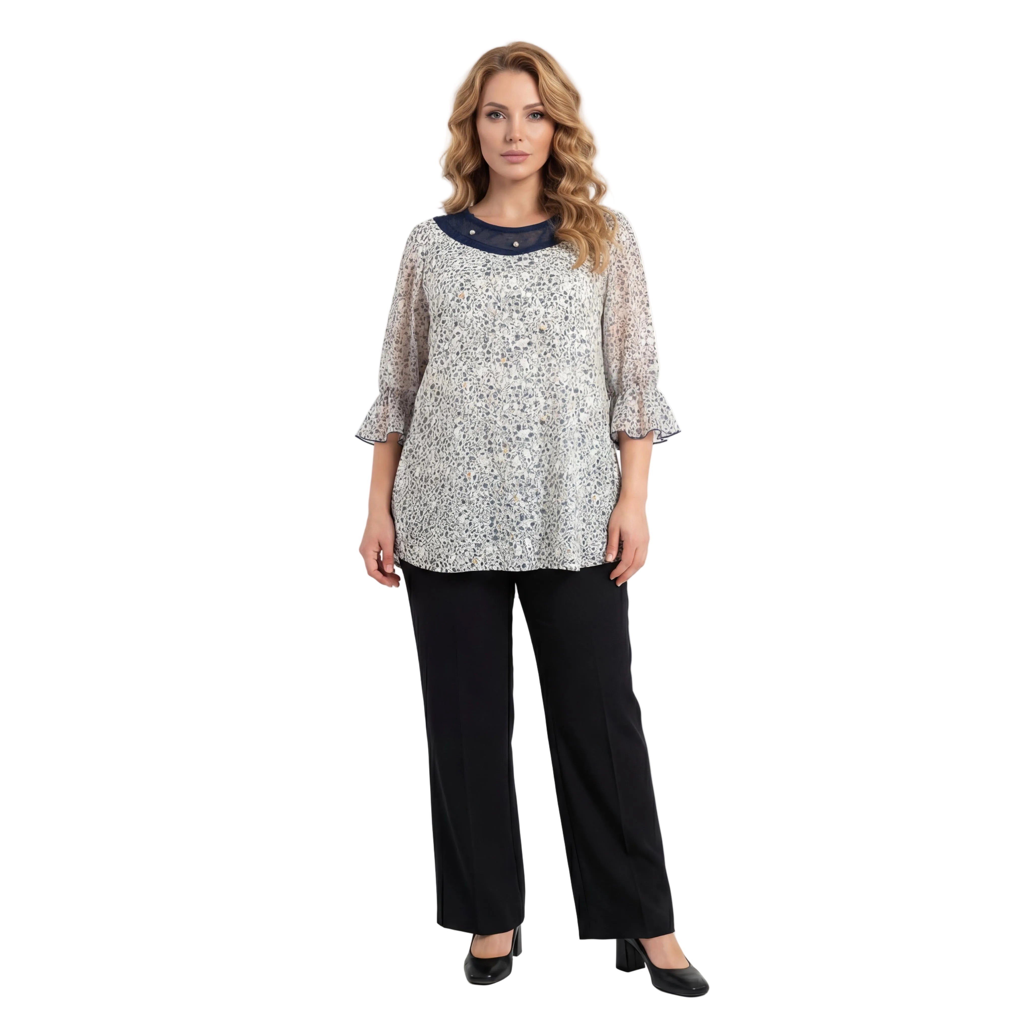 Открийте идеалния баланс между елегантност и комфорт с тази официална бяла макси туника, обсипана с нежен флорален десен. Моделът е създаден специално за дами с вкус, съчетавайки класическа разкроена линия с модерни акценти. Впечатляващото деколте е богато украсено с перли и фина платка от тюл, което придава изключително луксозно и женствено излъчване. Туниката е изработена от лека и приятна на допир материя с еластичност, която пада тежко и красиво, без да описва фигурата. Ръкавите са с дължина 7/8, завършващи с кокетни волани, а асиметричният подгъв добавя нотка на съвременен шик. Този модел е перфектният избор за официални поводи, семейни празници или стилно ежедневие през пролетта и лятото.