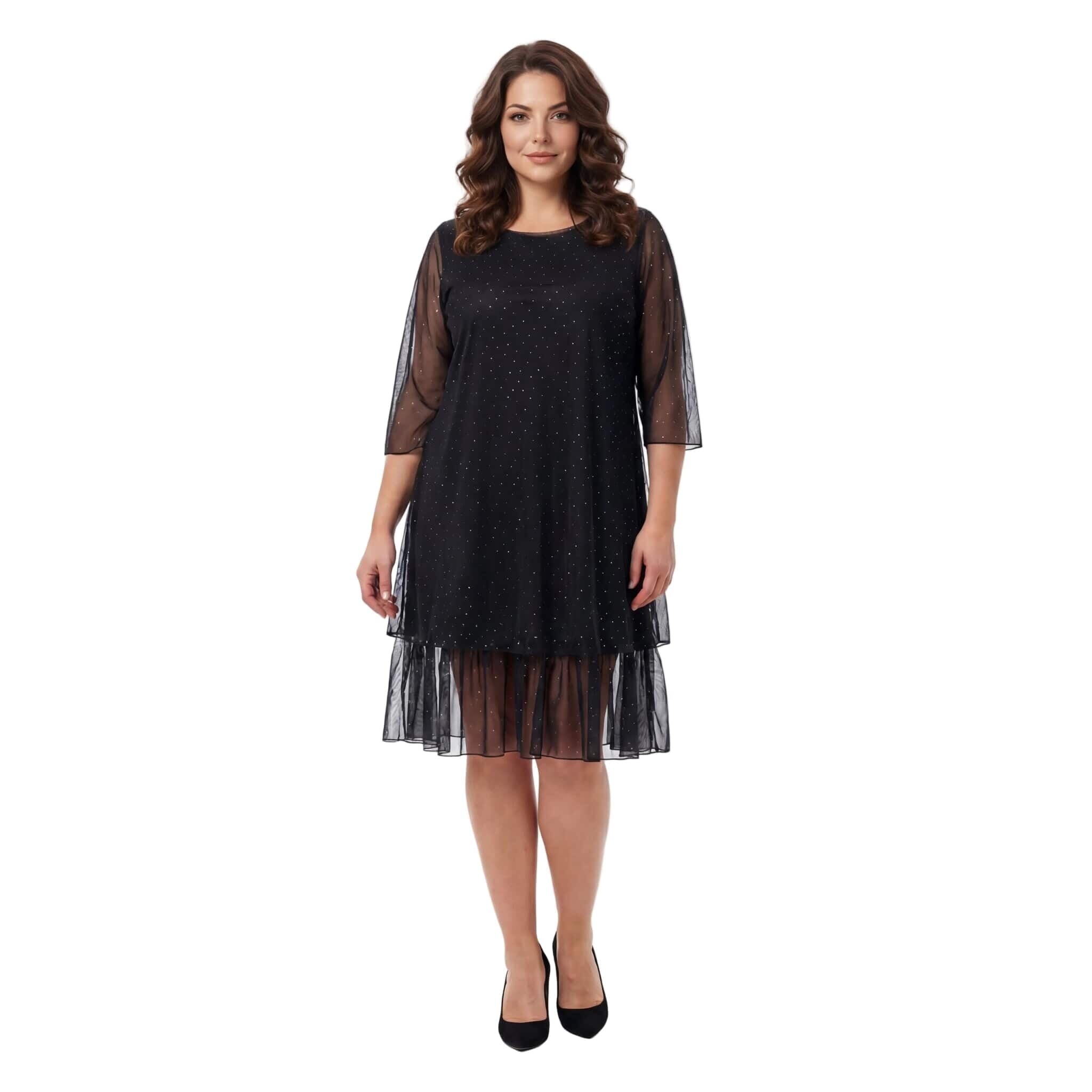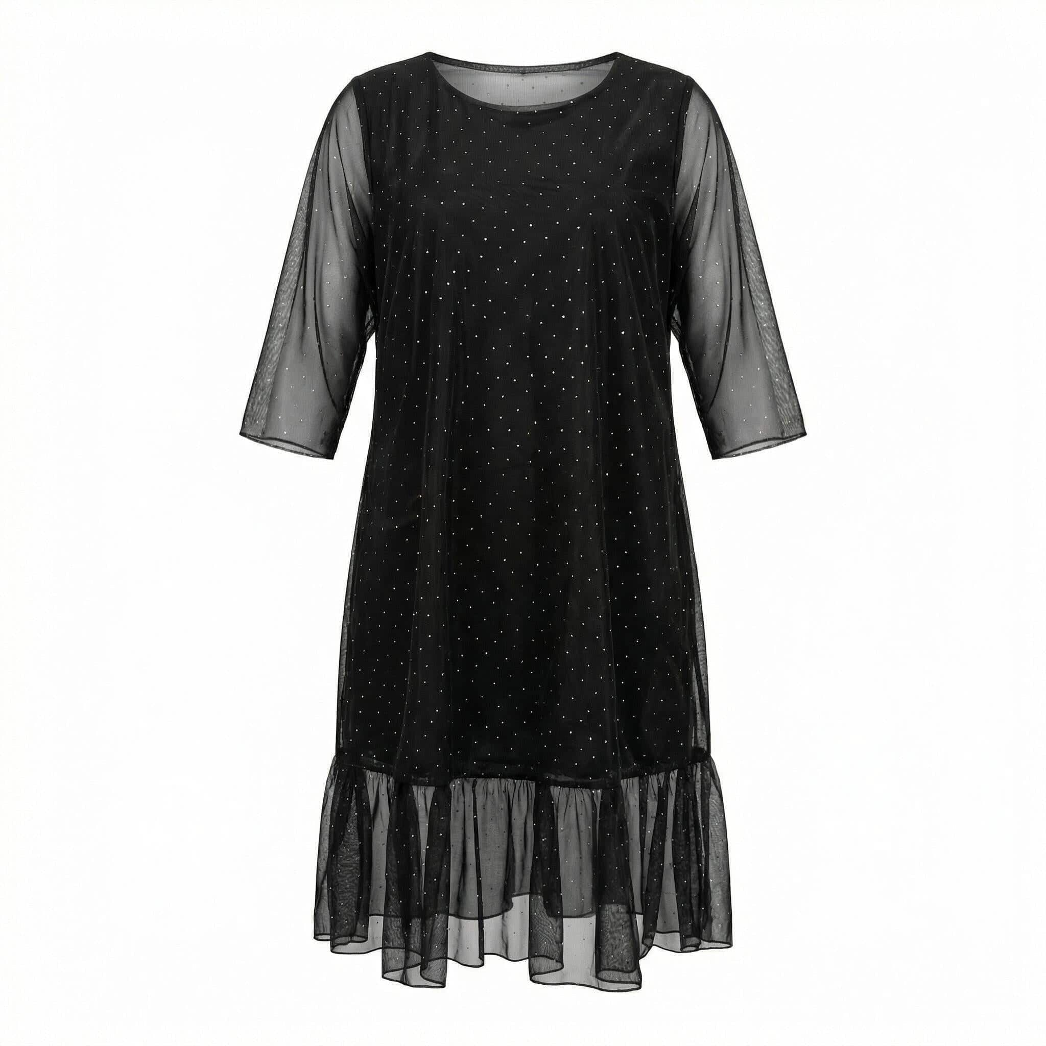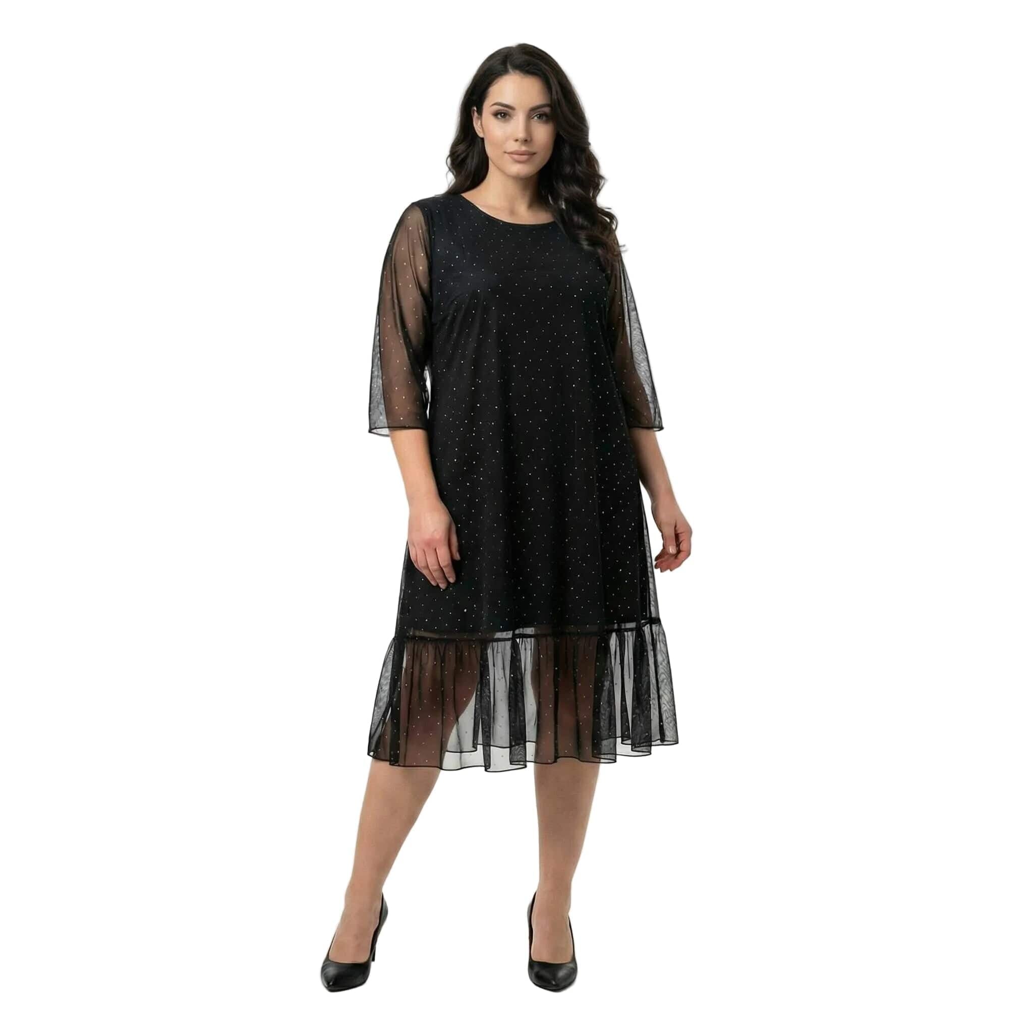 Rochie maxi oficială evazată neagră din șifon cu pietre și mâneci 7/8