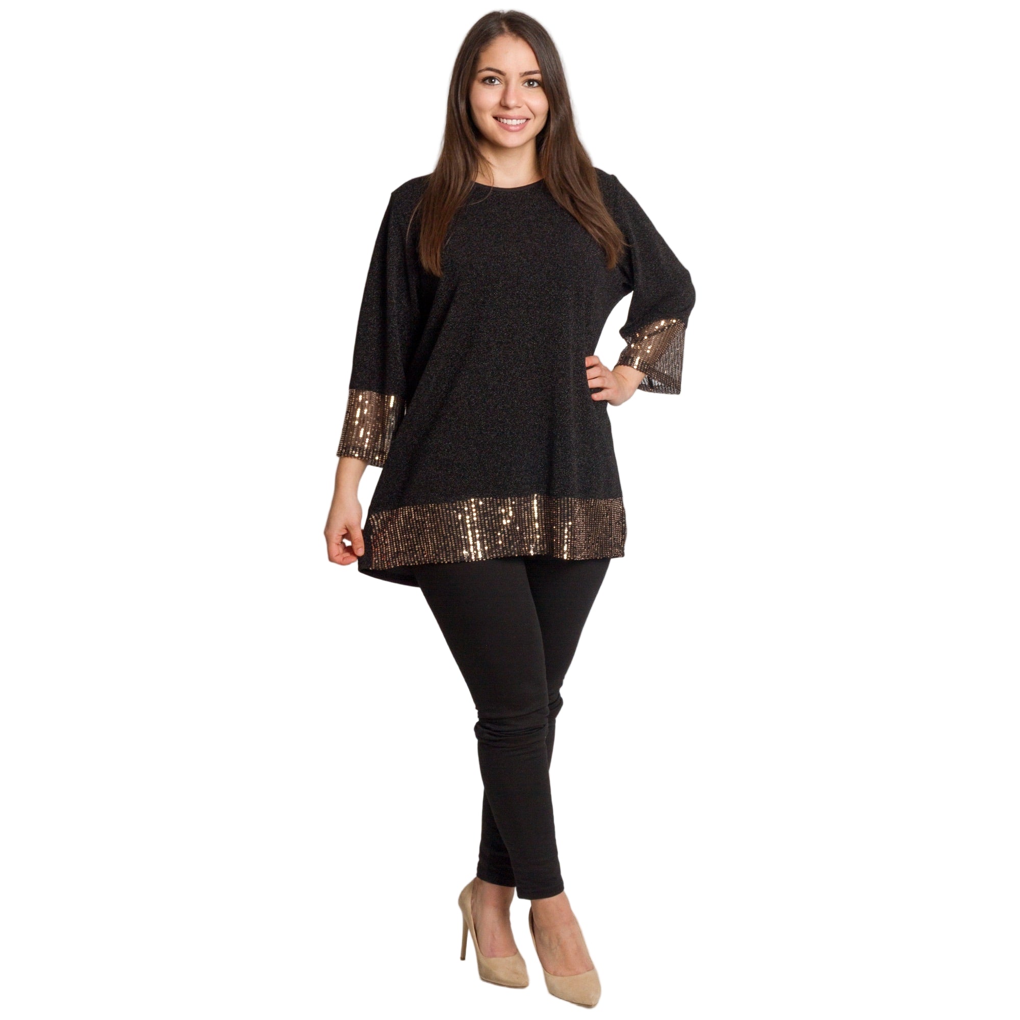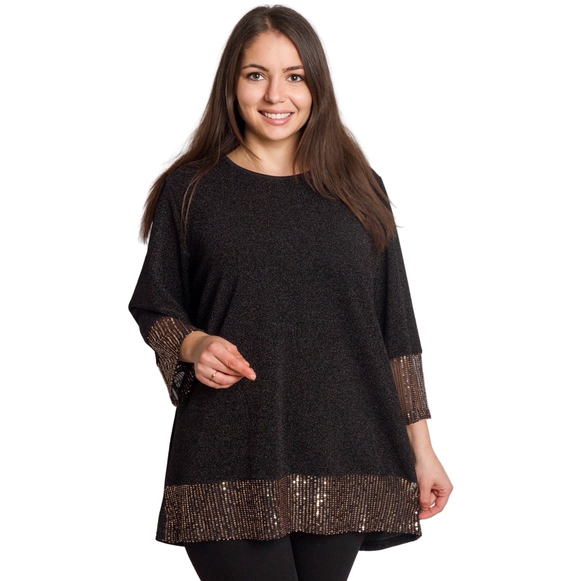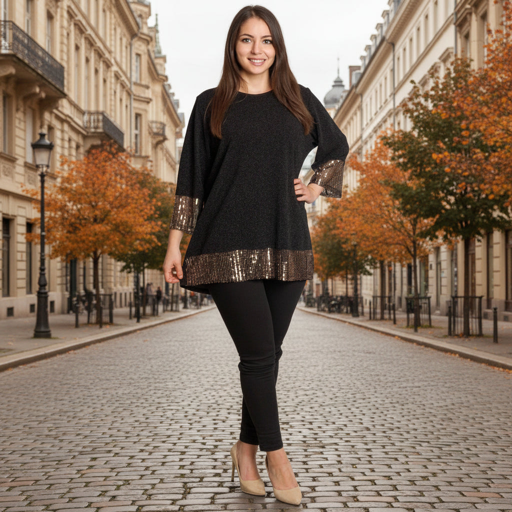 Тази стилна официална туника в черен цвят впечатлява с изчистен силует и ефектни пайетени детайли. Моделът е с права кройка, която осигурява комфорт и издължава визуално фигурата. Облото деколте придава класически и елегантен завършек, а 3/4 ръкавите с пайетен маншет добавят блясък и празнично излъчване. Декоративният пайетен кант в долната част подчертава линията и прави модела изключително подходящ за официални поводи през есенно-зимния сезон.