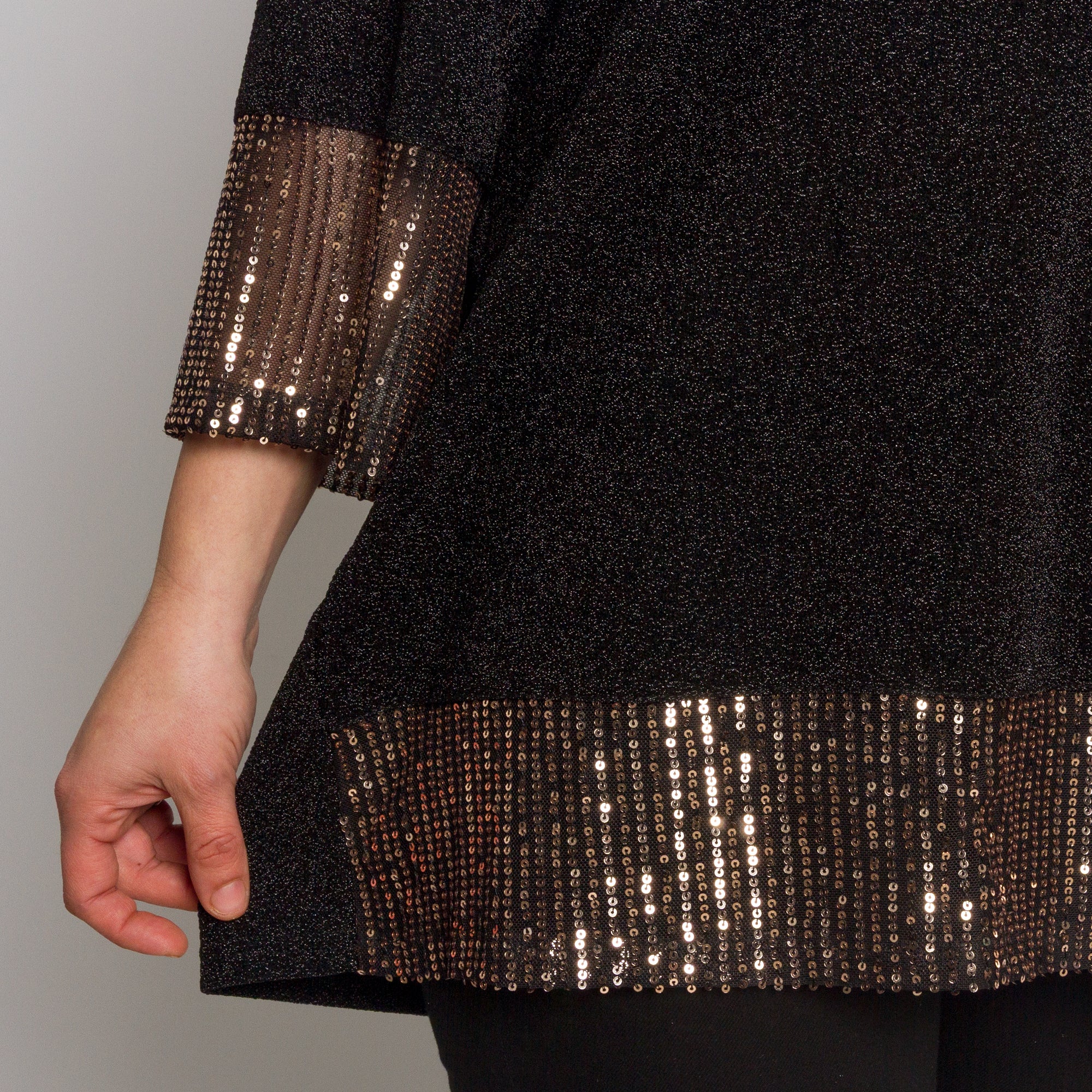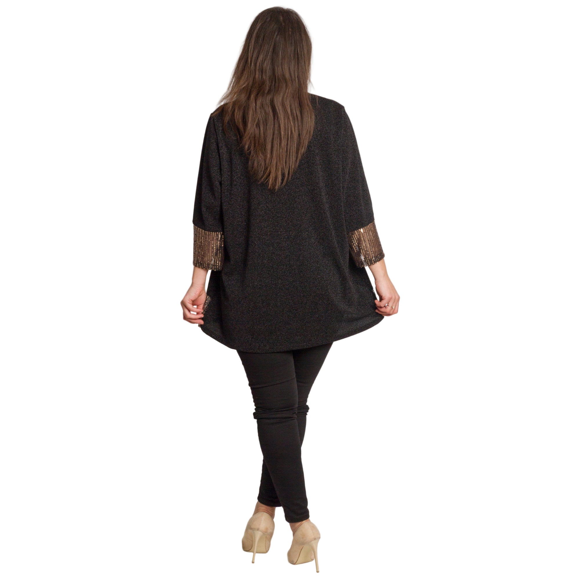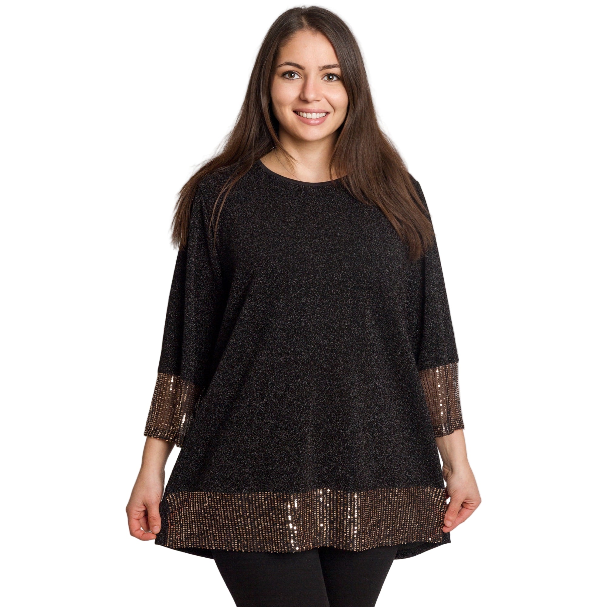 Тази стилна официална туника в черен цвят впечатлява с изчистен силует и ефектни пайетени детайли. Моделът е с права кройка, която осигурява комфорт и издължава визуално фигурата. Облото деколте придава класически и елегантен завършек, а 3/4 ръкавите с пайетен маншет добавят блясък и празнично излъчване. Декоративният пайетен кант в долната част подчертава линията и прави модела изключително подходящ за официални поводи през есенно-зимния сезон.