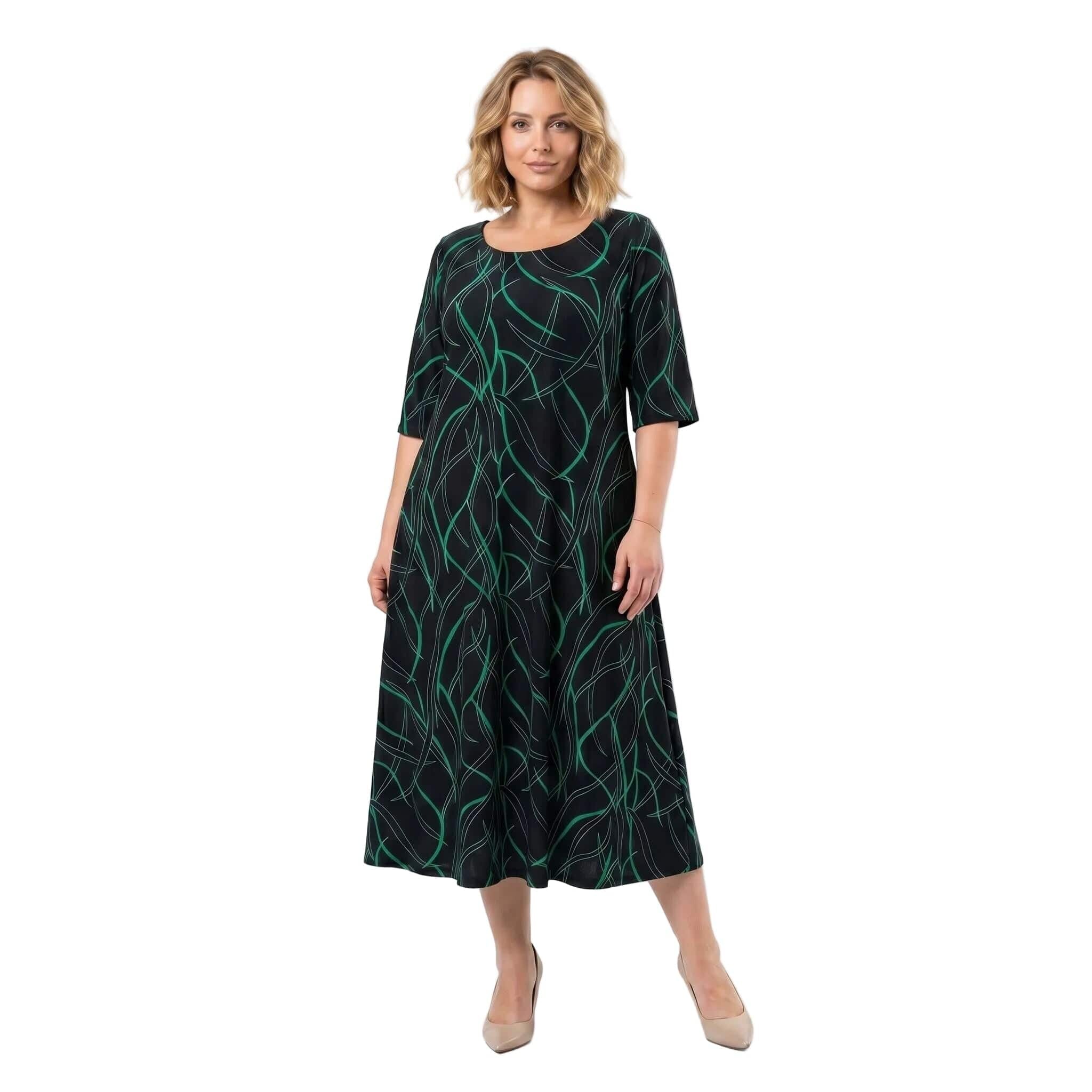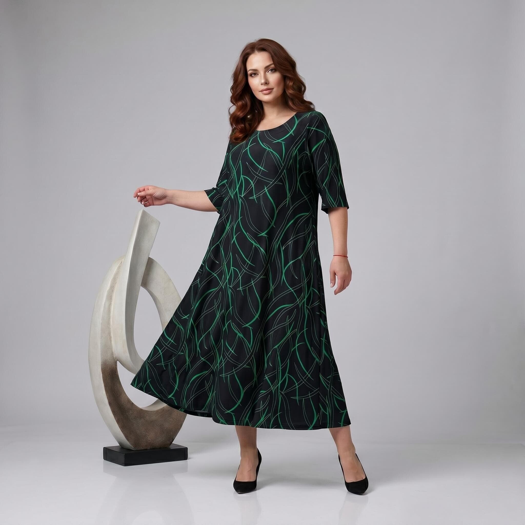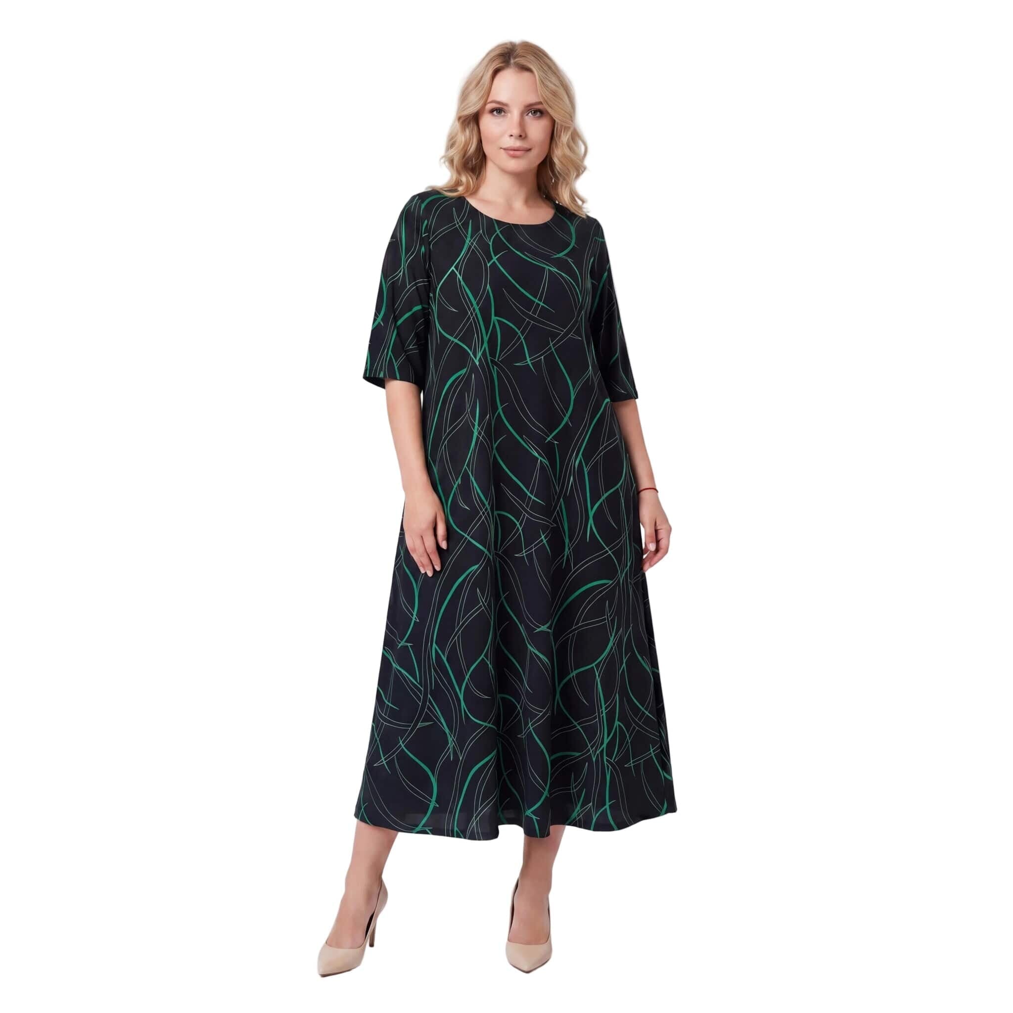 Открийте перфектния баланс между стил и комфорт с тази дълга официална макси рокля. Моделът се отличава с елегантен разкроен А-силует, който пада тежко и гладко по тялото, осигурявайки невероятна свобода на движение. Изработена от лека и еластична лятна материя с матово покритие и фин блясък, роклята е създадена да подчертава женствеността. Завладяващият черен десен е освежен с модерен абстрактен линеен принт в зелено. С дължина до глезена, къси ръкави и класическо обло деколте, този модел е изключително практичен и универсален избор както за специални поводи, така и за елегантно ежедневие.