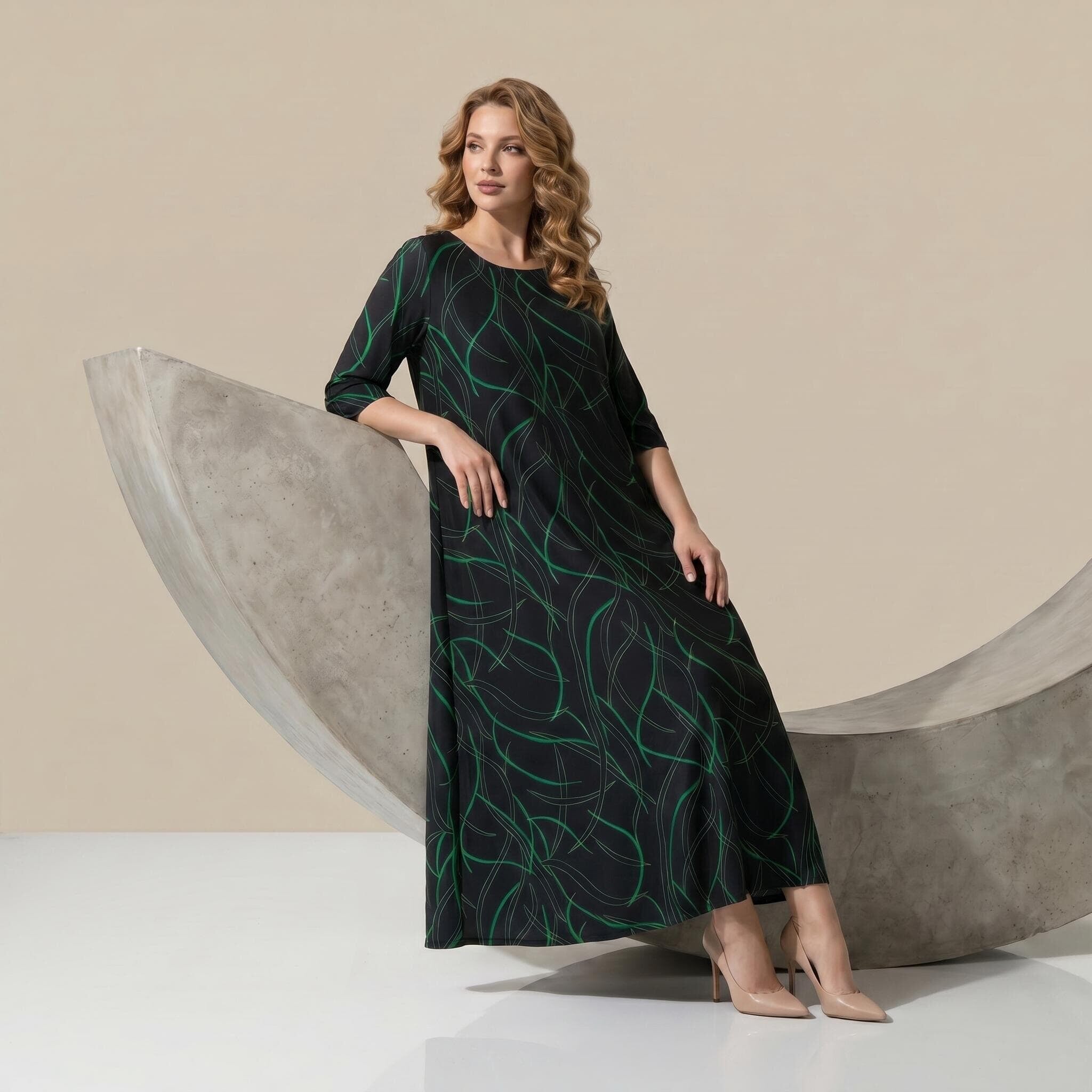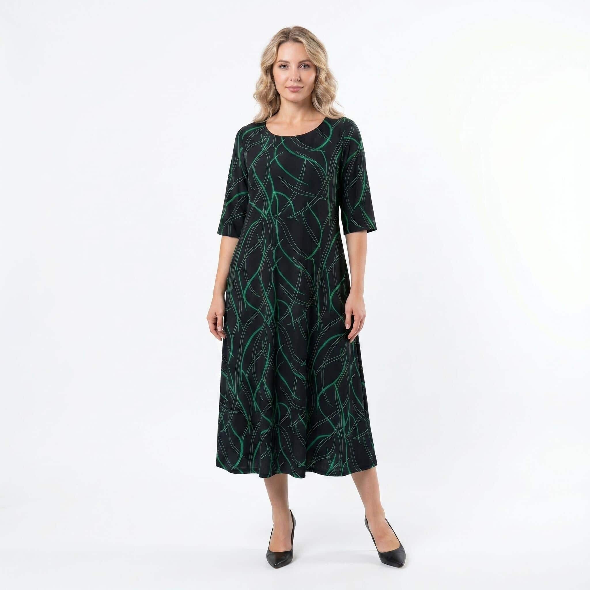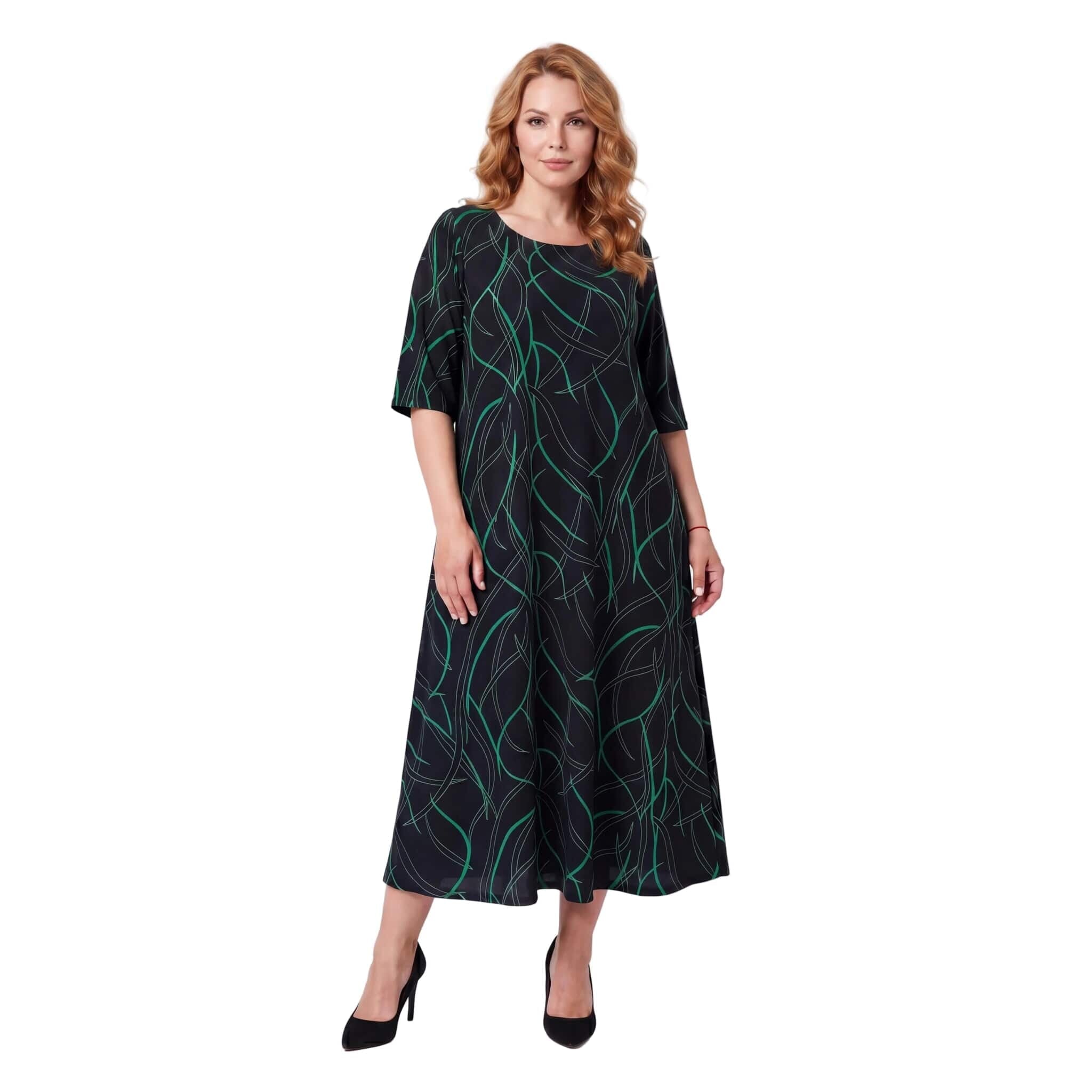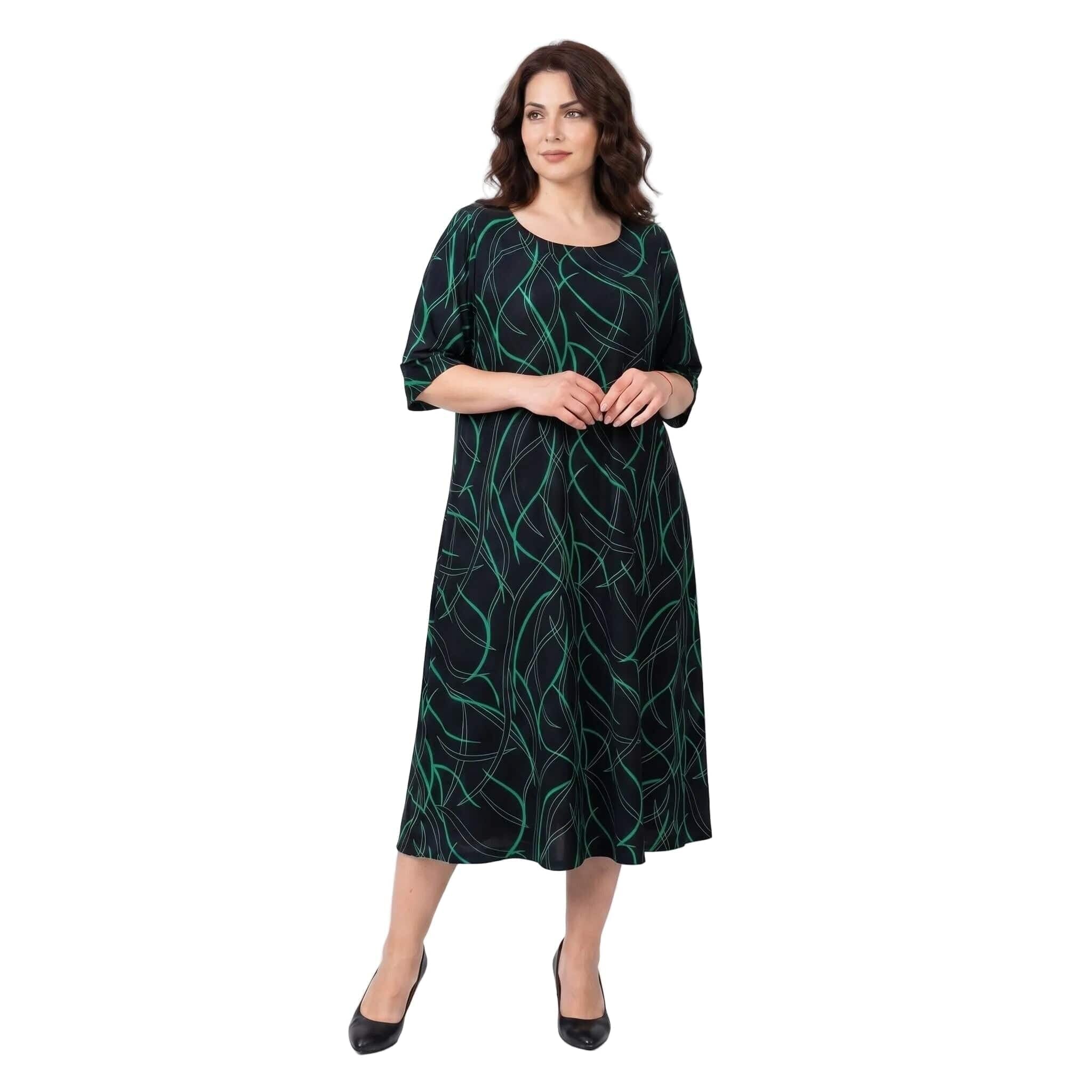 Открийте перфектния баланс между стил и комфорт с тази дълга официална макси рокля. Моделът се отличава с елегантен разкроен А-силует, който пада тежко и гладко по тялото, осигурявайки невероятна свобода на движение. Изработена от лека и еластична лятна материя с матово покритие и фин блясък, роклята е създадена да подчертава женствеността. Завладяващият черен десен е освежен с модерен абстрактен линеен принт в зелено. С дължина до глезена, къси ръкави и класическо обло деколте, този модел е изключително практичен и универсален избор както за специални поводи, така и за елегантно ежедневие.