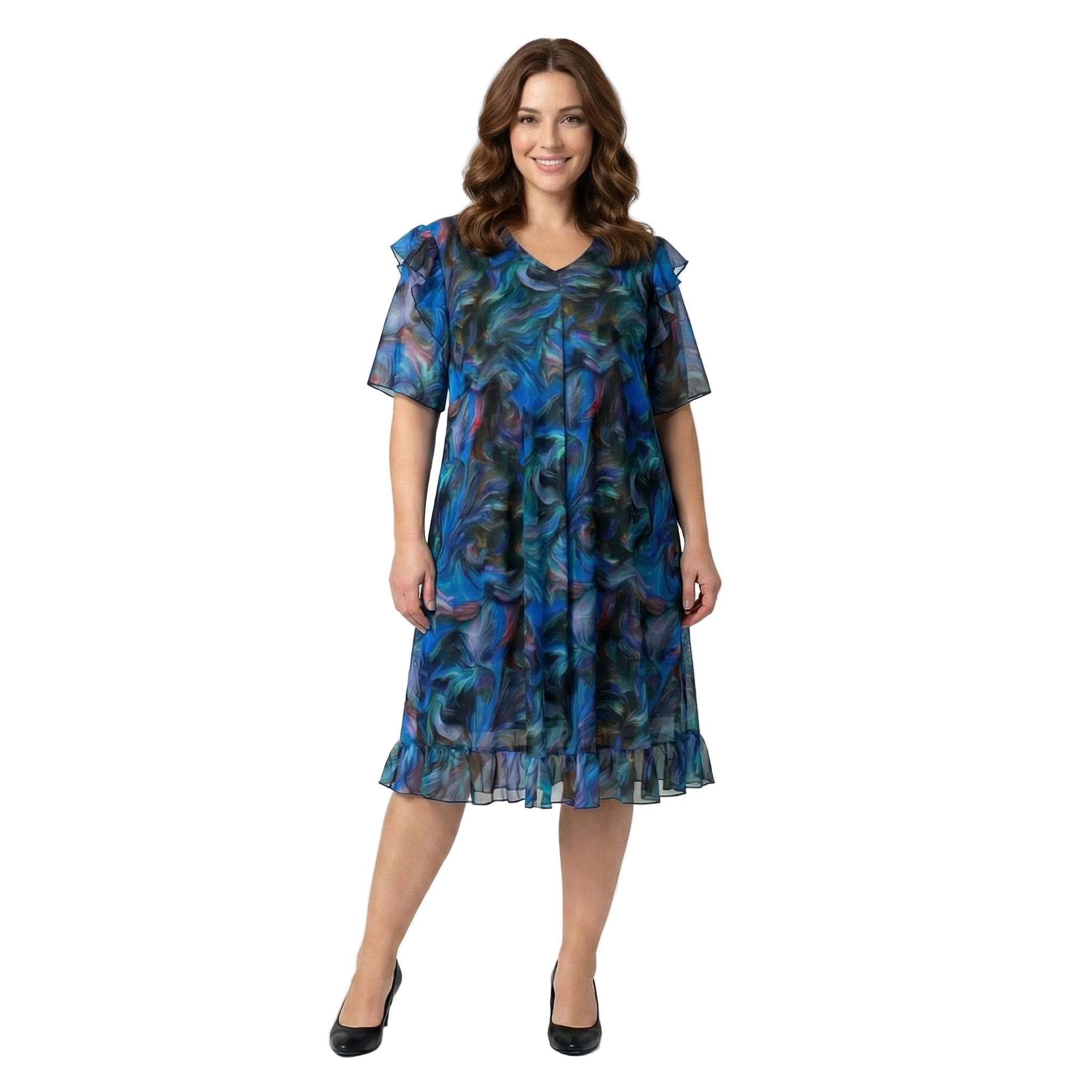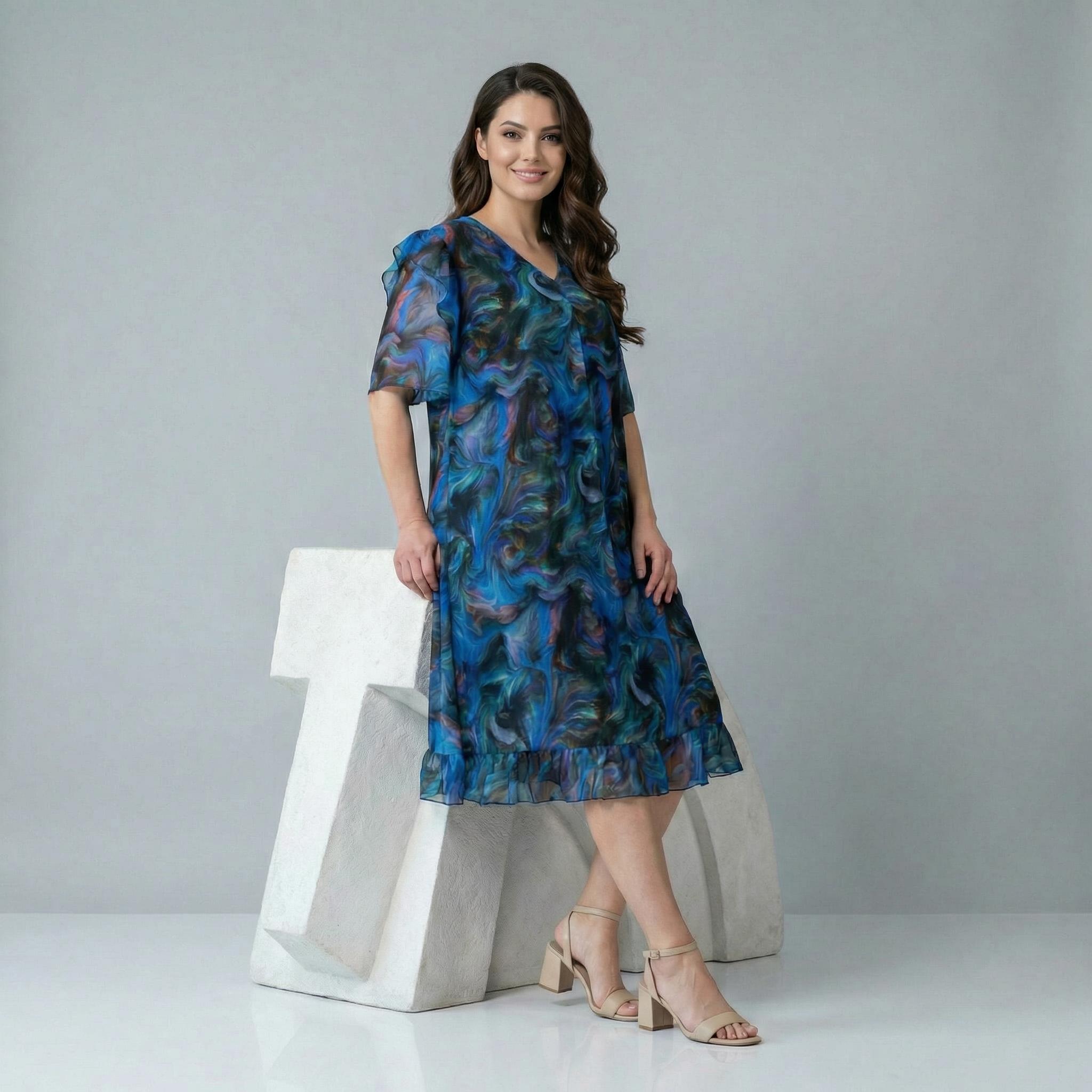 Преобразете визията си за следващия специален повод с тази изящна официална рокля в големи размери. Моделът е създаден, за да подчертае женствеността ви чрез свободна разкроена кройка, която пада елегантно и осигурява несравнимо удобство. Акцентът на дизайна е в ефектните ръкави и горната част от пъстър шифон, които придават лекота и въздушност на силуета. V-образното деколте издължава визуално фигурата, а дължината под коляното добавя класа и стил. Роклята разполага с мека подплата и е изработена от материя с високо съдържание на памук, което я прави отличен избор за пролетно-летния сезон.