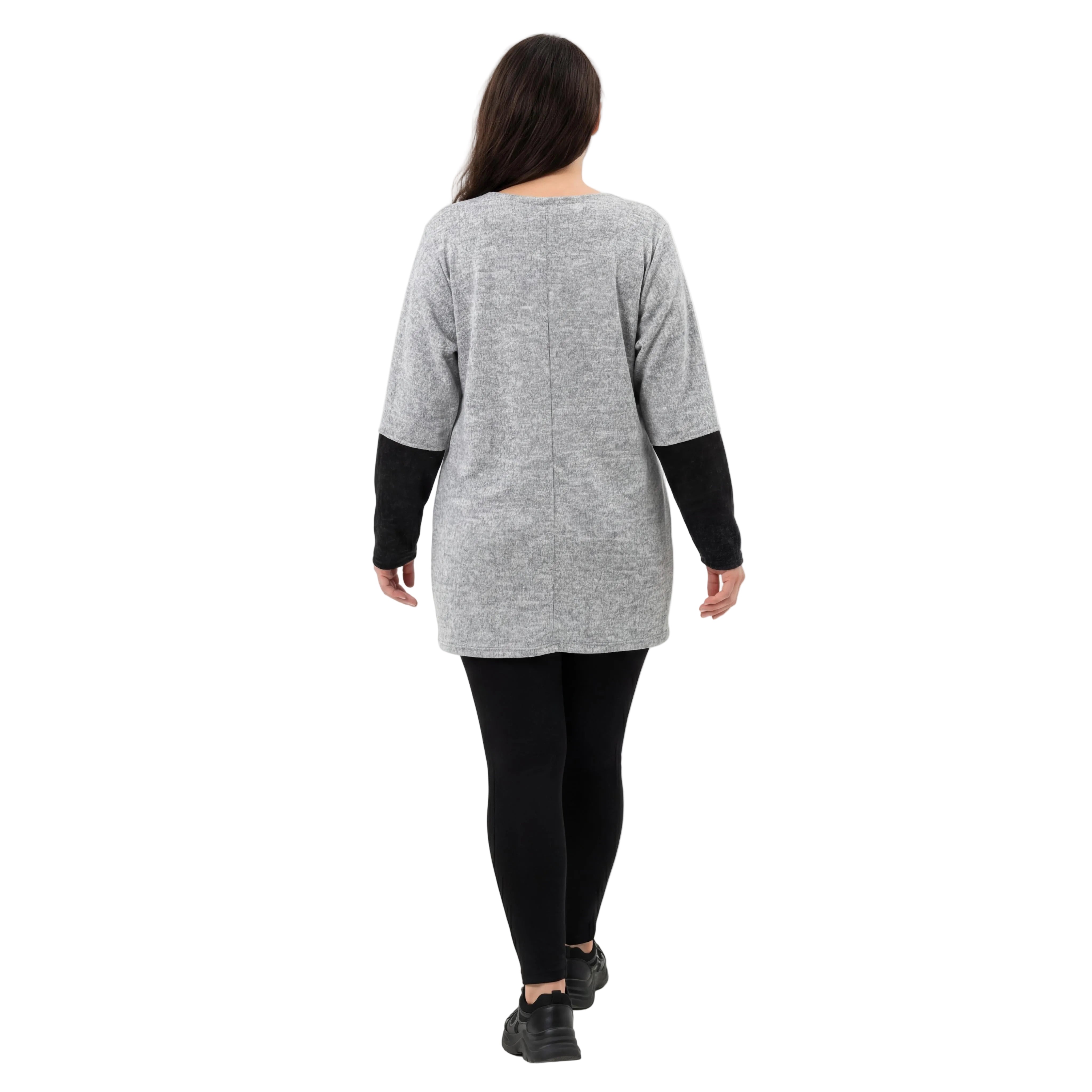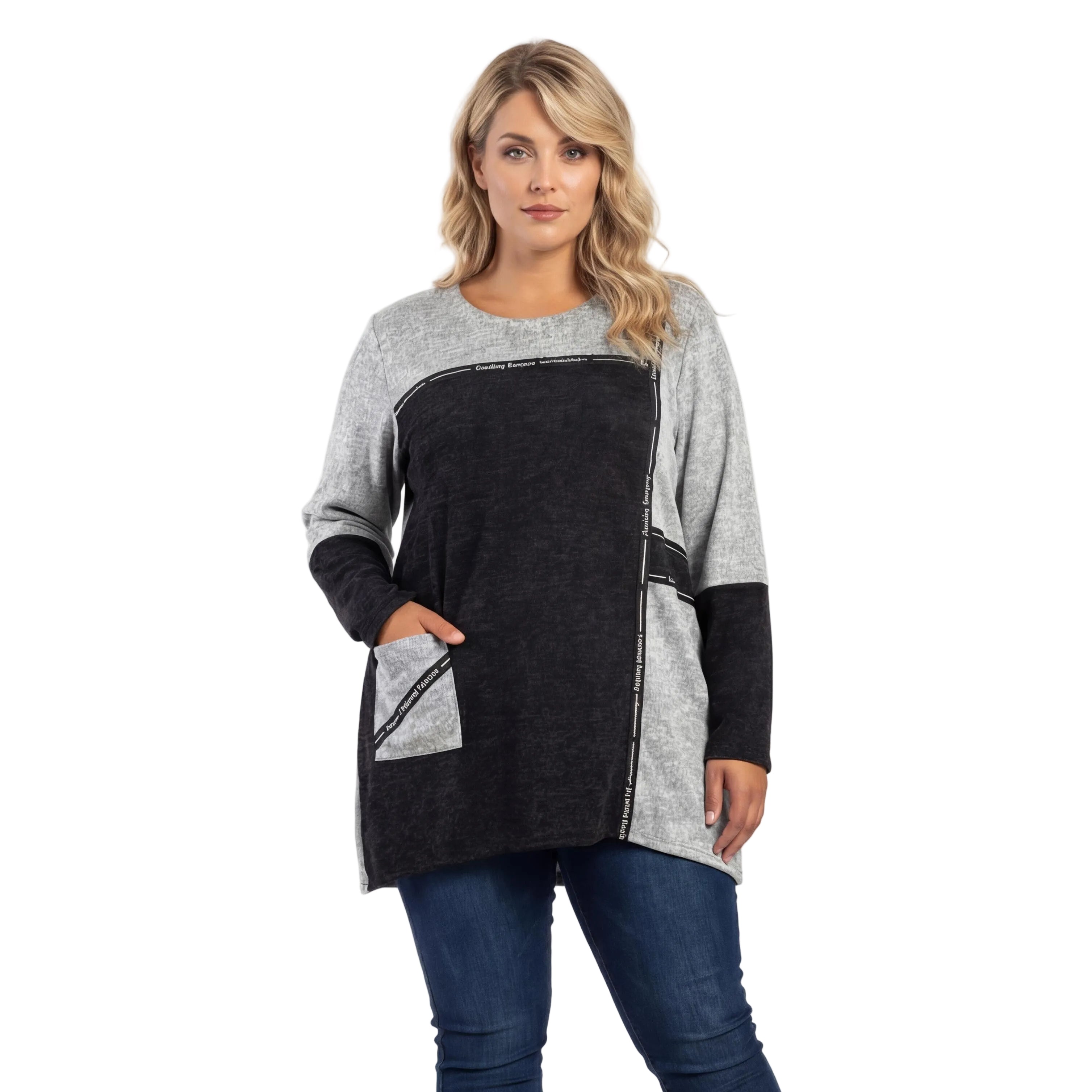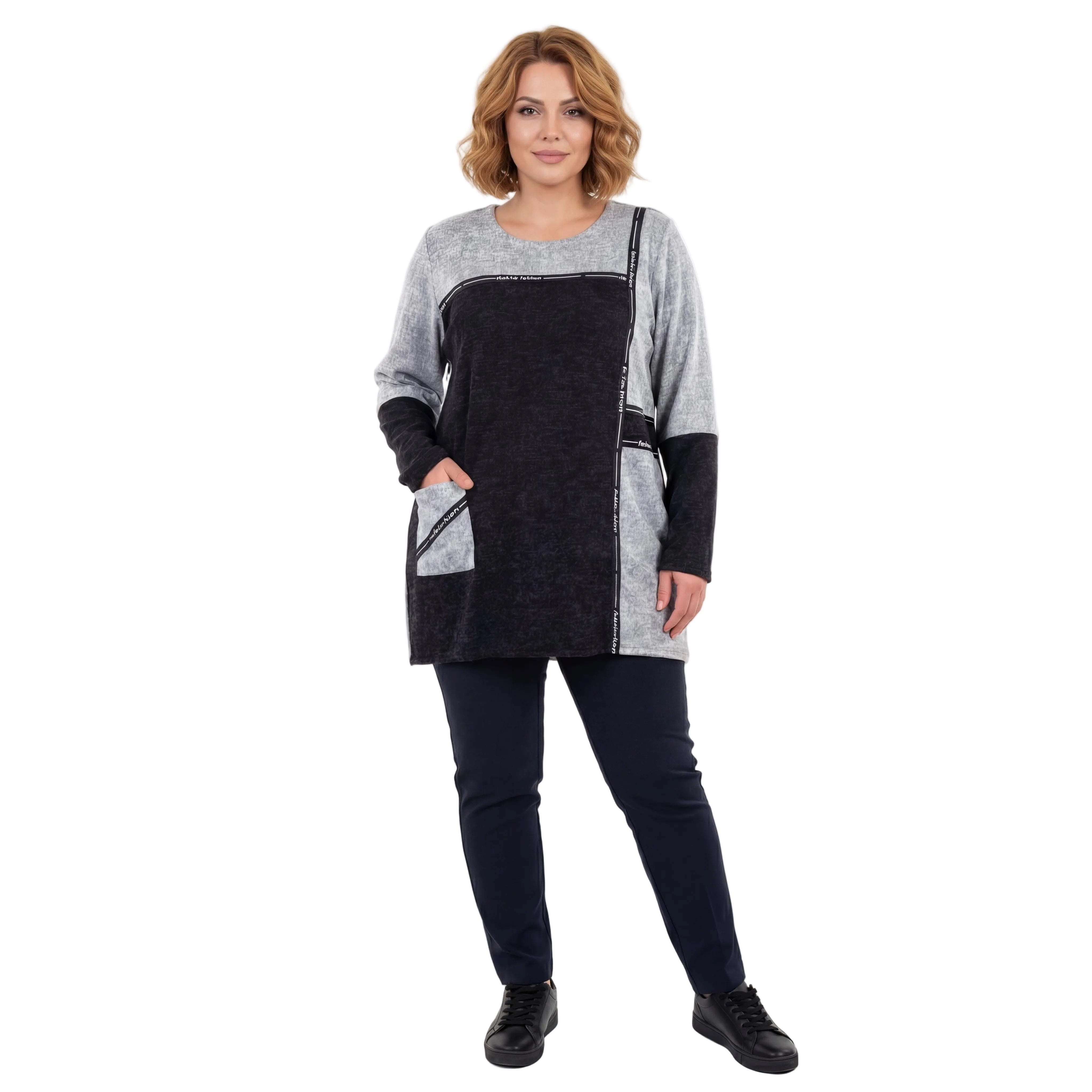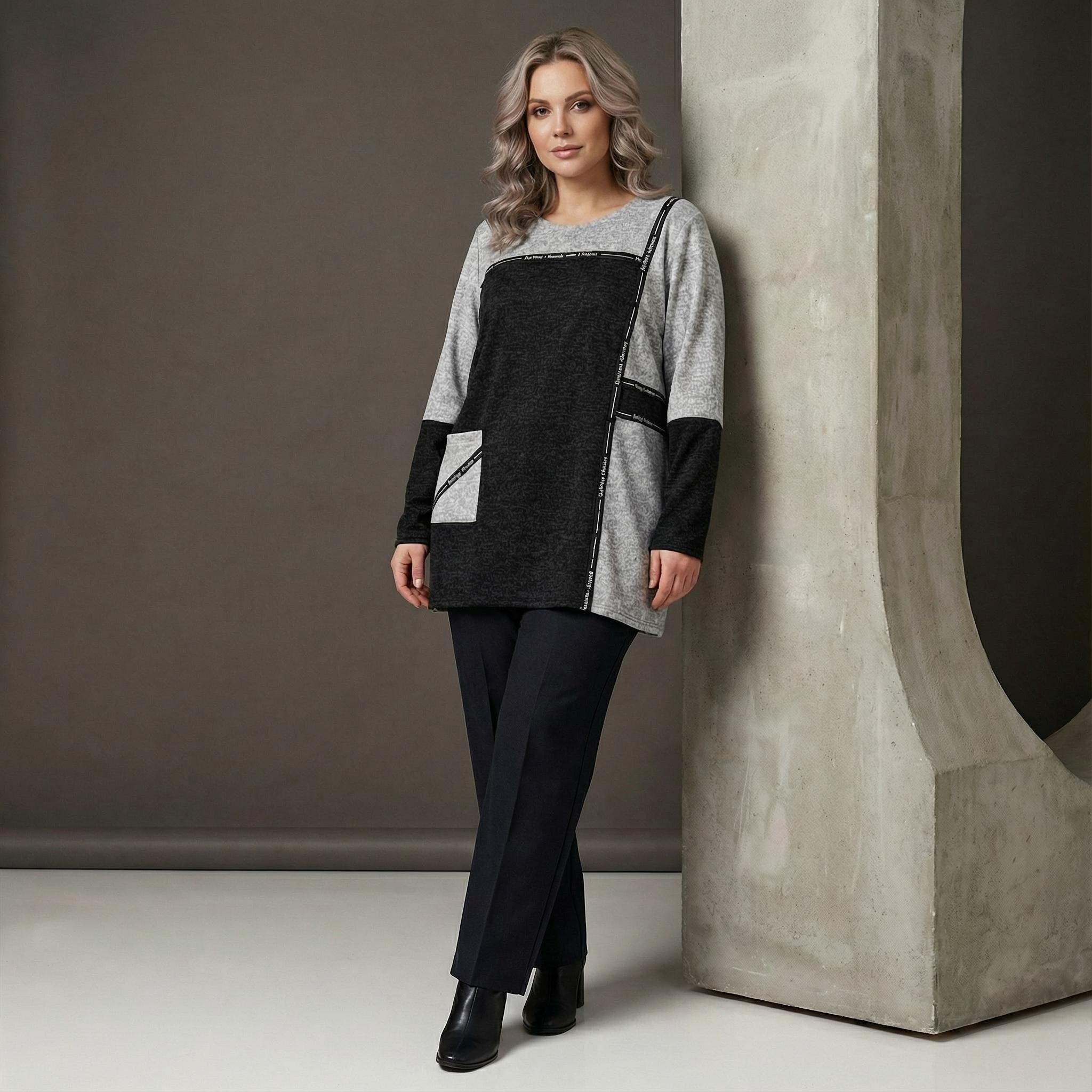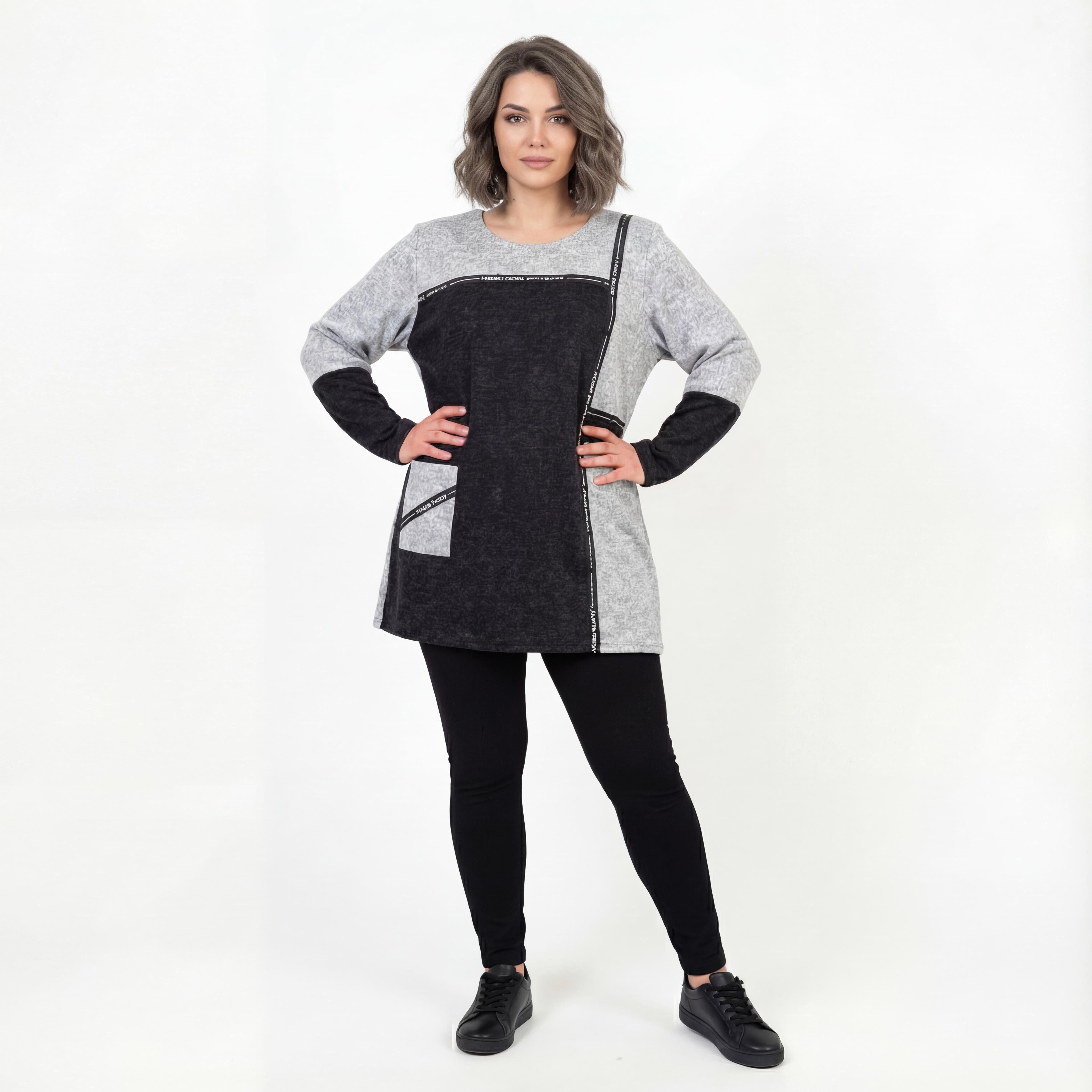 Открийте перфектния баланс между модерен градски стил и безкомпромисен комфорт с нашата нова туника от вискоза. Създадена специално за извивките на българската жена, тази дреха превръща ежедневието в удоволствие. Ефектният двуцветен дизайн в меланжирано сиво и наситено черно не само изглежда актуално, но и визуално оформя силуета, придавайки елегантност на визията. Меката и плътна трикотажна материя гали кожата и пада тежко, осигурявайки необходимата топлина през есенно-зимния сезон. Декоративната лента с надпис добавя свеж, младежки акцент, превръщайки тази туника в любим избор за разходка, среща с приятелки или уютен ден в офиса. Чувствайте се уверена, стилна и свободна.