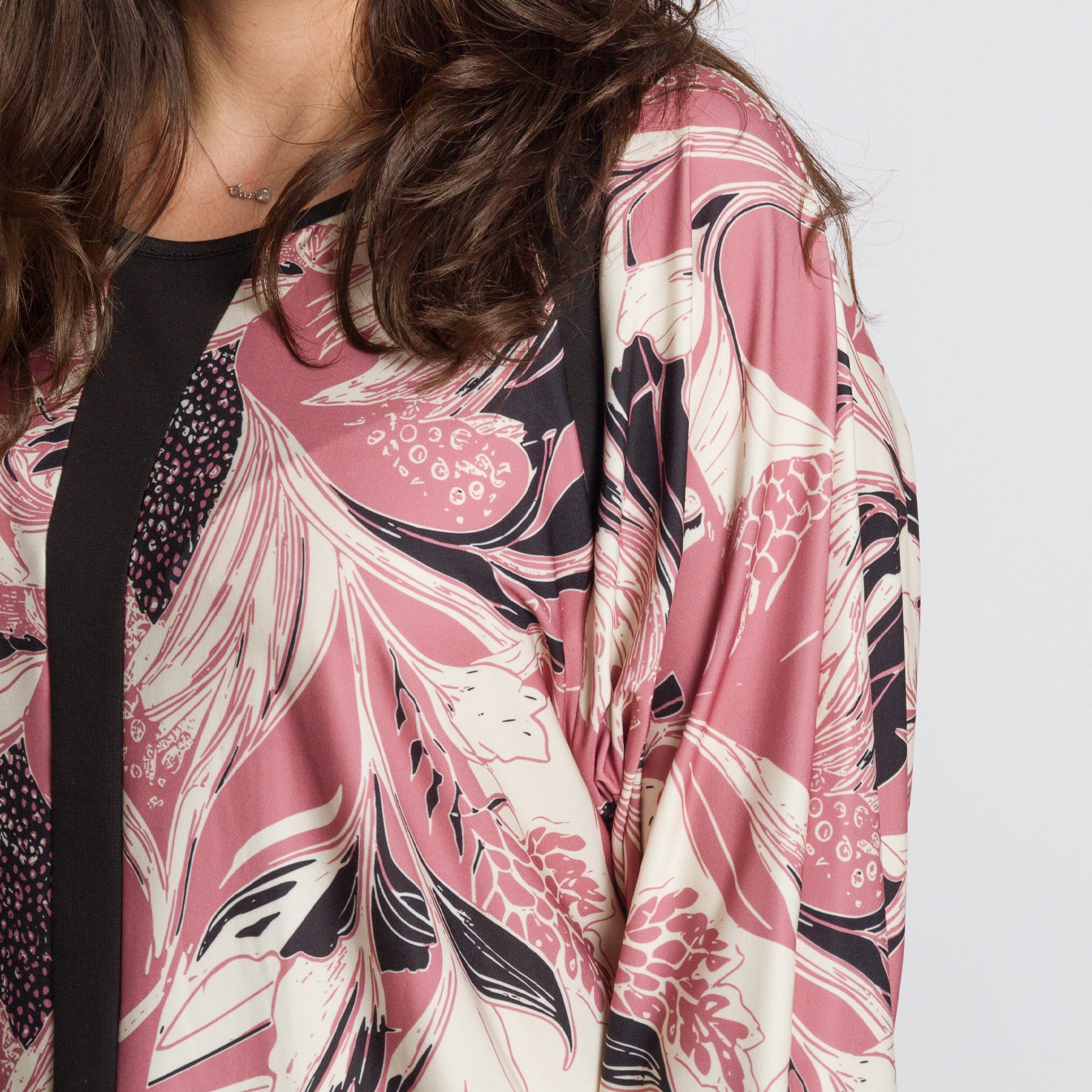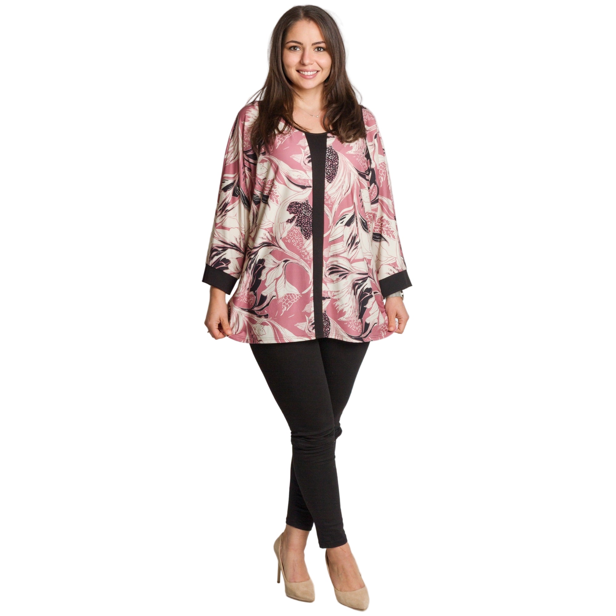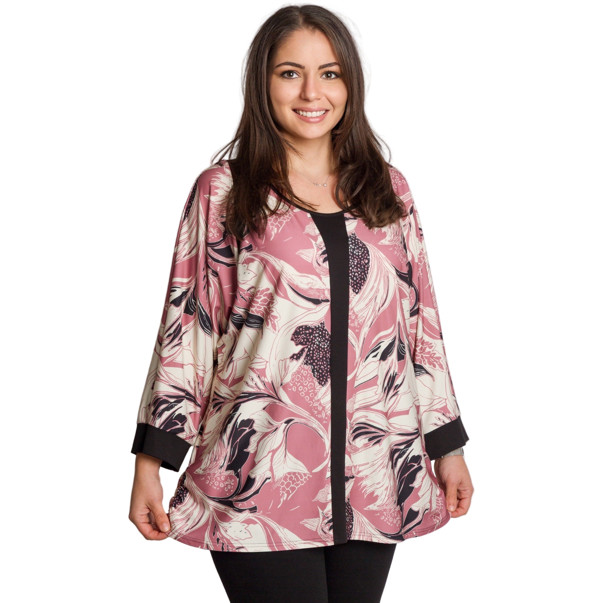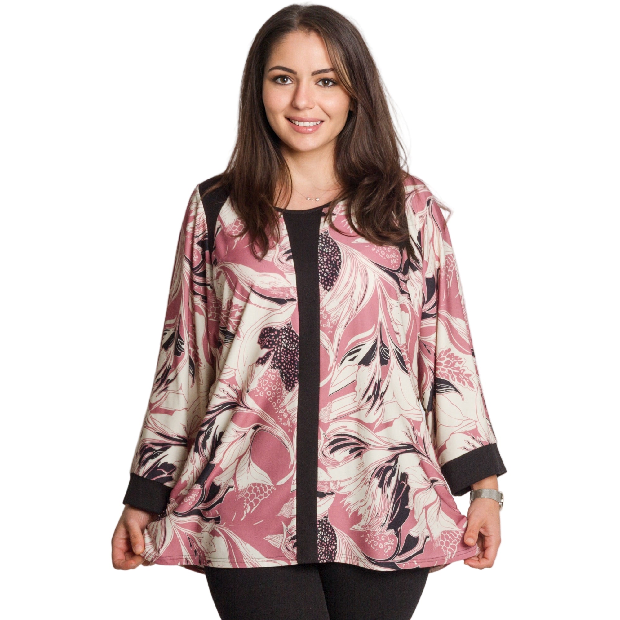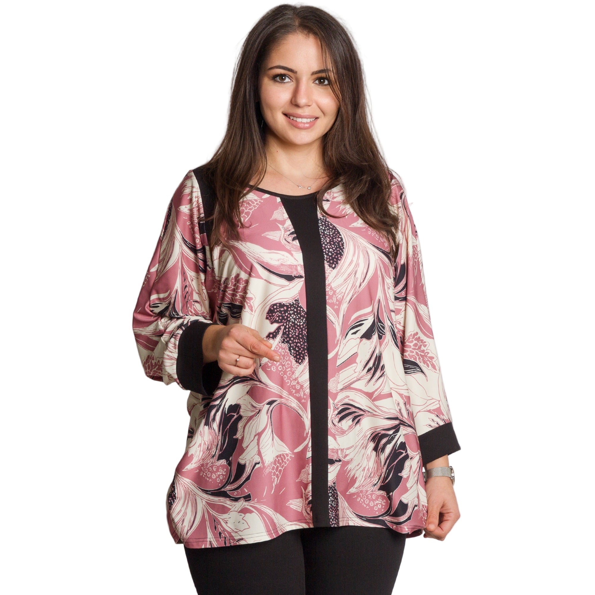 Radiază încredere și stil cu această tunică elegantă, special concepută pentru doamnele cu forme voluptuoase. Modelul combină șifonul vaporos cu un maiou cusut, care oferă confort și opacitate maxime. Croiul lejer și mânecile 3/4 adaugă feminitate și lejeritate, în timp ce imprimeul floral izbitor în roșu intens pe o bază neagră creează un aspect superb, potrivit pentru ocazii formale, sărbători și momente speciale.