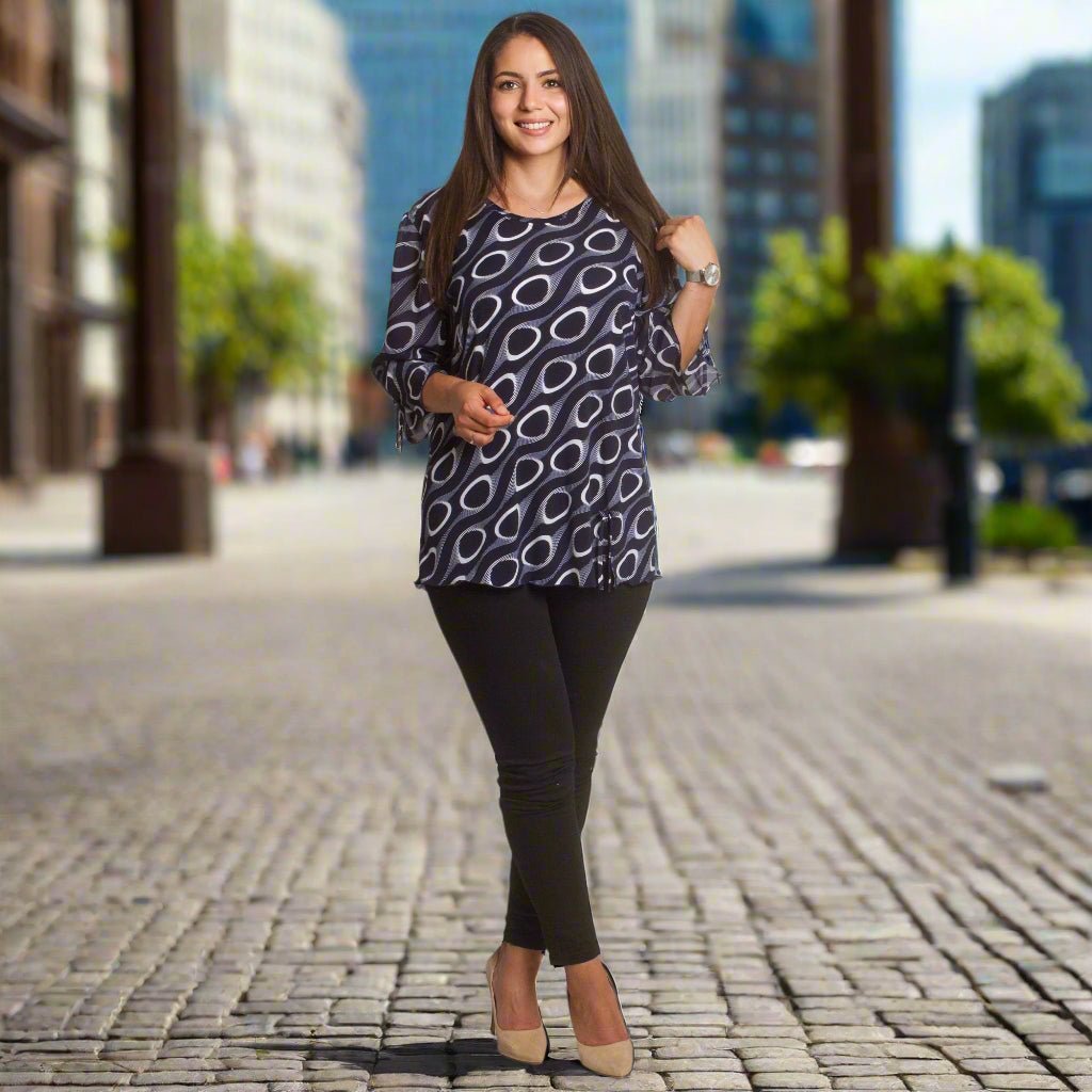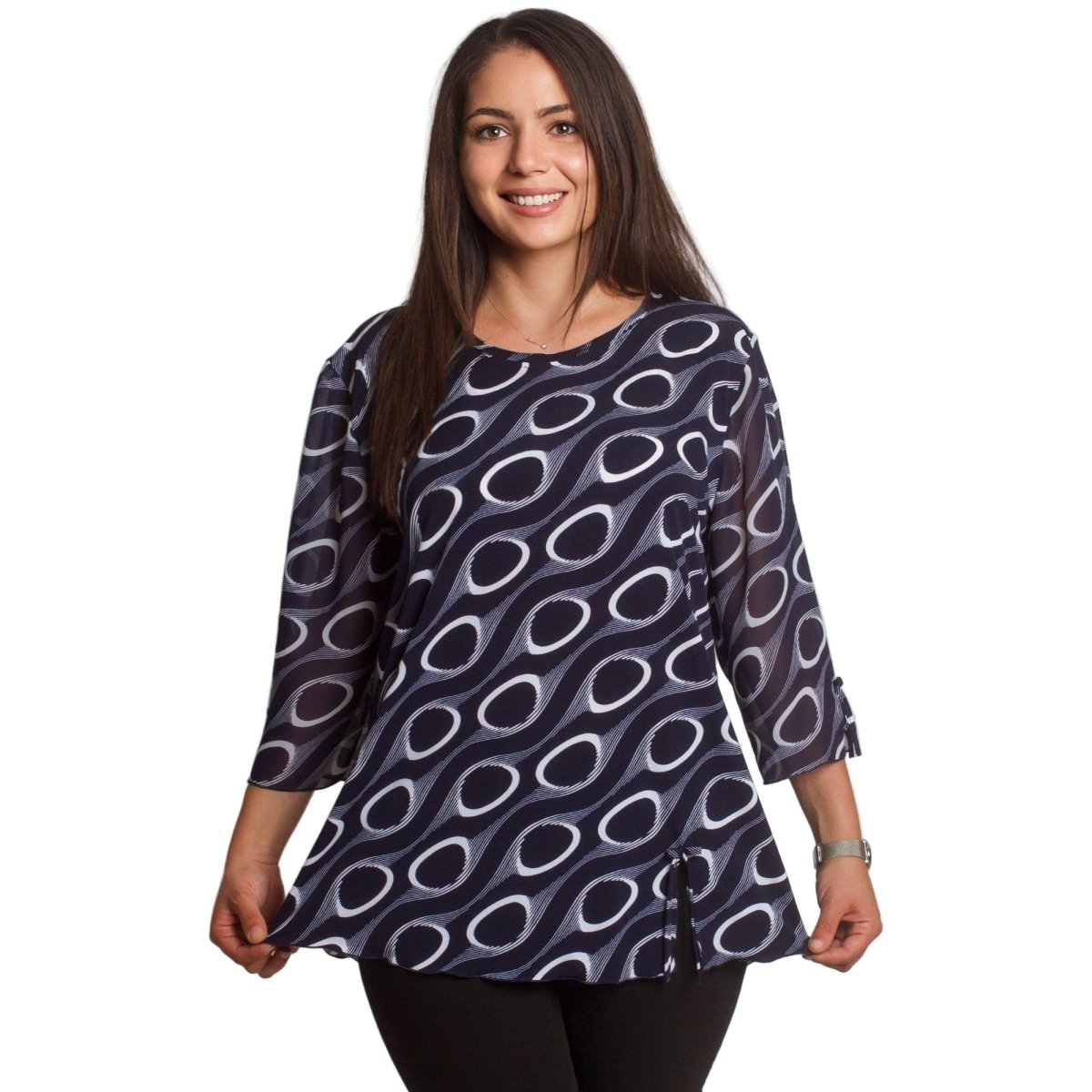 Radiază încredere și stil cu această tunică elegantă, special concepută pentru doamnele cu forme voluptuoase. Modelul combină șifonul vaporos cu un maiou cusut, care oferă confort și opacitate maxime. Croiul lejer și mânecile 3/4 adaugă feminitate și lejeritate, în timp ce imprimeul floral izbitor în roșu intens pe o bază neagră creează un aspect superb, potrivit pentru ocazii formale, sărbători și momente speciale.
