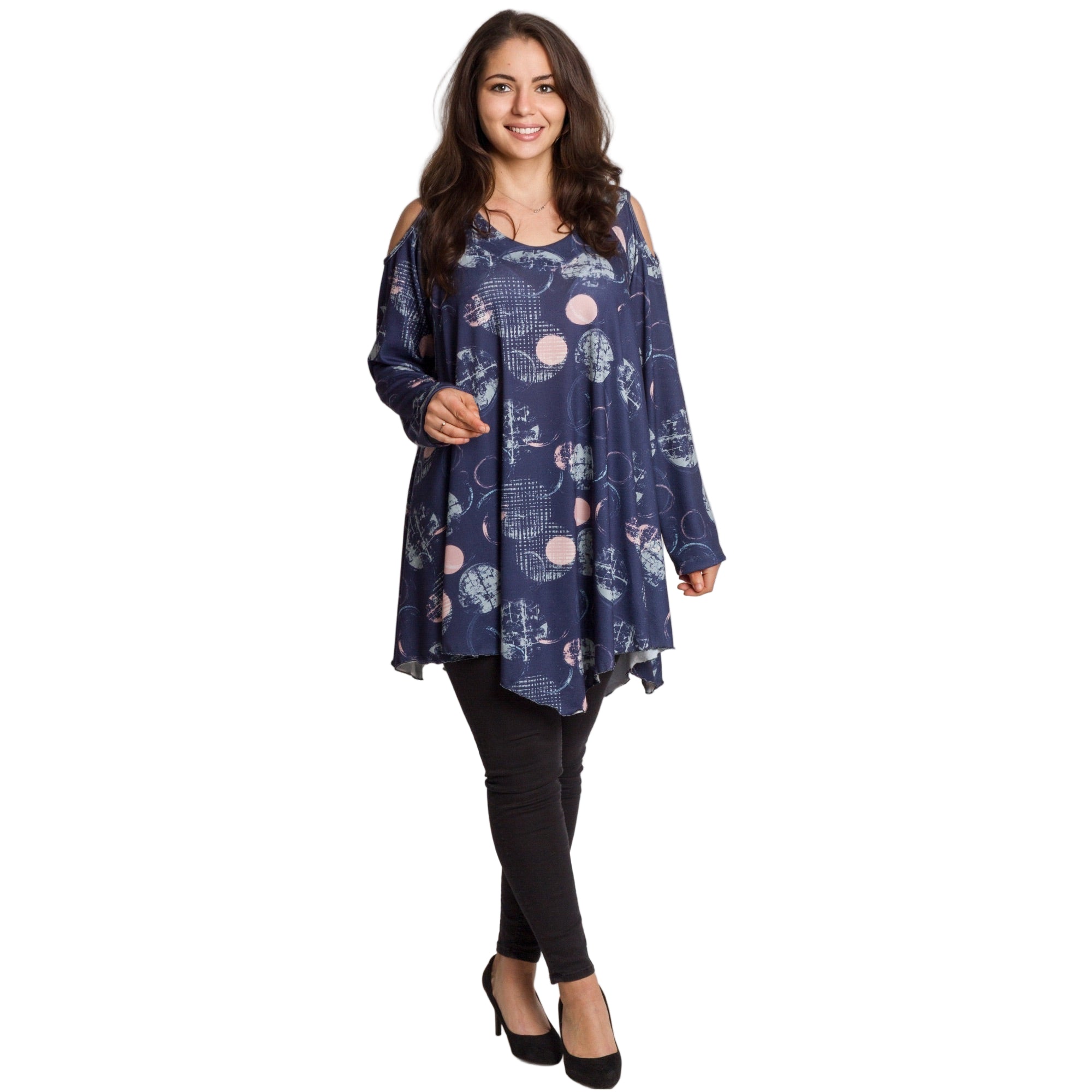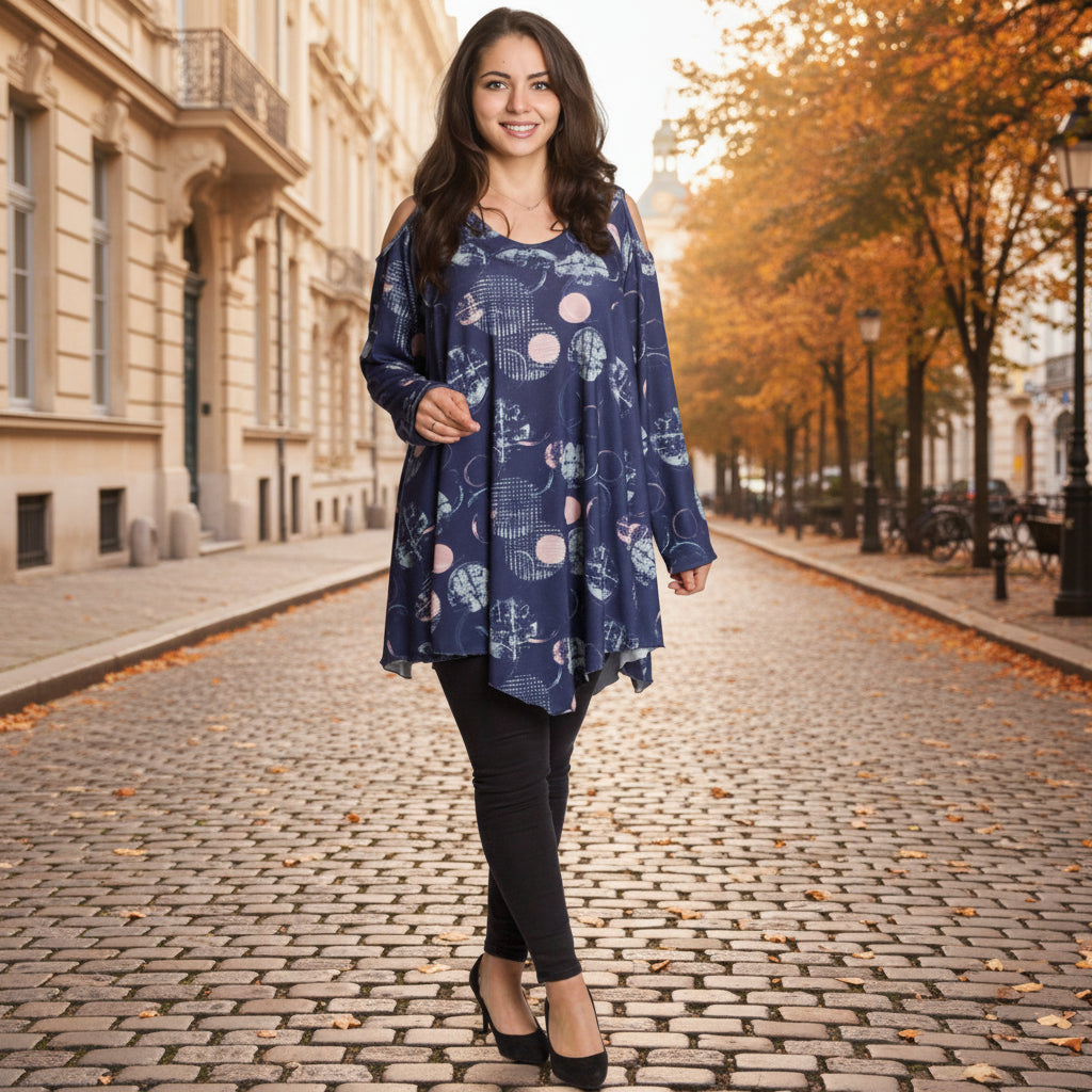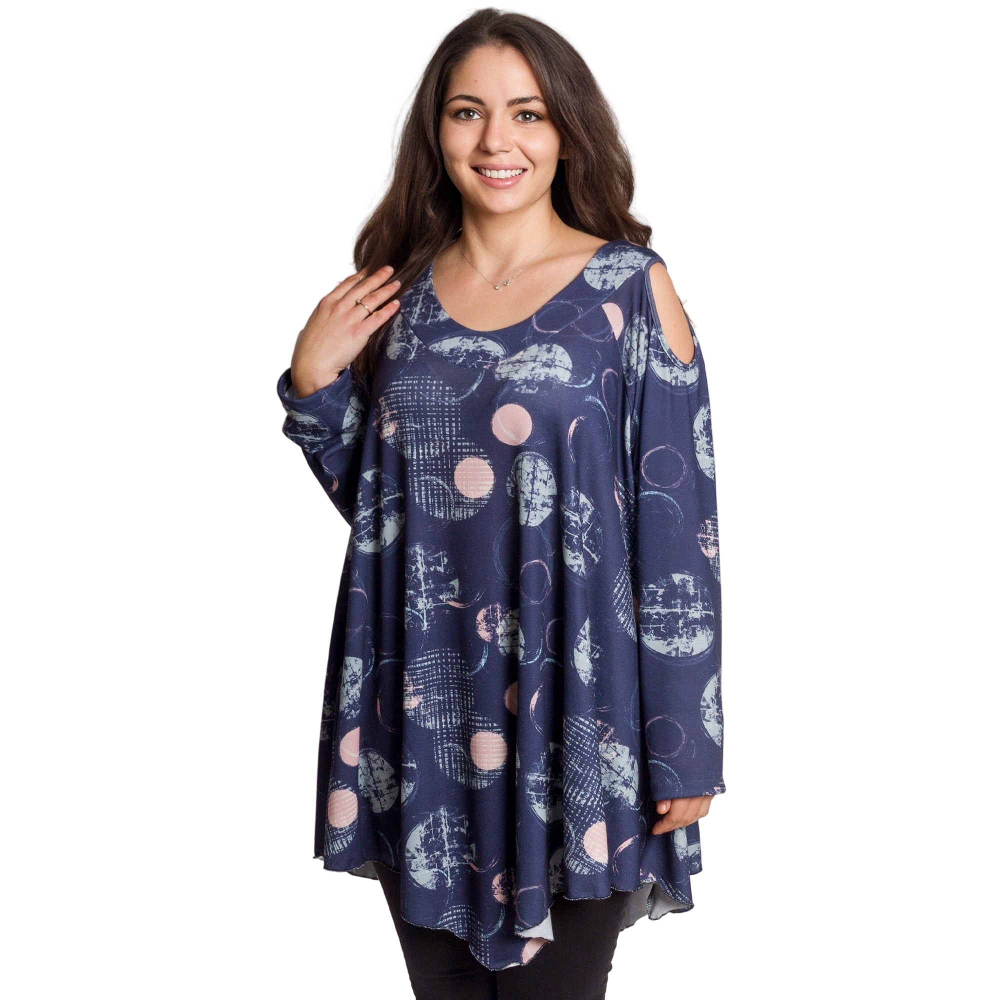 Adaugă culoare și eleganță ținutei tale cu această tunică lejeră în mărimi maxi. Modelul prezintă un imprimeu superb în tonuri bogate de verde și albastru, completat de un accent diagonal albastru închis din țesătură satinată, care adaugă rafinament și alungește vizual silueta. Croiul este lejer și confortabil, cu decolteu rotund și mâneci scurte - o alegere ideală atât pentru ocazii de zi cu zi, cât și pentru ocazii mai formale.