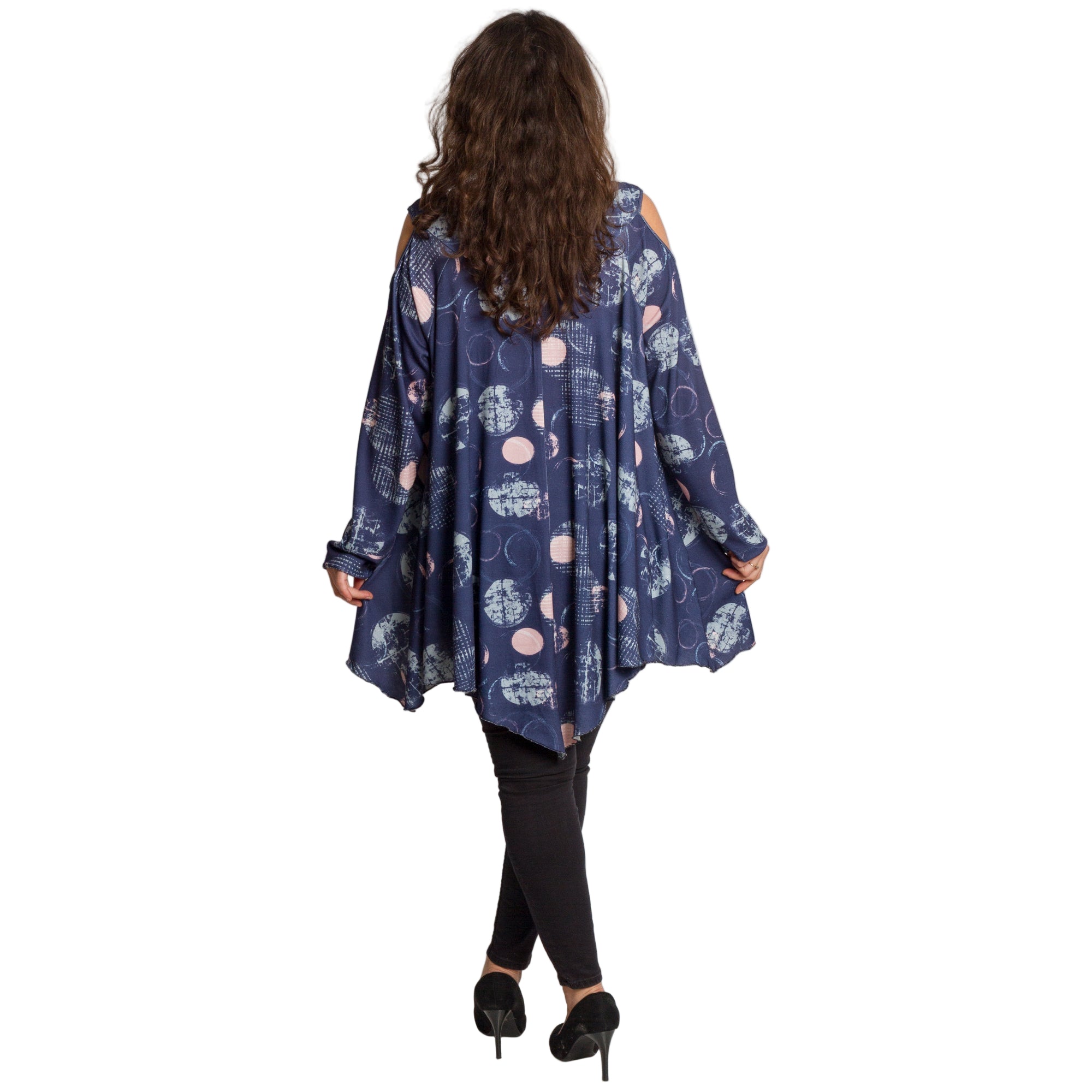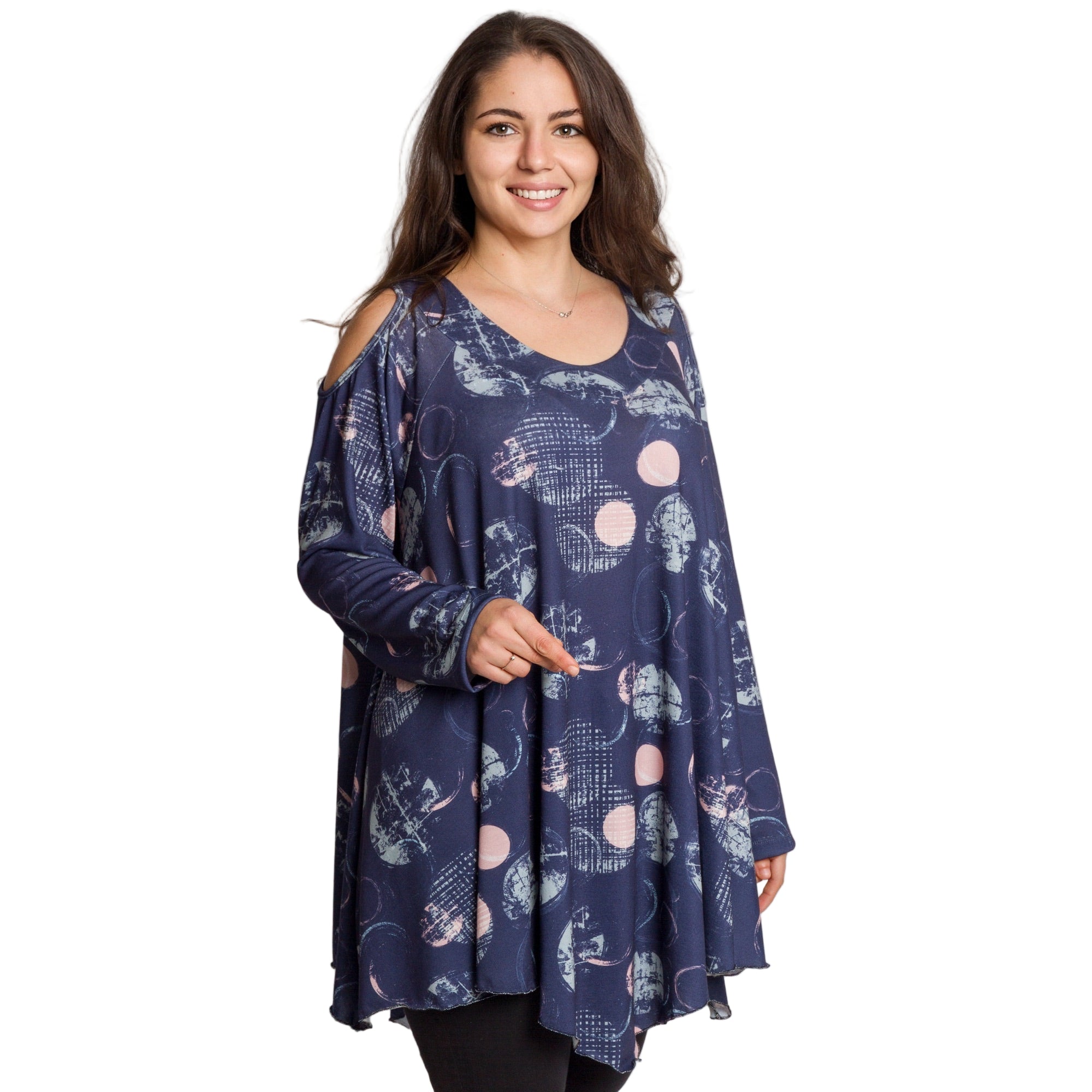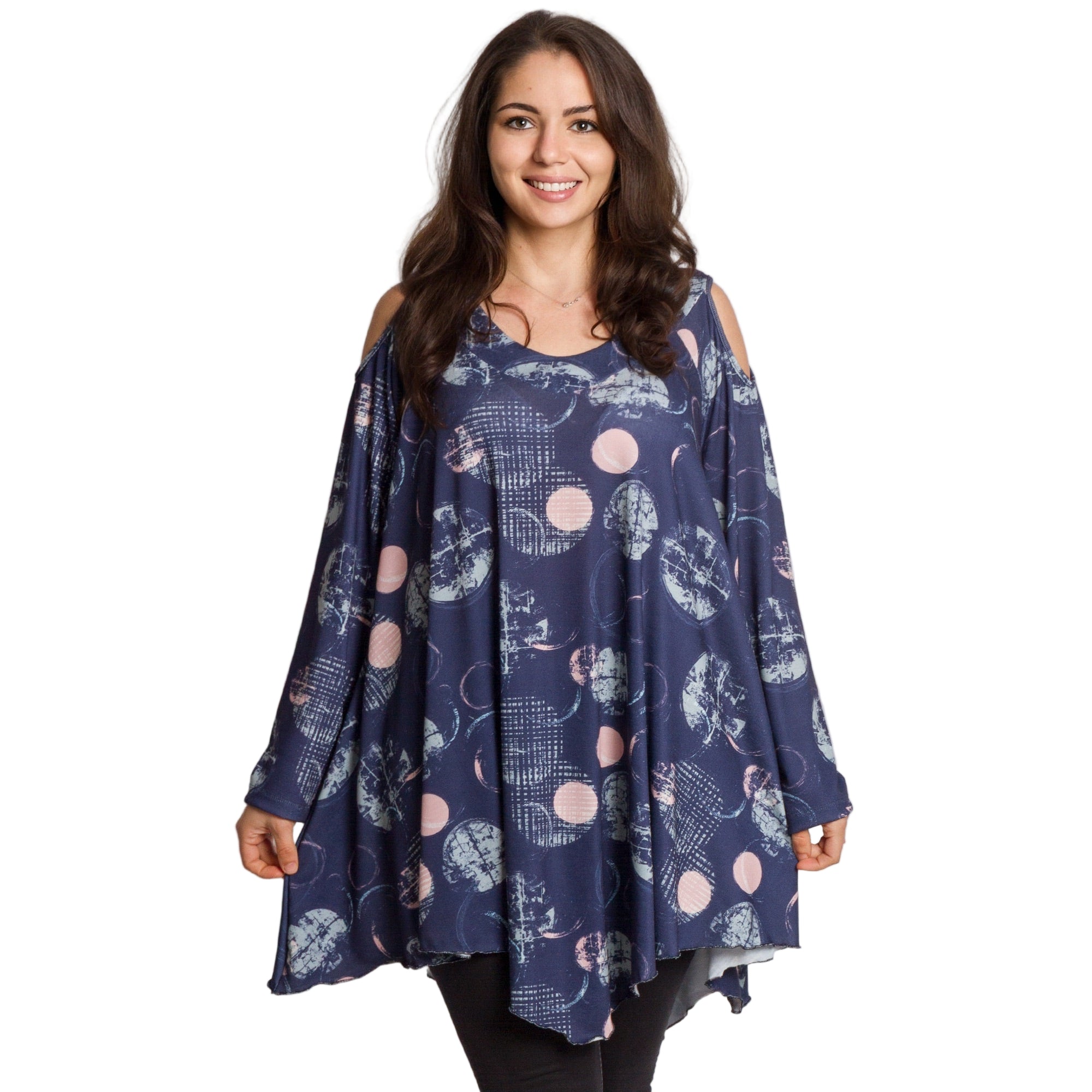 Adaugă culoare și eleganță ținutei tale cu această tunică lejeră în mărimi maxi. Modelul prezintă un imprimeu superb în tonuri bogate de verde și albastru, completat de un accent diagonal albastru închis din țesătură satinată, care adaugă rafinament și alungește vizual silueta. Croiul este lejer și confortabil, cu decolteu rotund și mâneci scurte - o alegere ideală atât pentru ocazii de zi cu zi, cât și pentru ocazii mai formale.