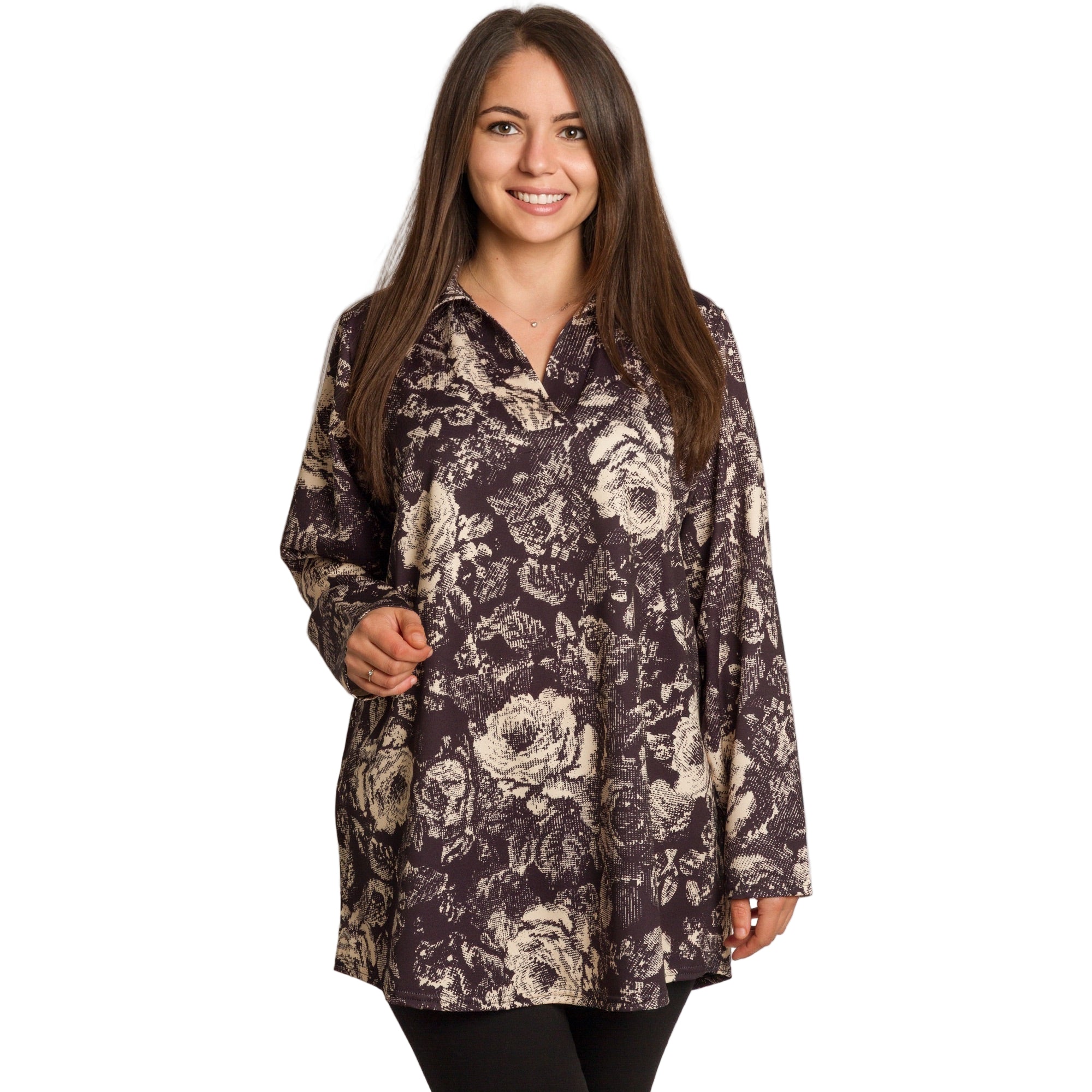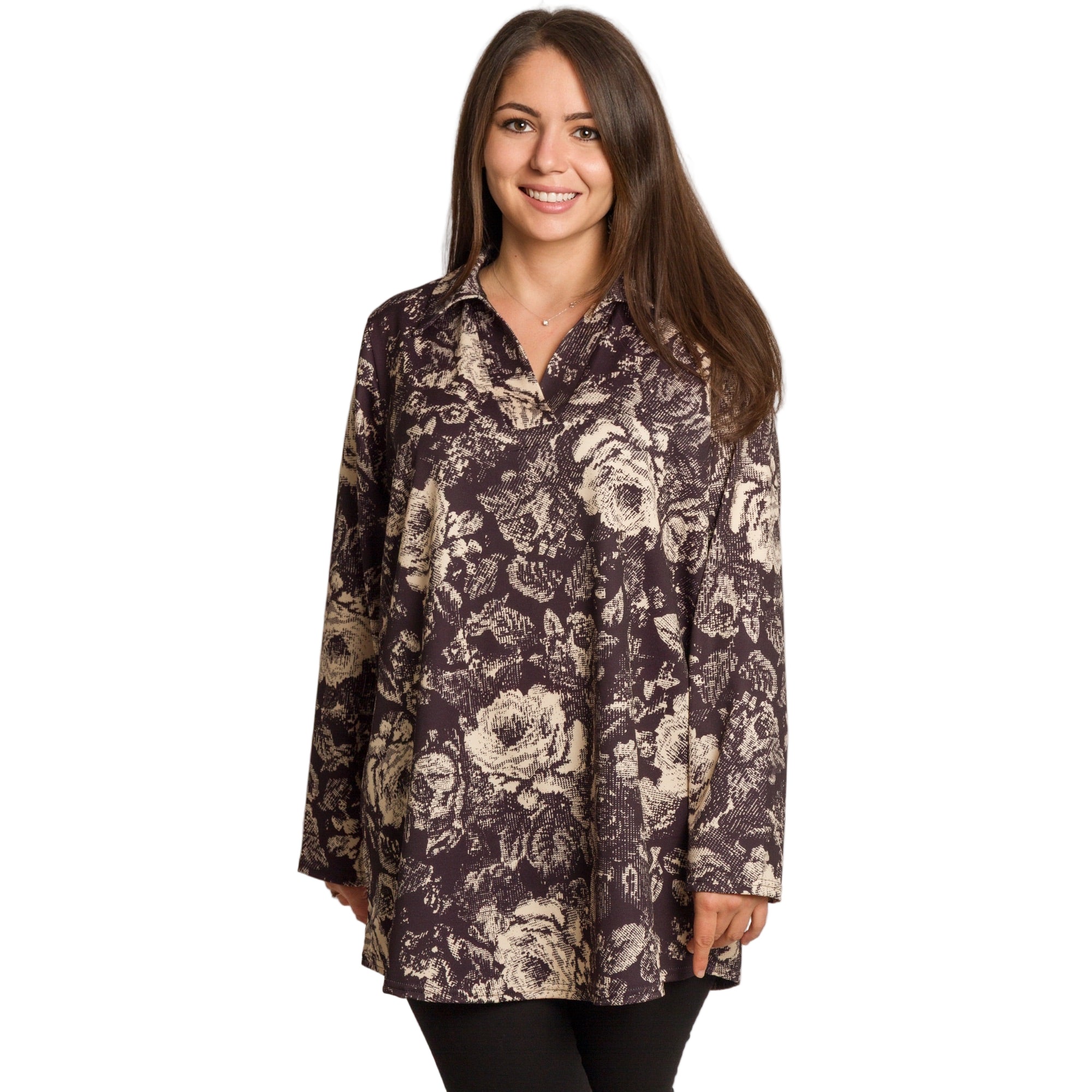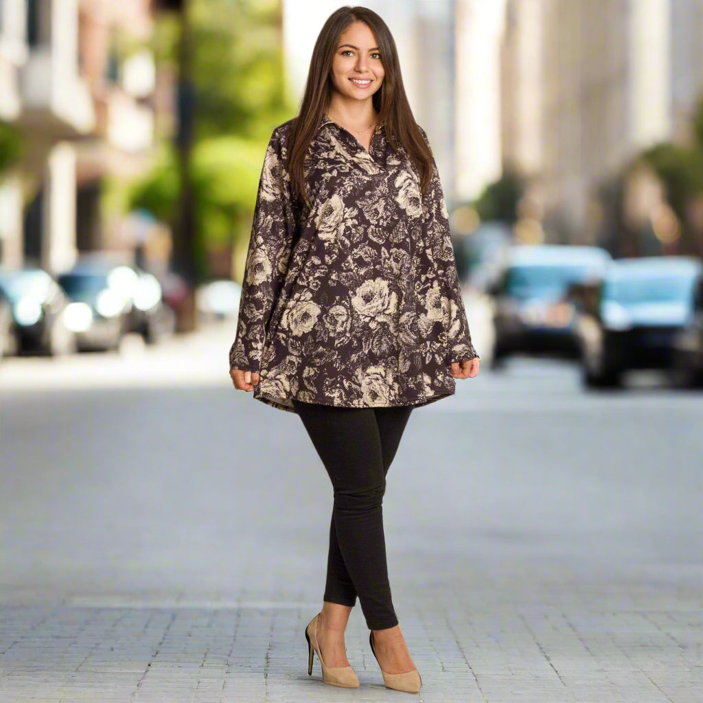 Radiază încredere și stil cu această tunică elegantă, special concepută pentru doamnele cu forme voluptuoase. Modelul combină șifonul vaporos cu un maiou cusut, care oferă confort și opacitate maxime. Croiul lejer și mânecile 3/4 adaugă feminitate și lejeritate, în timp ce imprimeul floral izbitor în roșu intens pe o bază neagră creează un aspect superb, potrivit pentru ocazii formale, sărbători și momente speciale.