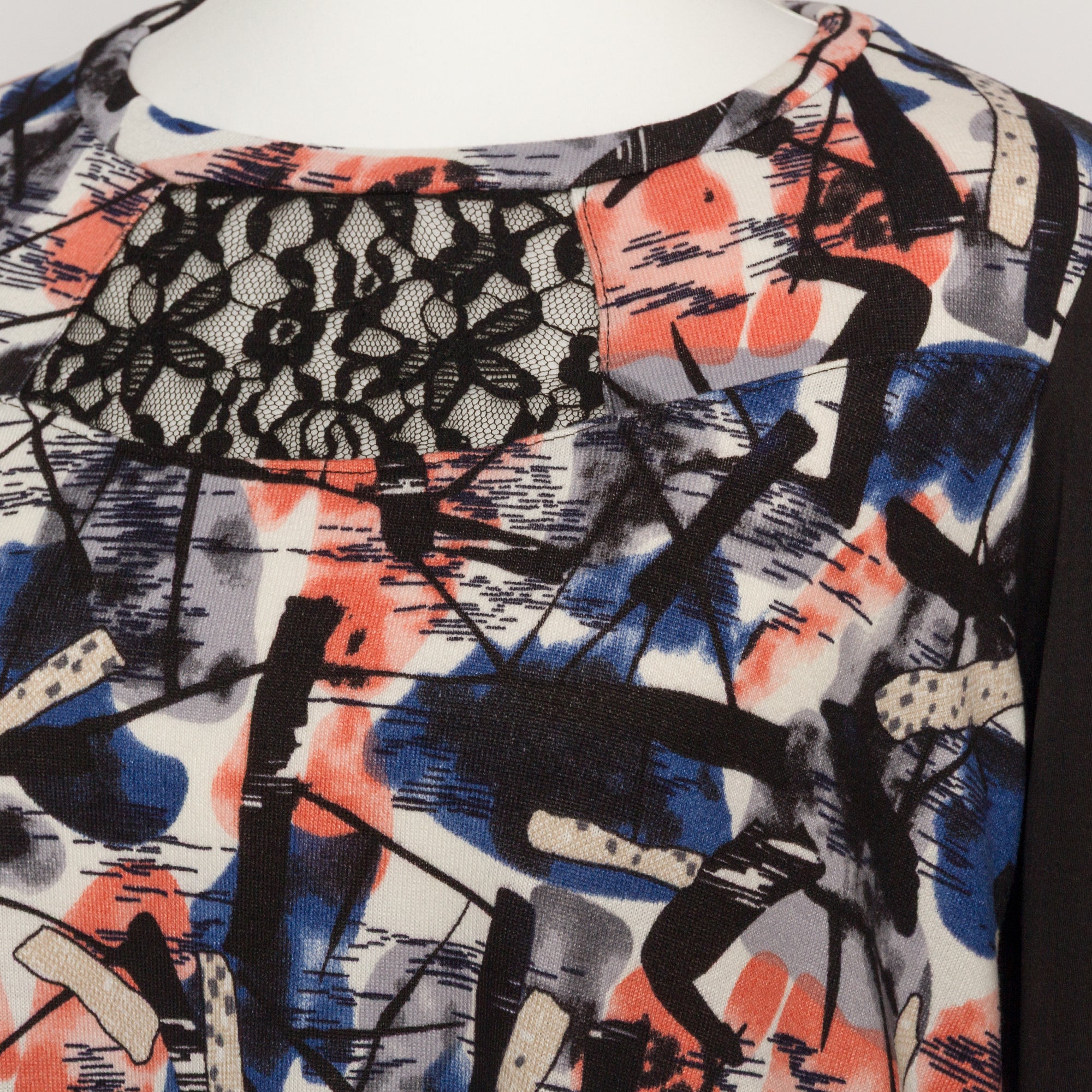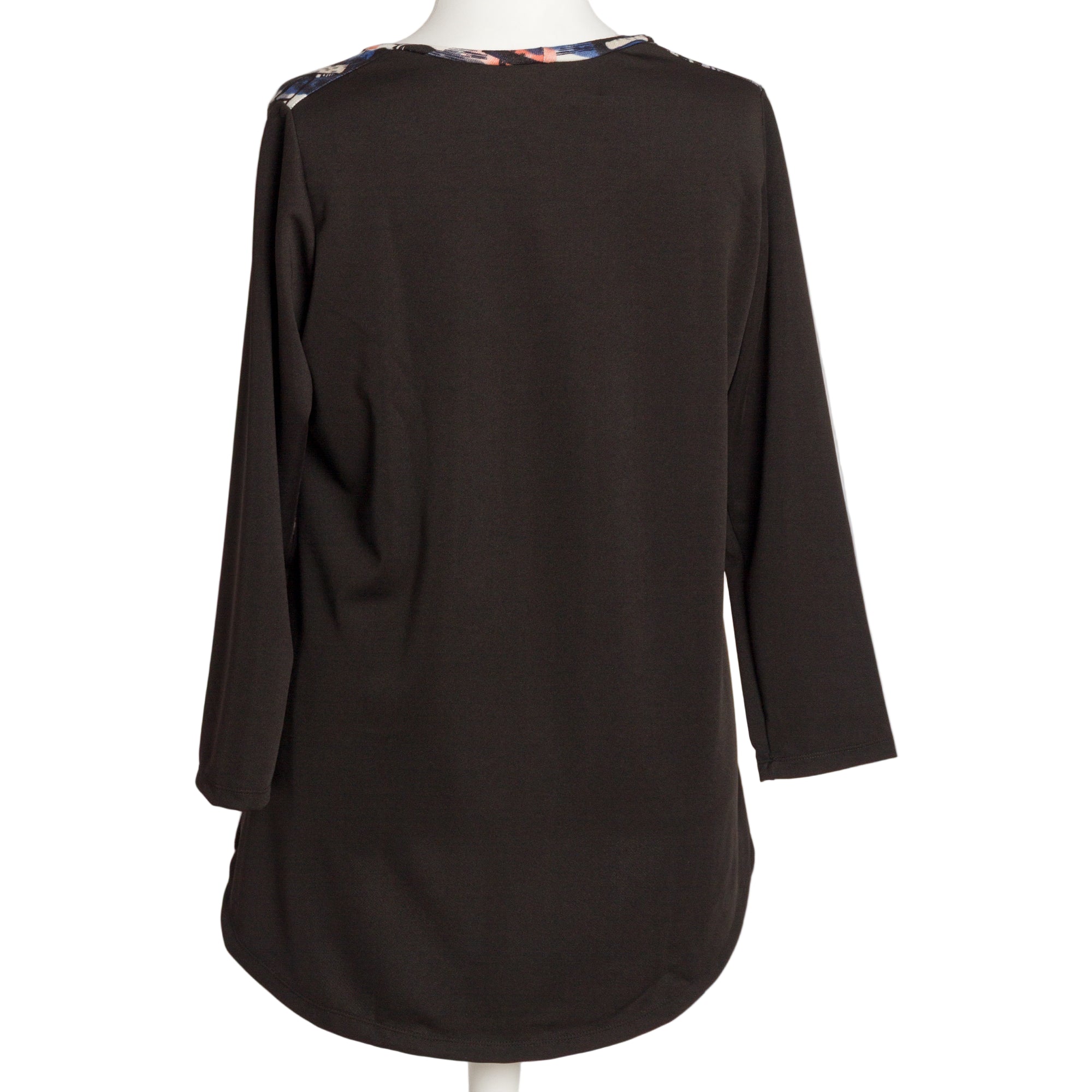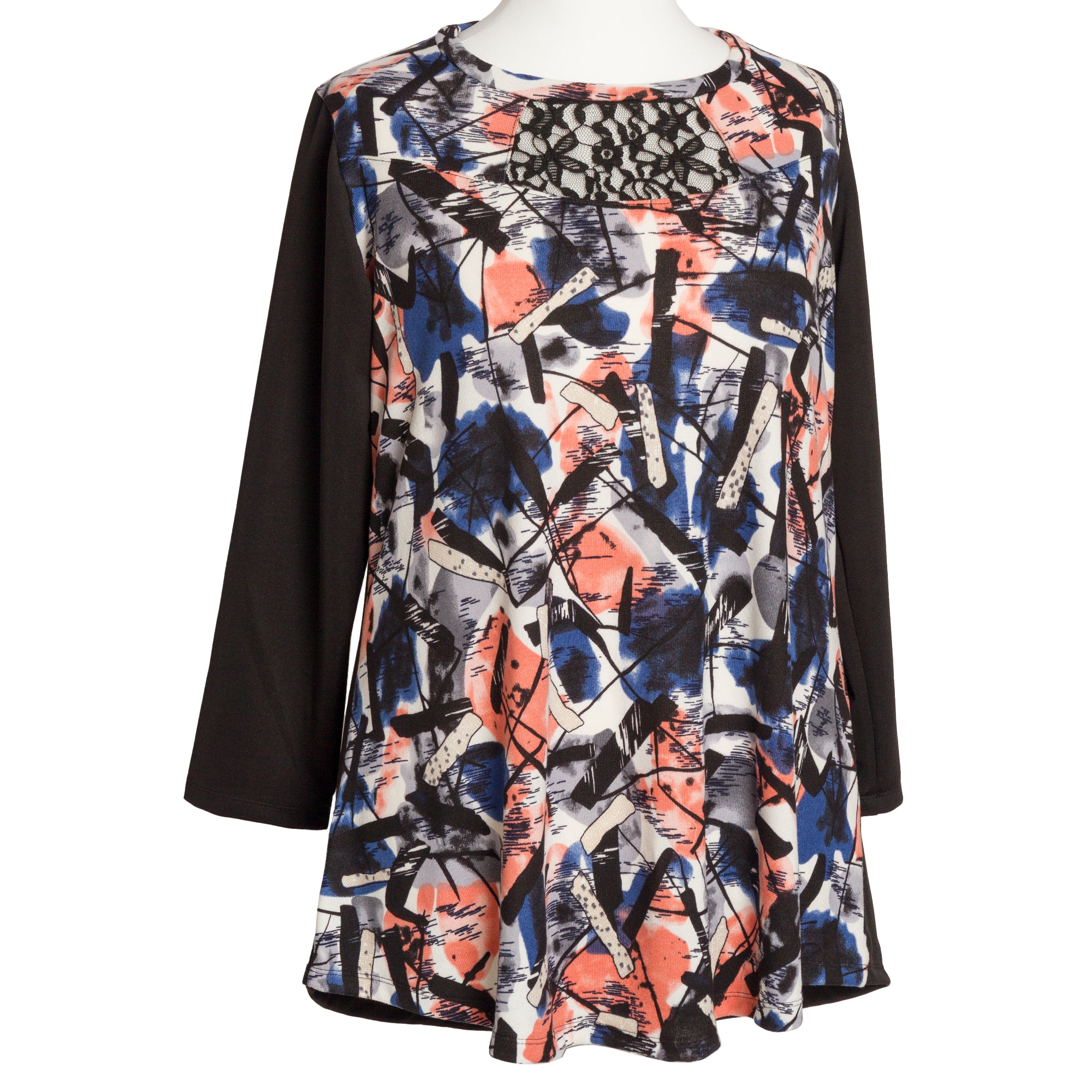 Adaugă culoare și eleganță ținutei tale cu această tunică lejeră în mărimi maxi. Modelul prezintă un imprimeu superb în tonuri bogate de verde și albastru, completat de un accent diagonal albastru închis din țesătură satinată, care adaugă rafinament și alungește vizual silueta. Croiul este lejer și confortabil, cu decolteu rotund și mâneci scurte - o alegere ideală atât pentru ocazii de zi cu zi, cât și pentru ocazii mai formale.