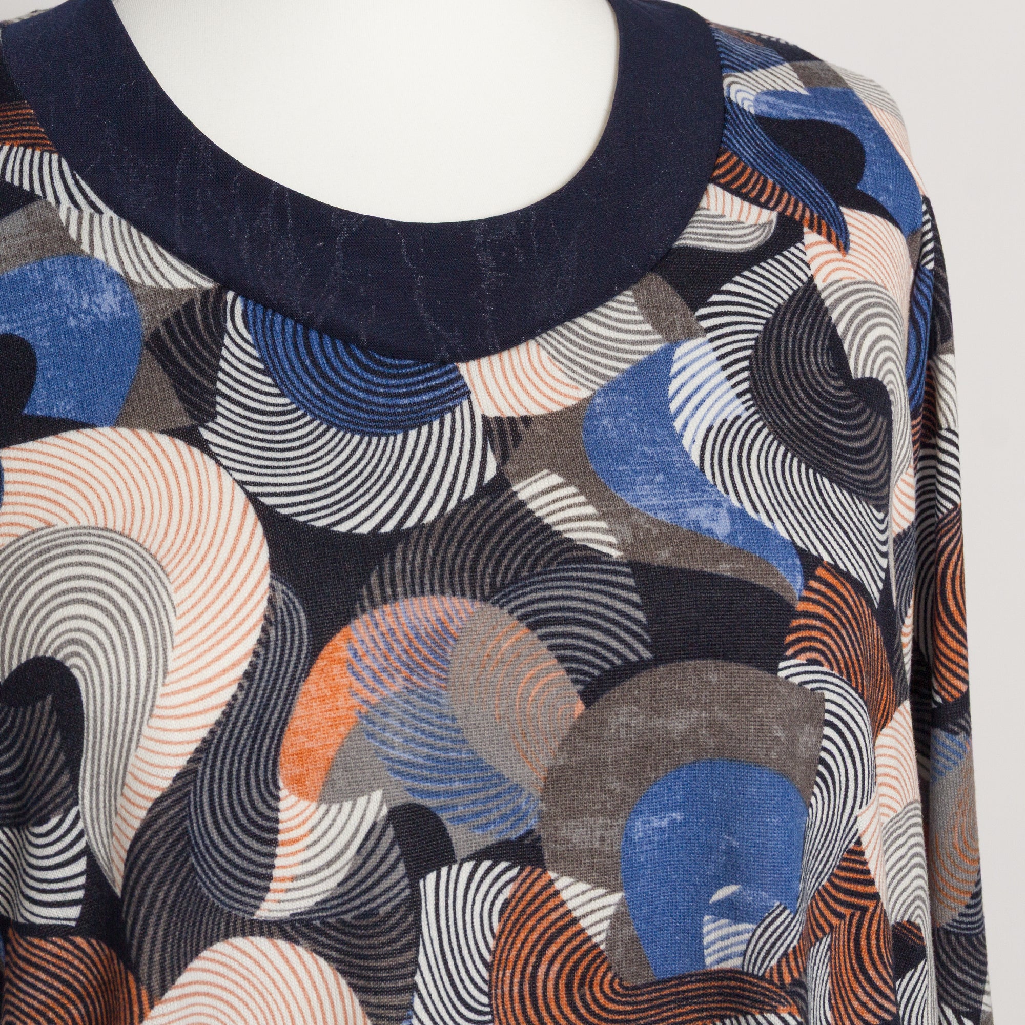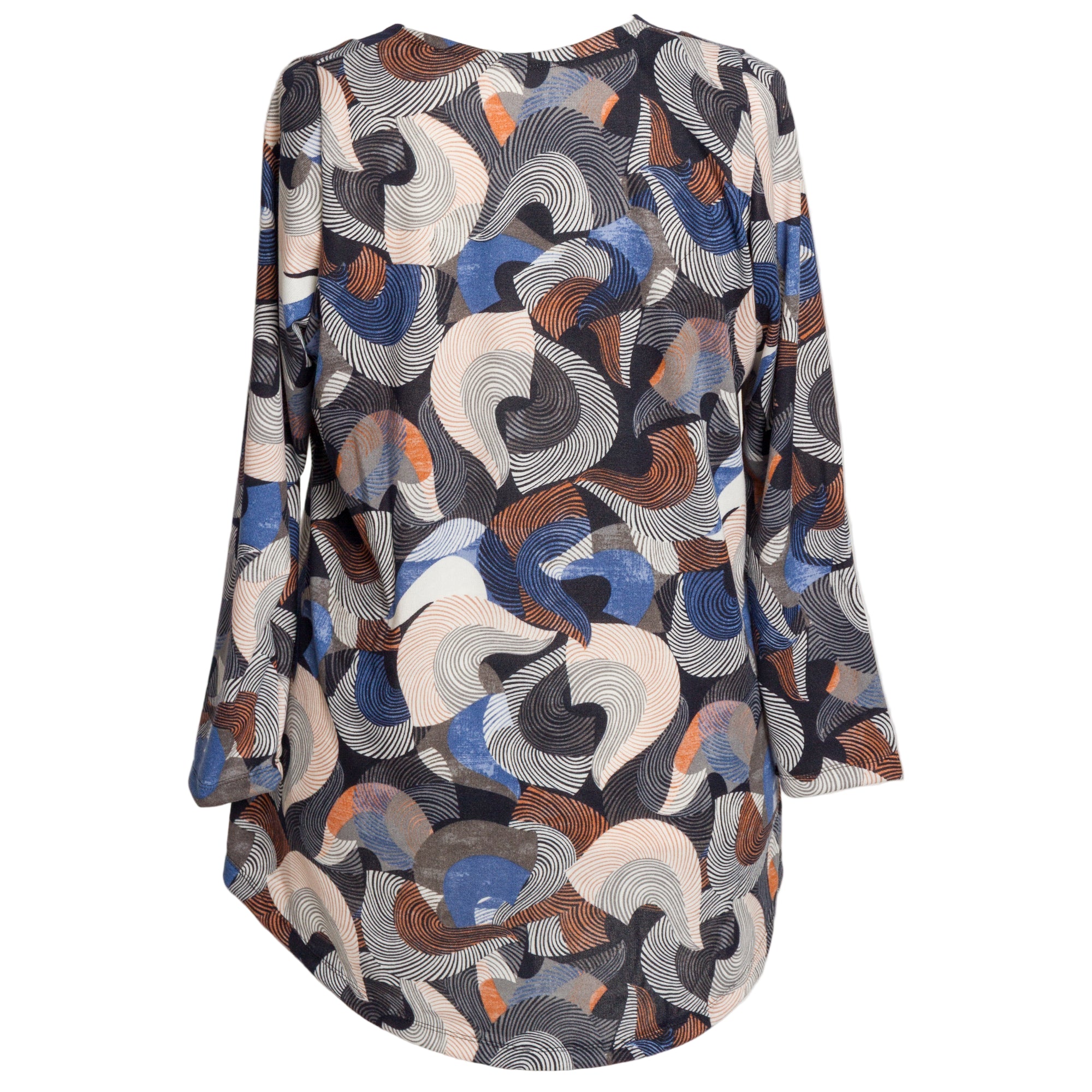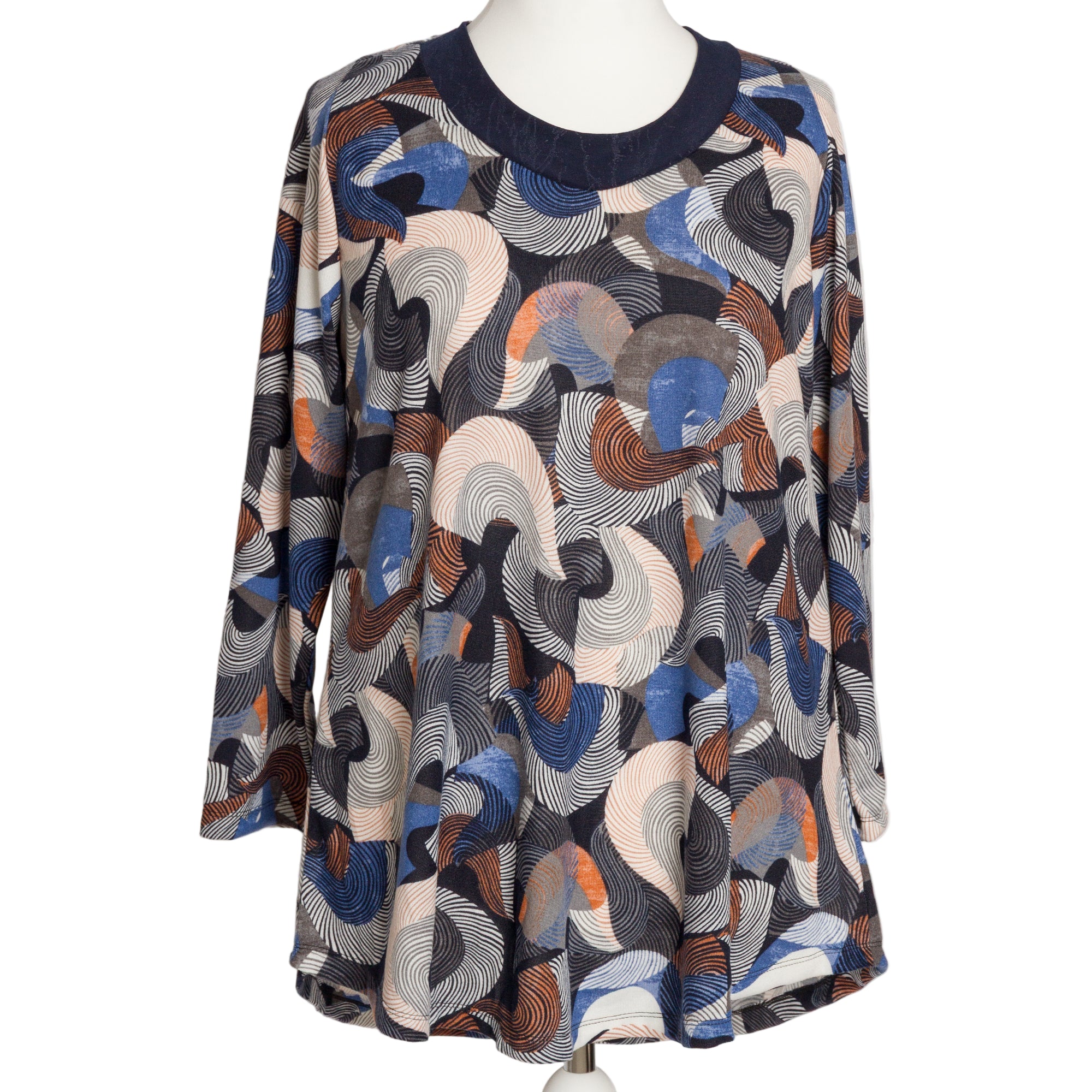 Adaugă culoare și eleganță ținutei tale cu această tunică lejeră în mărimi maxi. Modelul prezintă un imprimeu superb în tonuri bogate de verde și albastru, completat de un accent diagonal albastru închis din țesătură satinată, care adaugă rafinament și alungește vizual silueta. Croiul este lejer și confortabil, cu decolteu rotund și mâneci scurte - o alegere ideală atât pentru ocazii de zi cu zi, cât și pentru ocazii mai formale.