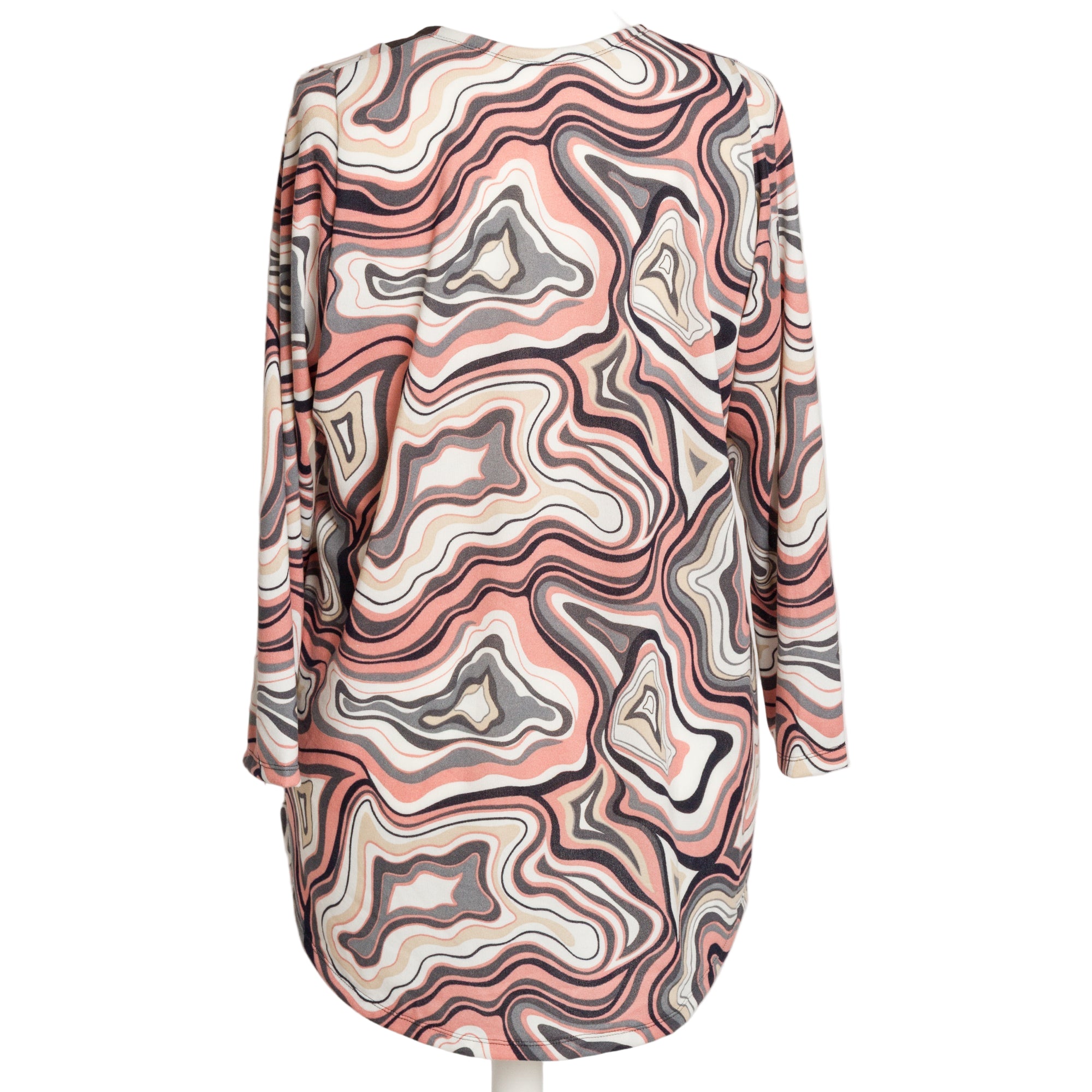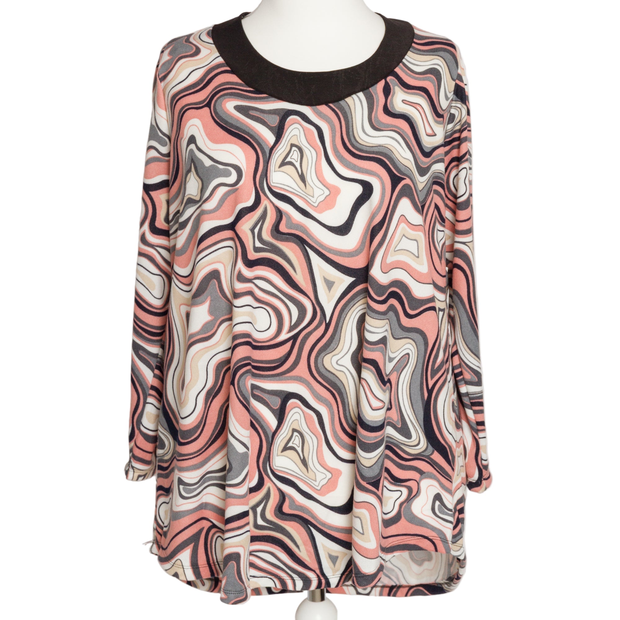 Adaugă culoare și eleganță ținutei tale cu această tunică lejeră în mărimi maxi. Modelul prezintă un imprimeu superb în tonuri bogate de verde și albastru, completat de un accent diagonal albastru închis din țesătură satinată, care adaugă rafinament și alungește vizual silueta. Croiul este lejer și confortabil, cu decolteu rotund și mâneci scurte - o alegere ideală atât pentru ocazii de zi cu zi, cât și pentru ocazii mai formale.